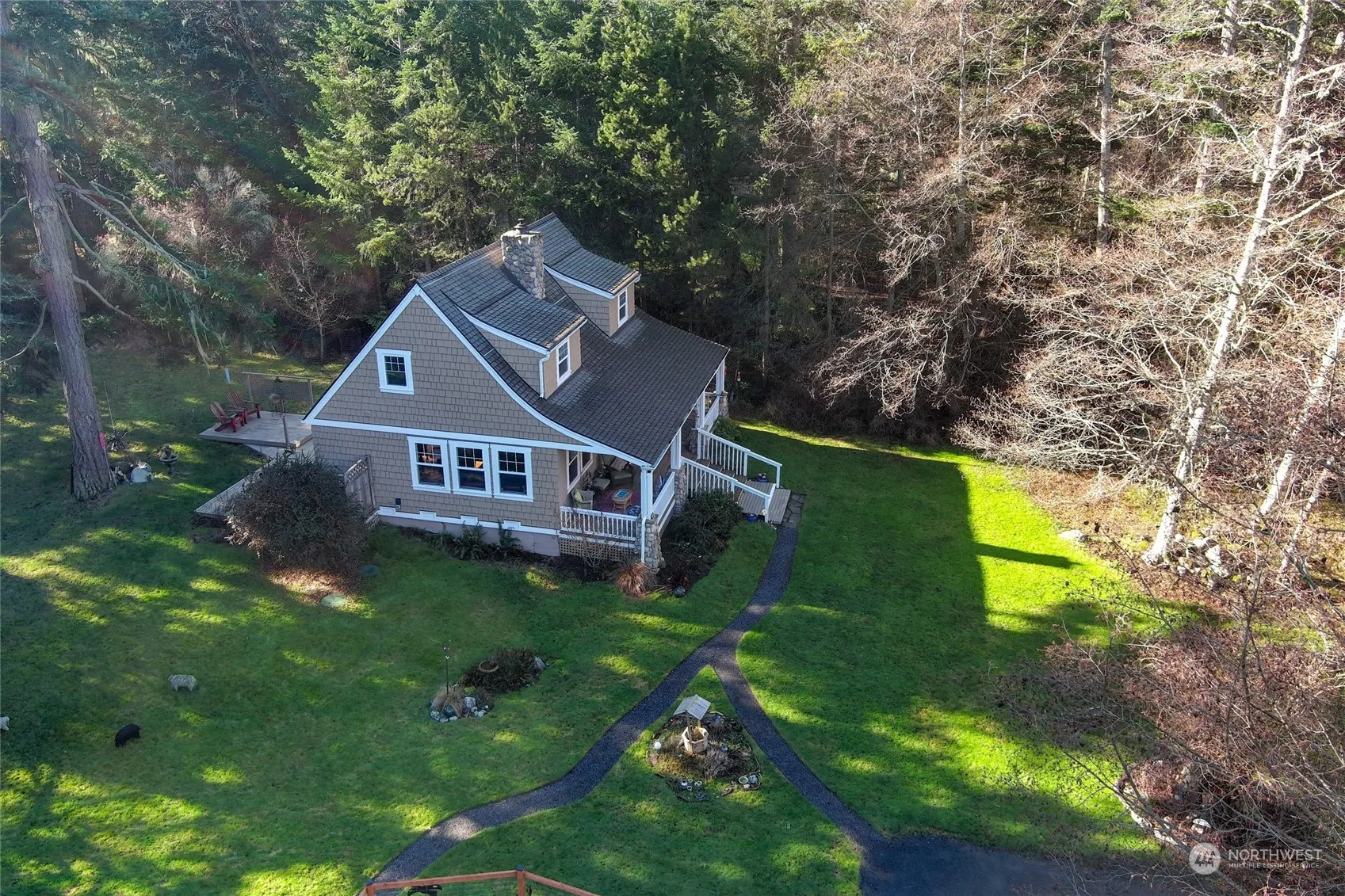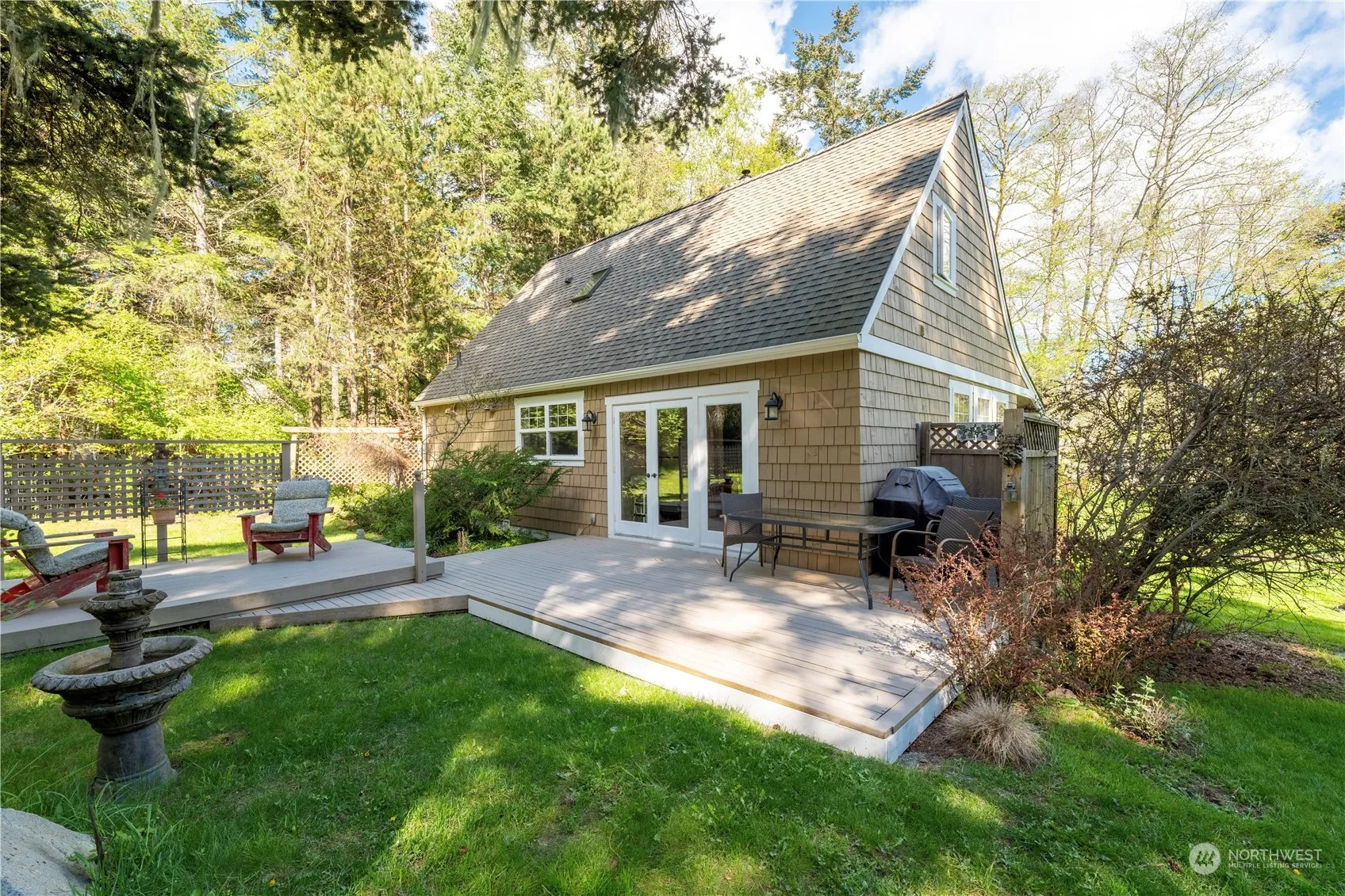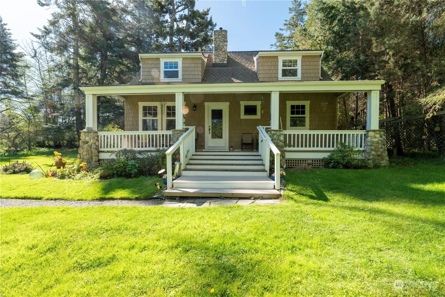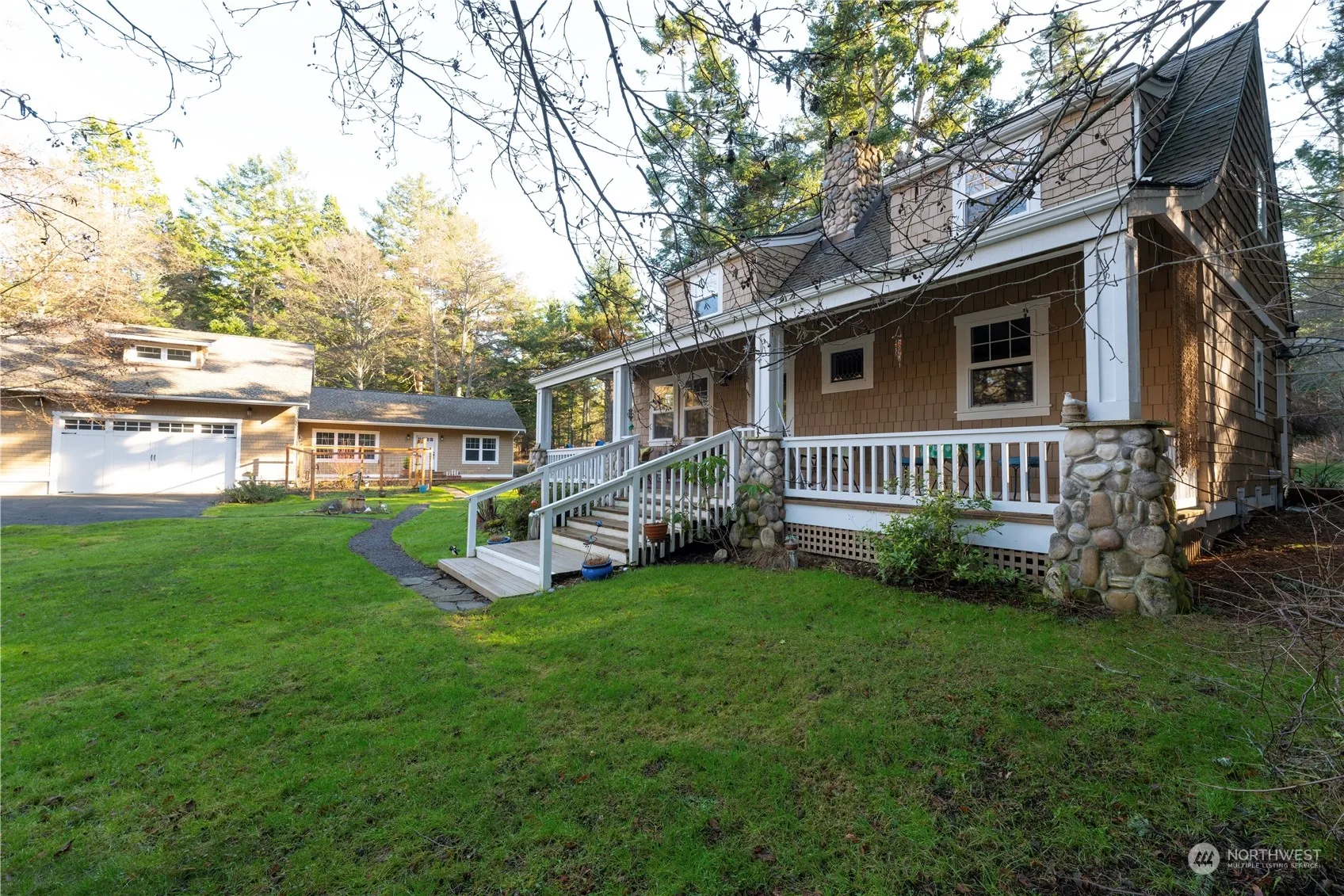 Enjoy the views along the designated Scenic Byway leading to this picturesque home. Hike to South Beach and American Camp or enjoy the nearby community beach. This well-maintained 1400 sf home with spacious front porch includes an efficient 3-step kitchen with soapstone countertops and beautiful cabinets, spacious living and dining areas with a river stone fireplace, office, laundry room and half-bath. French doors open to the sunny back deck ideal for fox watching. Two bedrooms and a 3/4 bath with spacious shower on the upper floor. A separate 668 sf single-level guest suite near main house extends the living space with a bedroom, full bath and spacious den. Attached 900+ sf extra-tall garage. Fiber installed. Sold partially furnished.
