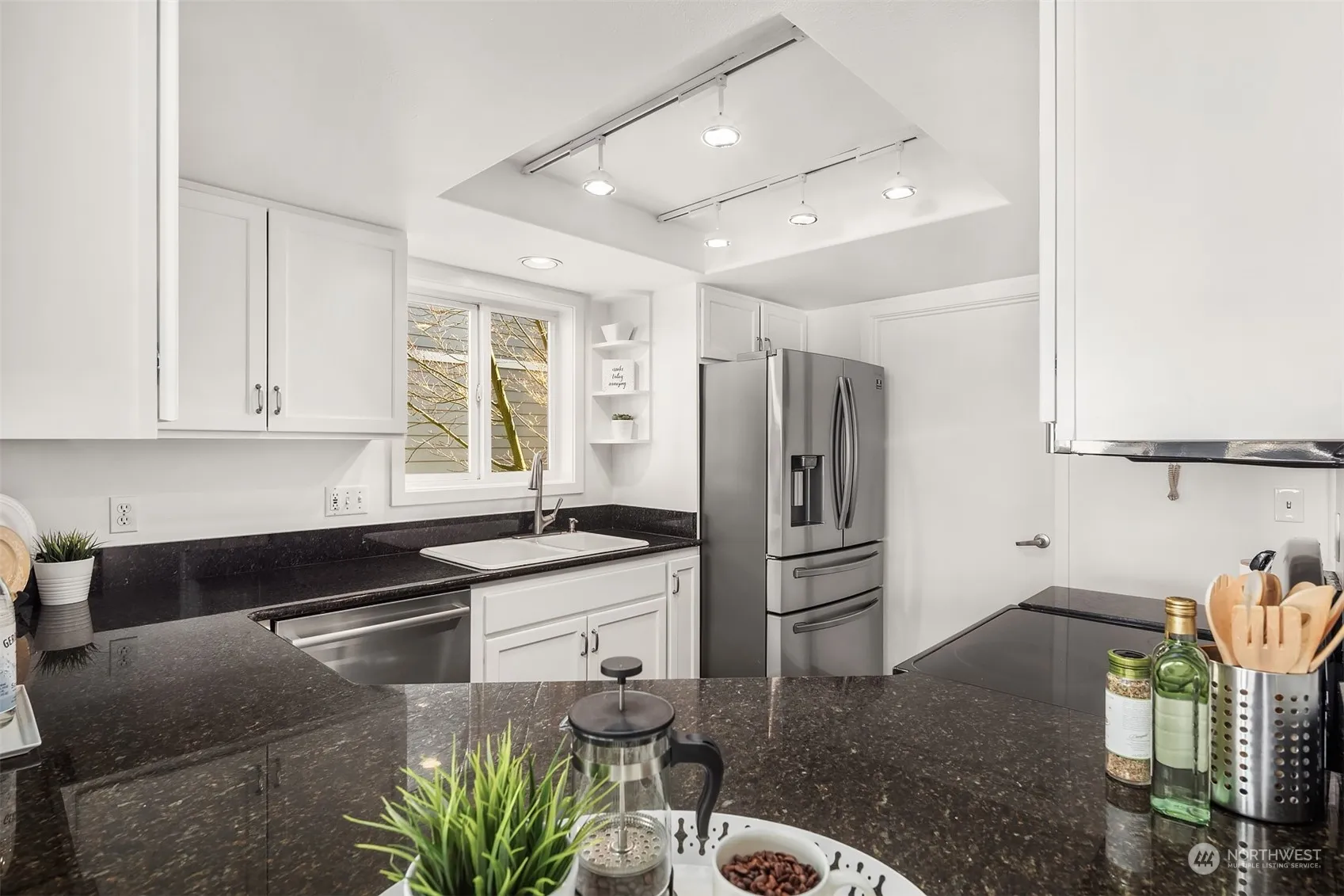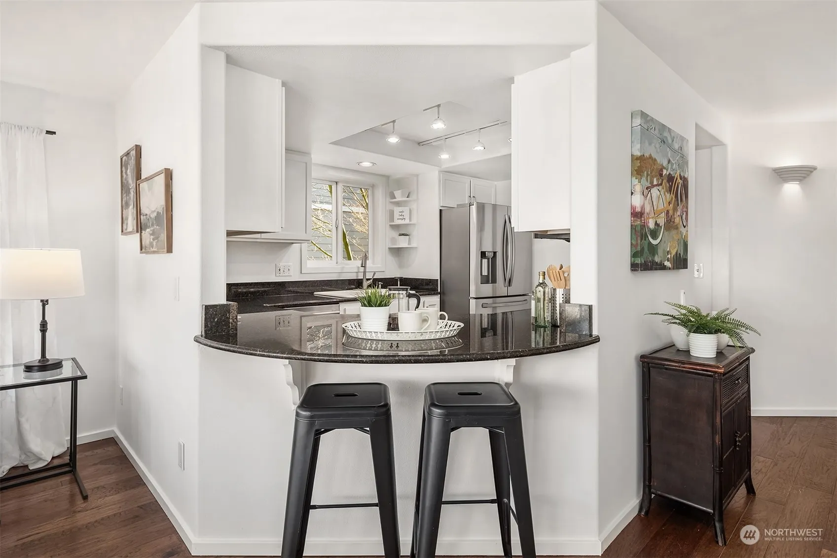 Welcome to Dayton Place Condominiums, a small, 4-unit boutique building located in the heart of downtown Edmonds! Immaculate end-unit features an open floor concept with abundant natural light & hardwood floors, as well as a spacious living room w/ a gas fireplace & beautiful handcrafted surround. Lovely kitchen features granite counters with sit-up eating area & conveniently opens into the in-unit laundry. Quiet primary suite has plenty of closets, a spa bath w/ soaking tub & double sinks. Multi-use 2nd bedroom opens to a newly renovated main bath. Enjoy sound & mtn views from the bay windows & private deck. Lobby entrance, retooled elevator, easy access to garage & 2 storage areas. Enjoy Edmonds vibrant food, shopping, art scene & parks!