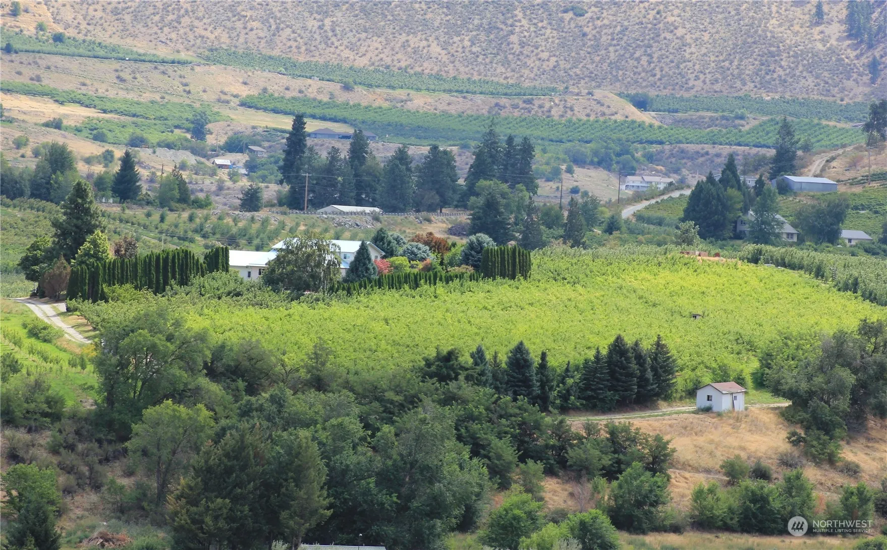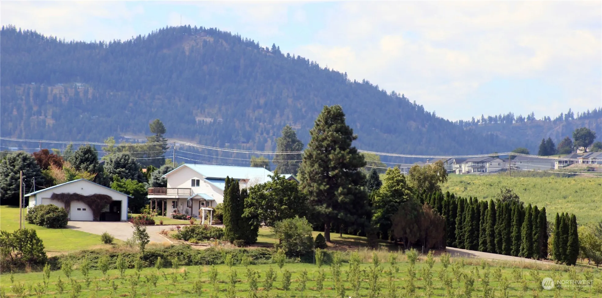 Serene 7.2 acres w/ mountain/lake views bordering Dry Lake. 5b/3ba, circular paved driveway w/3 bay gararge/shop. There is a 2nd home (ADU mobile home) that would be great for potential rental income. Home has great room w/cathedral floor-ceiling windows, Kitch w/custom oak cab & granite. Featuring 2 primary suites w/access to covered patio/open deck, adding additional 1250 sq ft of entertainment space. Additional 3 bdrms, utility, office, storage & 2nd level fam room. Home updates: newer appliances, carpet, paint & luxury vinyl floors. Property includes 4 acres of producing apples which is leased to another person who maintains it. Seller is willing to pay for removal of orchard if Buyer desires. Mature landscaping w/natural lake habitat.