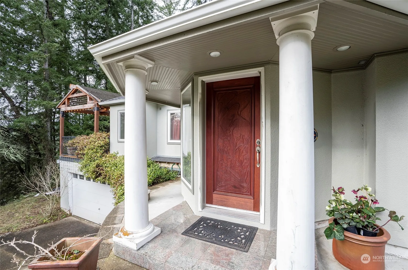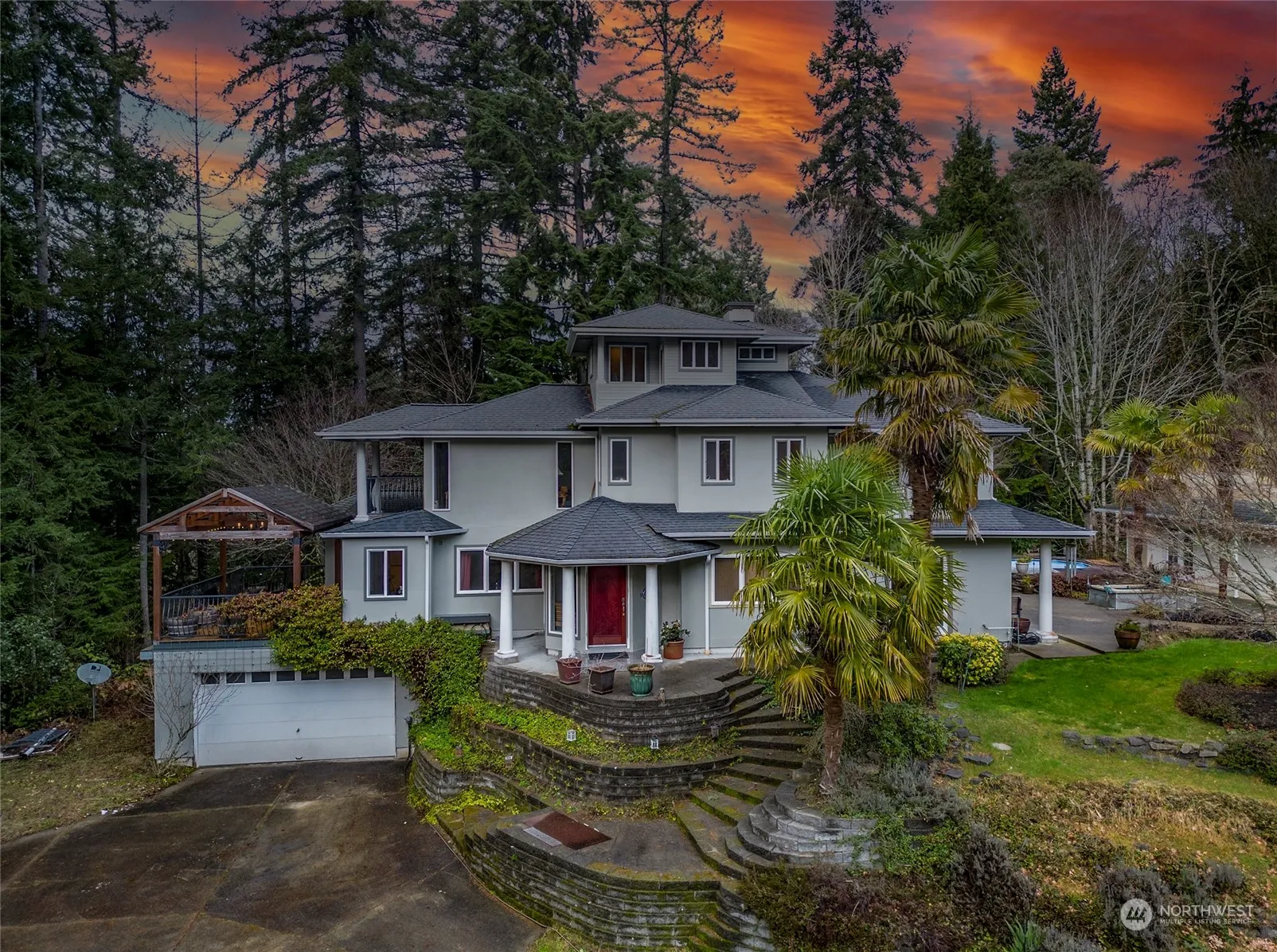Nestled in seclusion just above the heart of desirable downtown Gig Harbor. This beautiful & unique custom built home is a Must See! Sitting atop 1.65 acres of terraced gardens, sit back relax and unwind in the tranquility of a majestic PNW forest. This home offers a spacious open floorplan. Kitchen and dining room that open to an amazing patio for outdoor entertainment. Enjoy a Private Master suite with a balcony, walk-in shower, soaking tub & find a stairwell that leads to a room at the top of the house with an incredible view. Each bedroom has its own private balcony. Huge dream shop, that includes a large paint booth. Deck with pergola built with timber from the property. Walking distance to parks and restaurants. Welcome home!