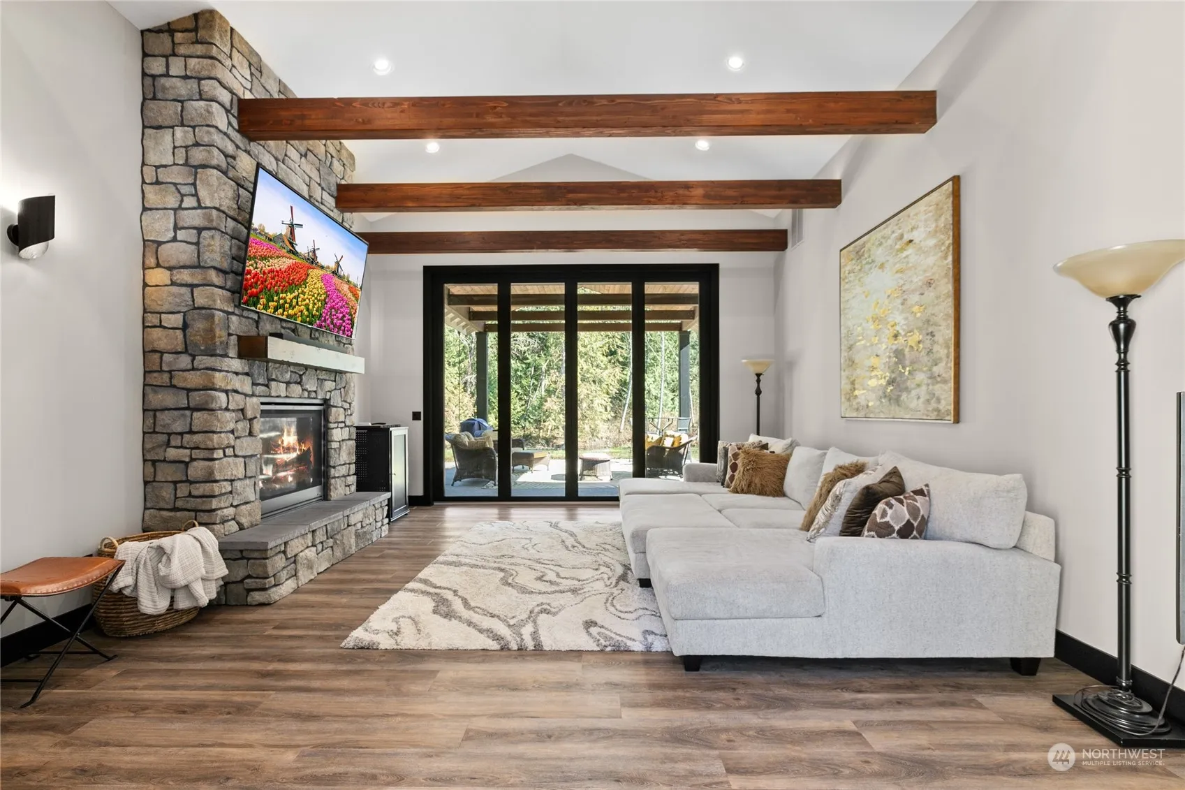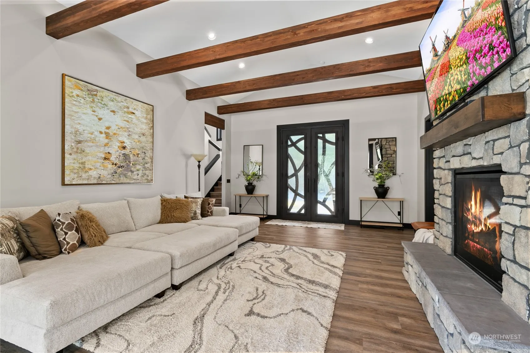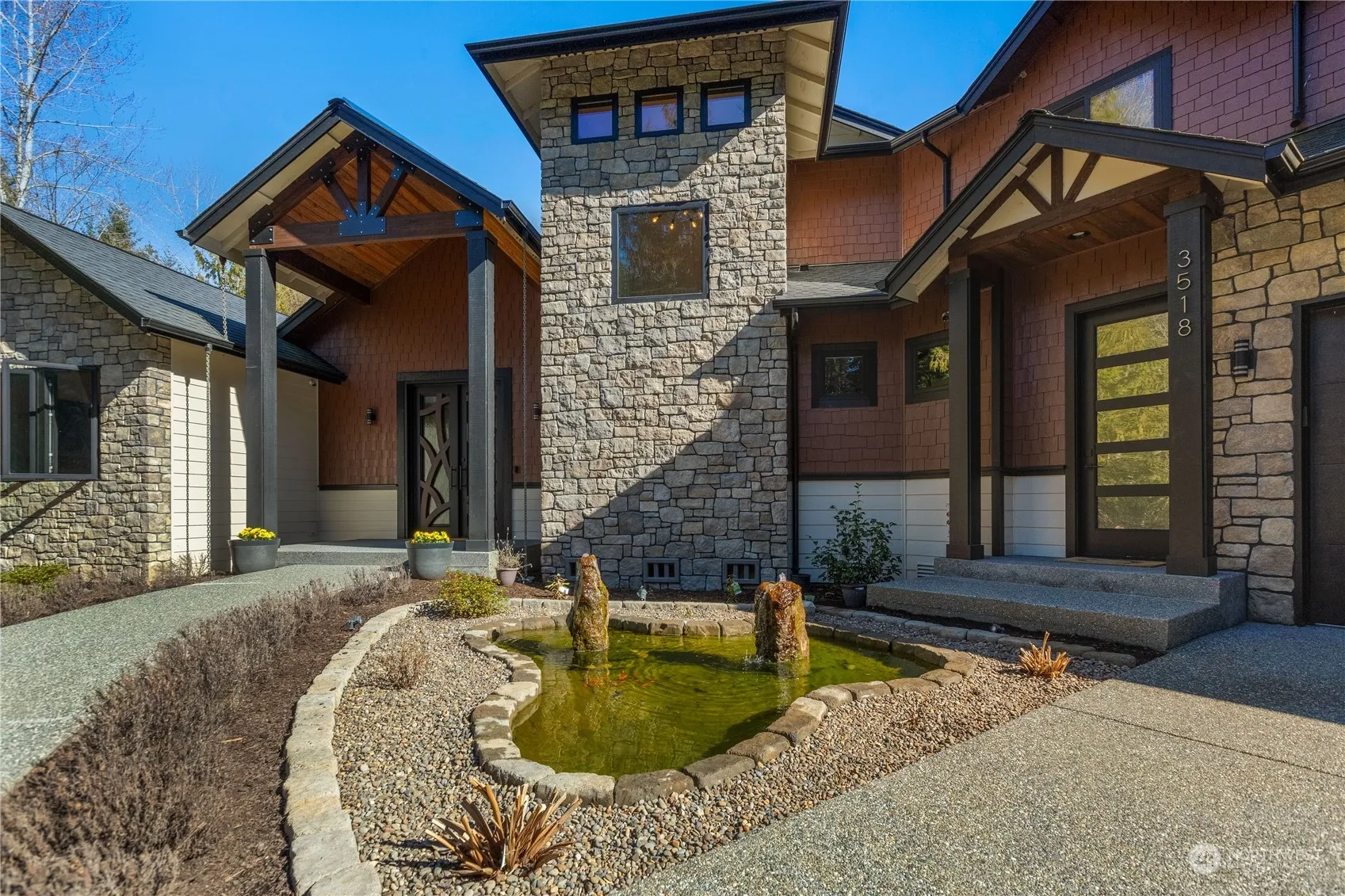 Exquisite custom home on 4+ acres near Lake Goodwin with abundant upgrades & meticulous craftsmanship. Features include custom steel & rain glass front doors, vaulted ceilings with exposed beams and dimmable LED strips, 3 stone fireplaces, and high-speed internet/cable wiring. Enjoy the 10’ panoramic doors opening to a covered patio perfect for BBQ overlooking the seasonal pond. The first floor primary bed boasts a cozy sitting area with fireplace, luxurious en suite bath with smart shower & soaking tub. Chef’s kitchen equipped with 4 ovens, commercial-grade appliances, built-in wine fridge and ample storage. European style fixtures & floating cabinets in each bath and a laundry with pet station. Welcome to your serene Lake Goodwin retreat!
