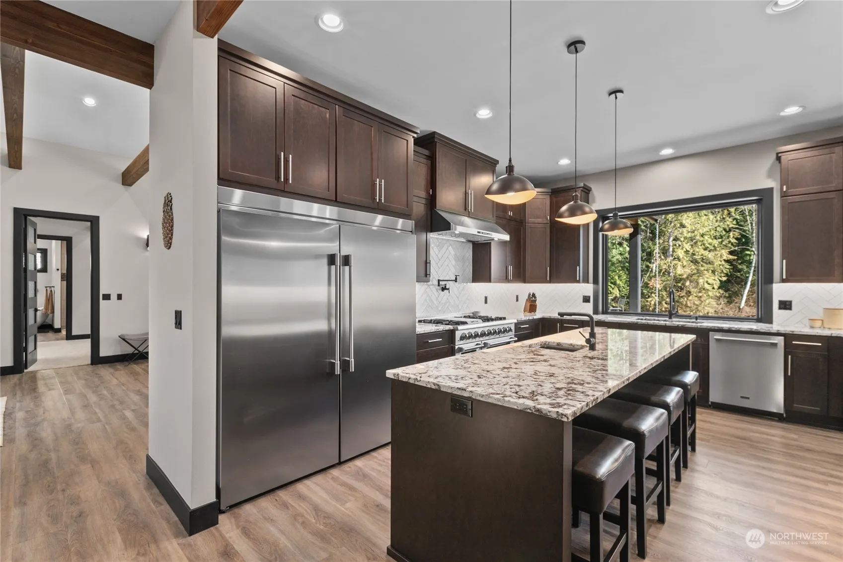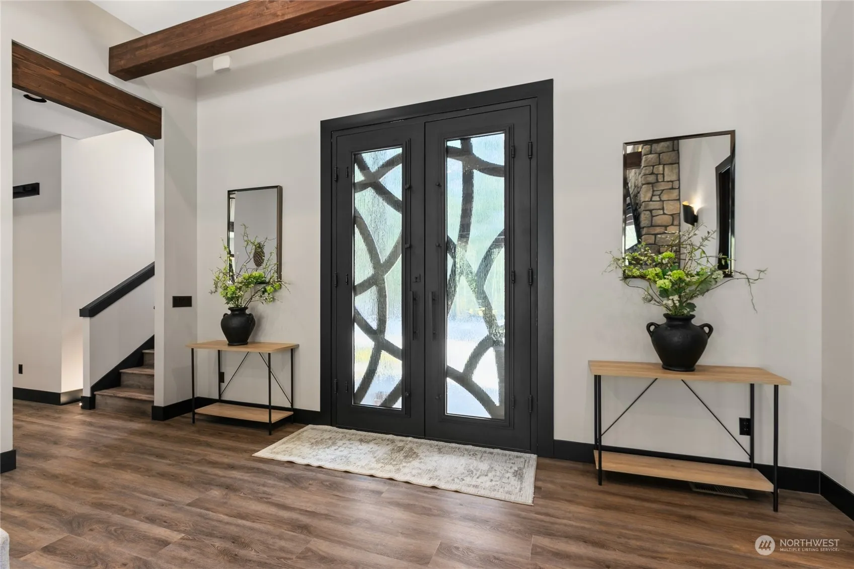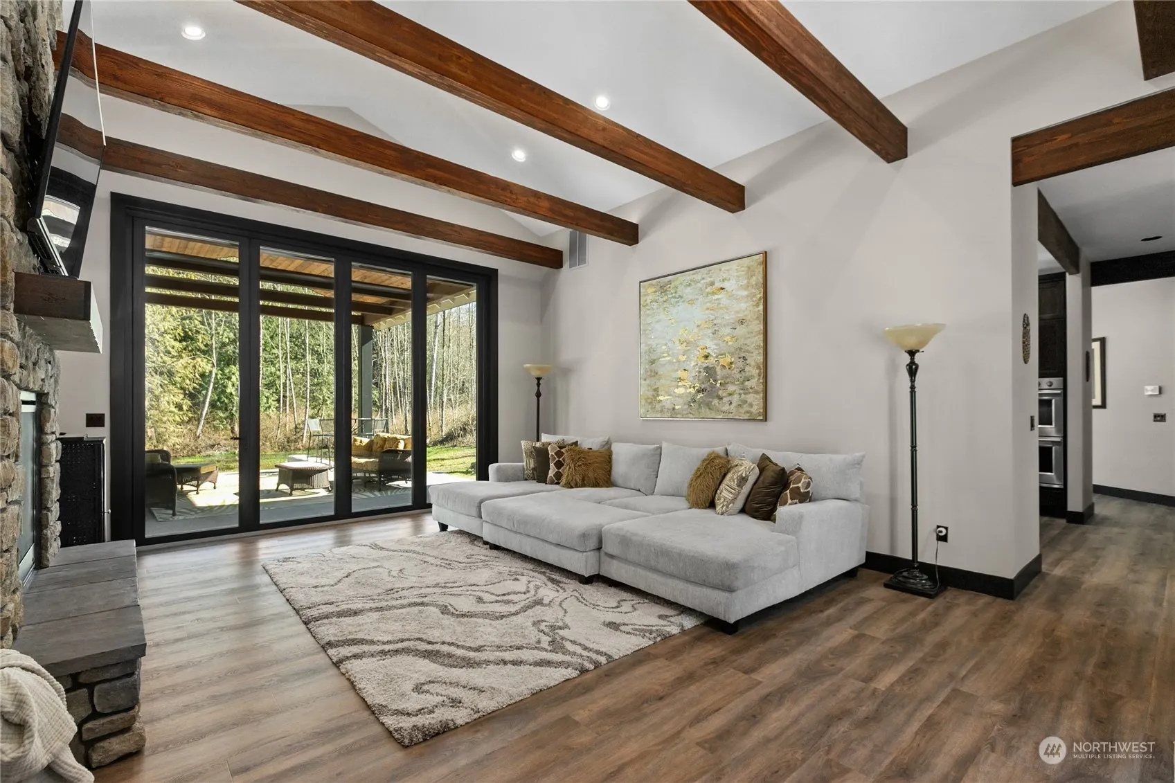 Exquisite custom home on 4+ acres near Lake Goodwin with abundant upgrades & meticulous craftsmanship. Features include custom steel & rain glass front doors, vaulted ceilings with exposed beams and dimmable LED strips, 3 stone fireplaces, and high-speed internet/cable wiring. Enjoy the 10’ panoramic doors opening to a covered patio perfect for BBQ overlooking the seasonal pond. The first floor primary bed boasts a cozy sitting area with fireplace, luxurious en suite bath with smart shower & soaking tub. Chef’s kitchen equipped with 4 ovens, commercial-grade appliances, built-in wine fridge and ample storage. European style fixtures & floating cabinets in each bath and a laundry with pet station. Welcome to your serene Lake Goodwin retreat!