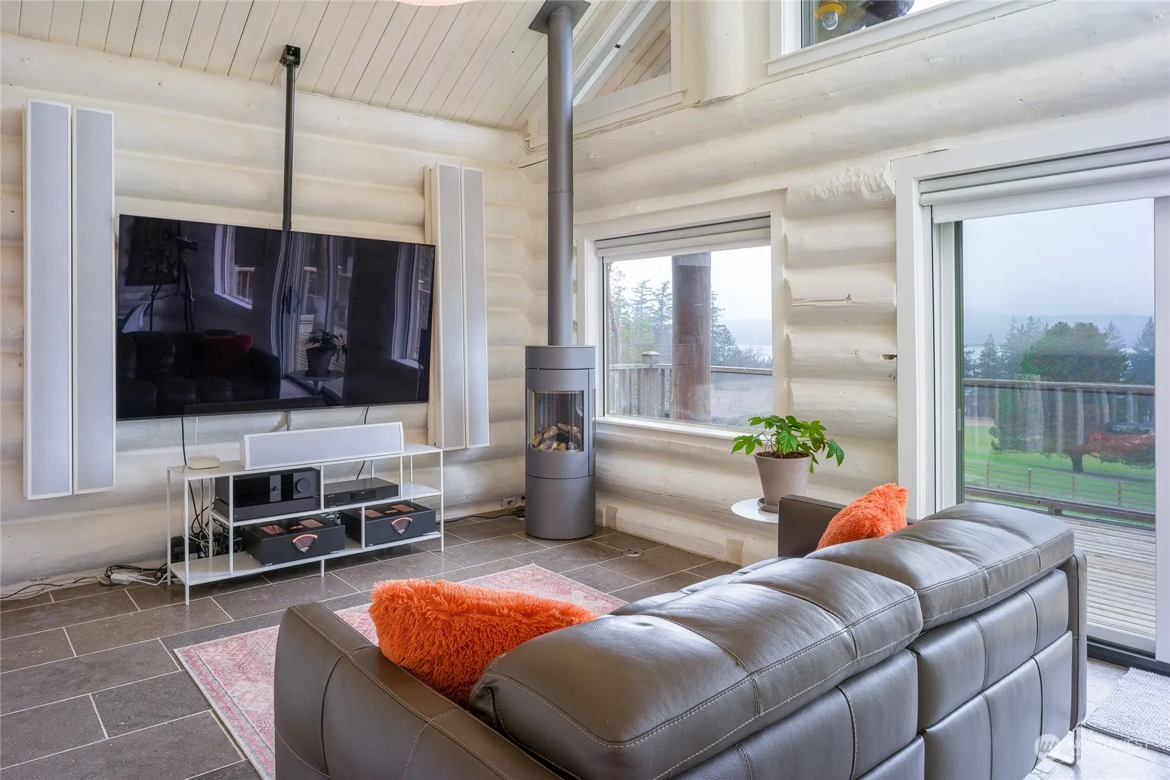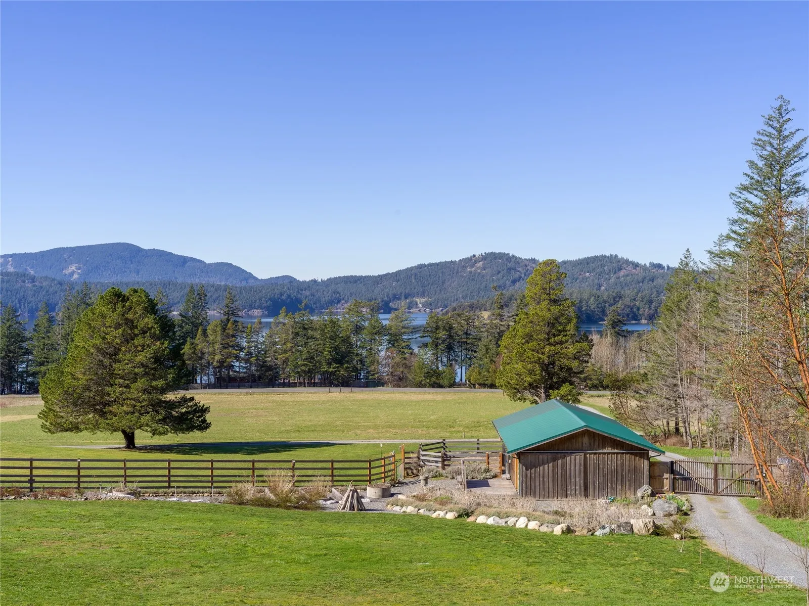 STUNNING VIEWS OF SHIP BAY, TURTLEBACK MOUNTAIN & YEAR-ROUND SUNSETS. Finely crafted and modernized lodge-style home w/dramatic open beam construction tucked into the hillside surrounded by beautiful rock walls, planters, bee & bird gardens, fruit & mature Madrona trees. Approx. 2000 SF, 2BD/3BA light & bright w/water views from nearly every room. Private master on loft level ensures infinite privacy. Use the enclosed veranda or the sunny deck to take in the serene setting & stunning views. Privacy & plenty of outdoor space to enjoy, 7+ park-like acres w/large cedar barn & attached sun deck, 2-car garage, home gym, pole barn/carport, fiber internet, detached home office. Located only moments from all Eastsound Village amenities.