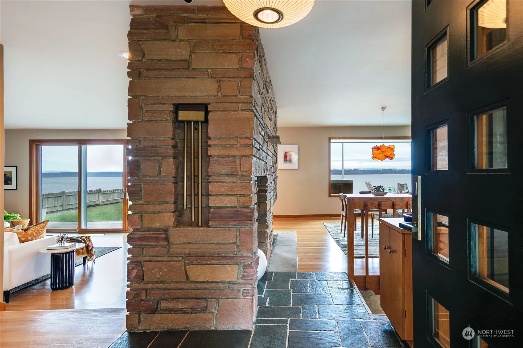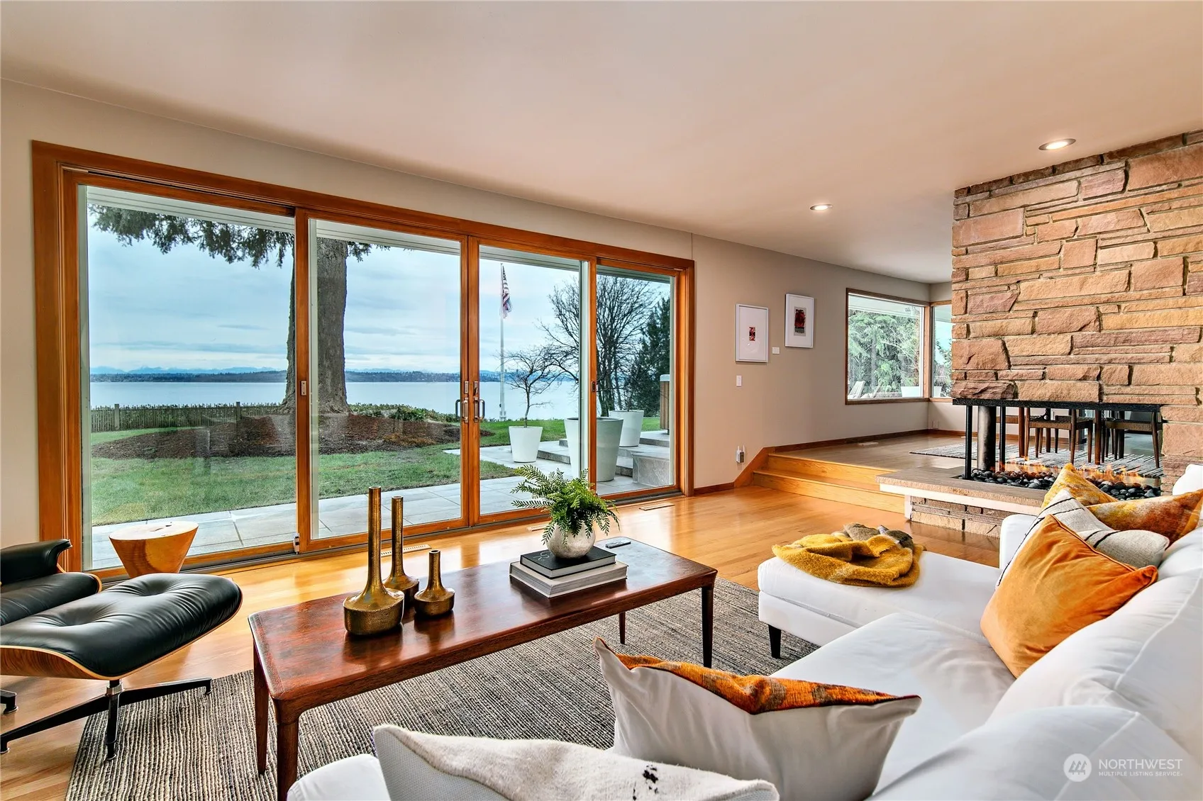 Mid-century gem has 2 bedrooms and elegant primary bath on main level plus spacious finished lower-level guest suite/den/office with bath & separate entrance. High-bank waterfront with potential beach access. 180 degree views of Puget Sound, Seattle and the Cascades; flowing floor plan, solid oak floors, sunken living room, 3-sided fireplace; 760sf patio w/ hot tub, extra-deep 2-car garage plus 4 add’l parking spaces. Refined, curated updates & modern amenities including chef’s kitchen with breakfast nook, butler’s pantry, full suite of Wolf/Sub-Zero appliances; 20kw backup generator served by 250-gal propane tank. Lush landscaping. Secluded & private, yet a mere stone’s throw from Rolling Bay Center and 2.5 miles from Fay Bainbridge Park.