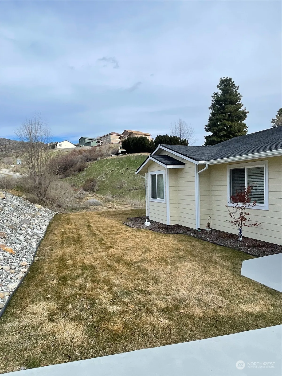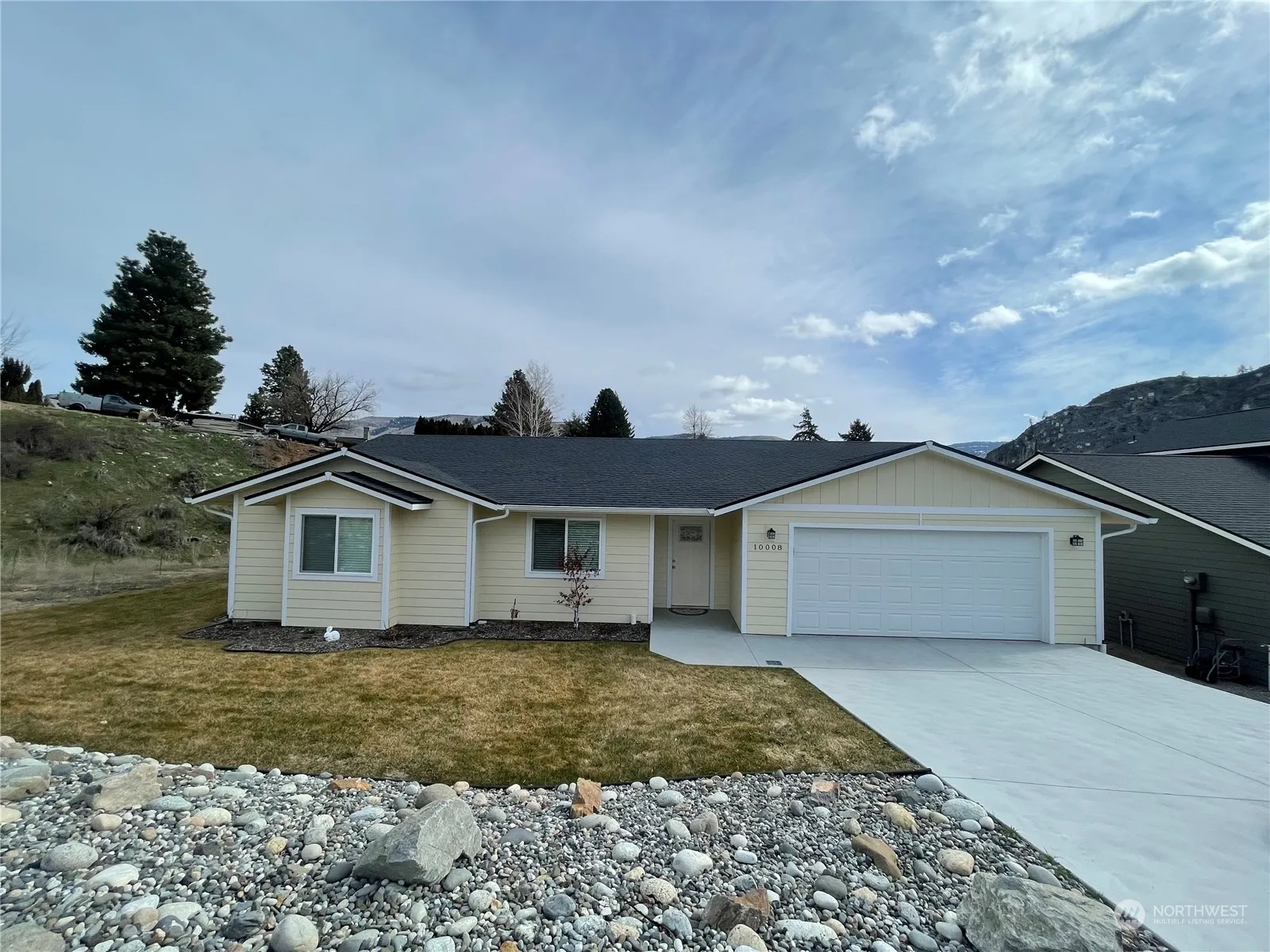 Entiat – 2021 NEW CONSTRUCTION landscaped single level 1575sqft 3 bedroom/2 full bath home with picturesque views. Entryway with hallway closet into living room, oversized kitchen w/quartz countertops – all appliances stay, dining room, sliding glass door to outdoor patio, two bedrooms, full bathroom w/matching quartz countertops, primary bedroom with en-suite double sink, quartz vanity, & walk in closet, plus a separate laundry room. Heat pump – heating & cooling. Attached 2 car garage. Close to trails and Entiat Park. Sprinkler system. Irrigation. City Utilities. CCRs. $474,900 MLS-2202451/H-3219