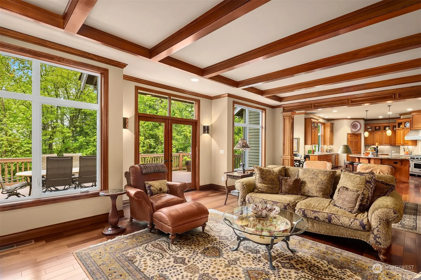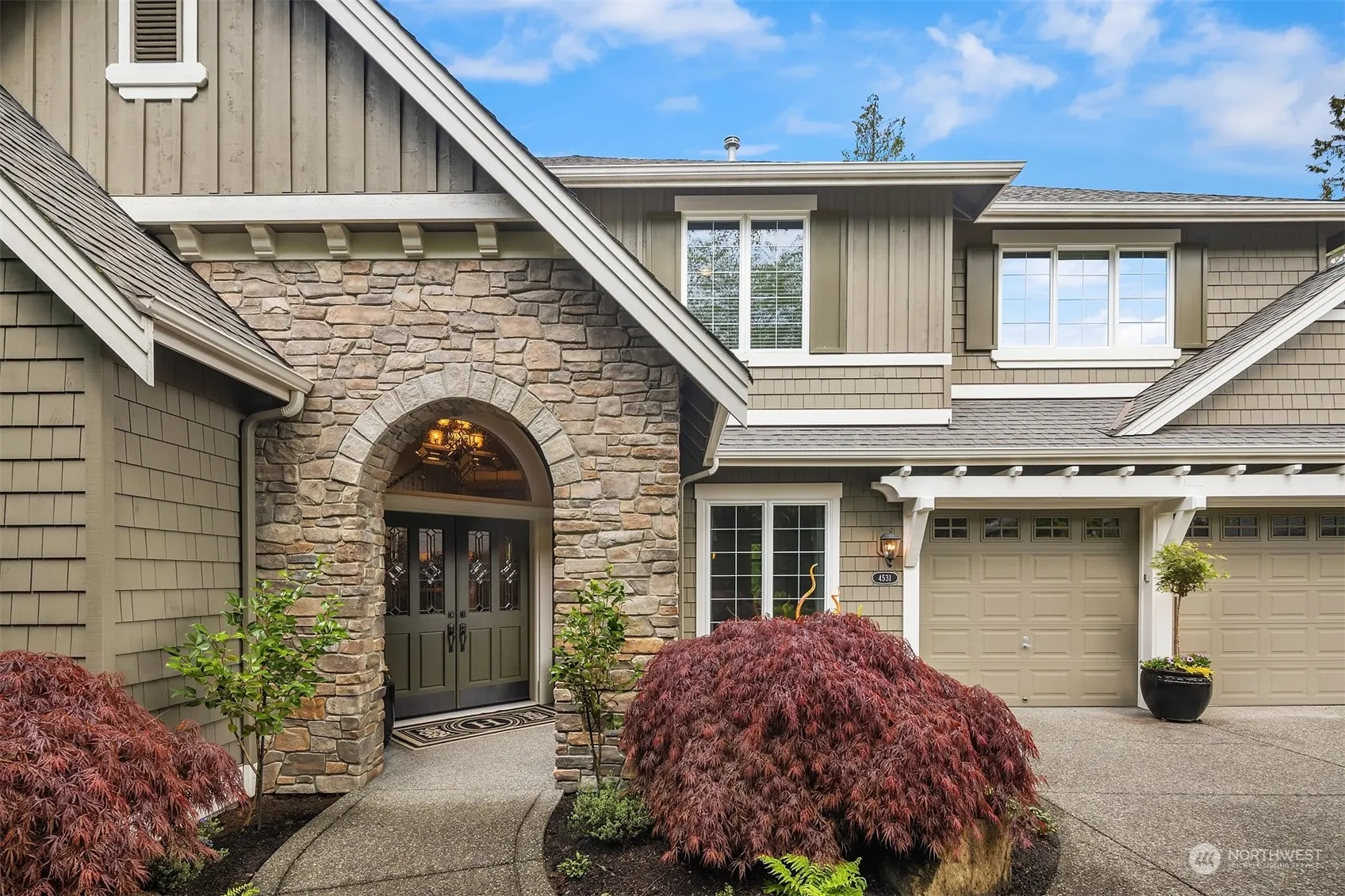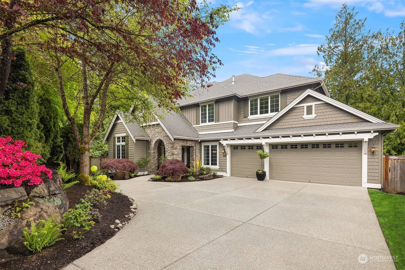 Exceptional William Buchan home in desirable Timberline! Perfect floor plan, luxury finish, best location, top rated schools & safe neighborhood, this home has All! A private driveway leads to this beautiful home, sits on a 1/2-acre lot and backs to greenbelt. Grand entry with vaulted ceiling, rich alder cabinetry, lustrous slab granite, high-end appliances, dramatic beamed ceilings, huge entertainment deck, wine cellar. Main floor features great room, kitchen, dining room, office. Upper level has primary suite w/ fireplace, two additional bedrooms, bonus room. Lower-level features recreation room, two bedrooms, wine cellar. Surrounded by nature, mature garden with blooms all year long. Easy commute to HWY520. On tech company shuttle route.