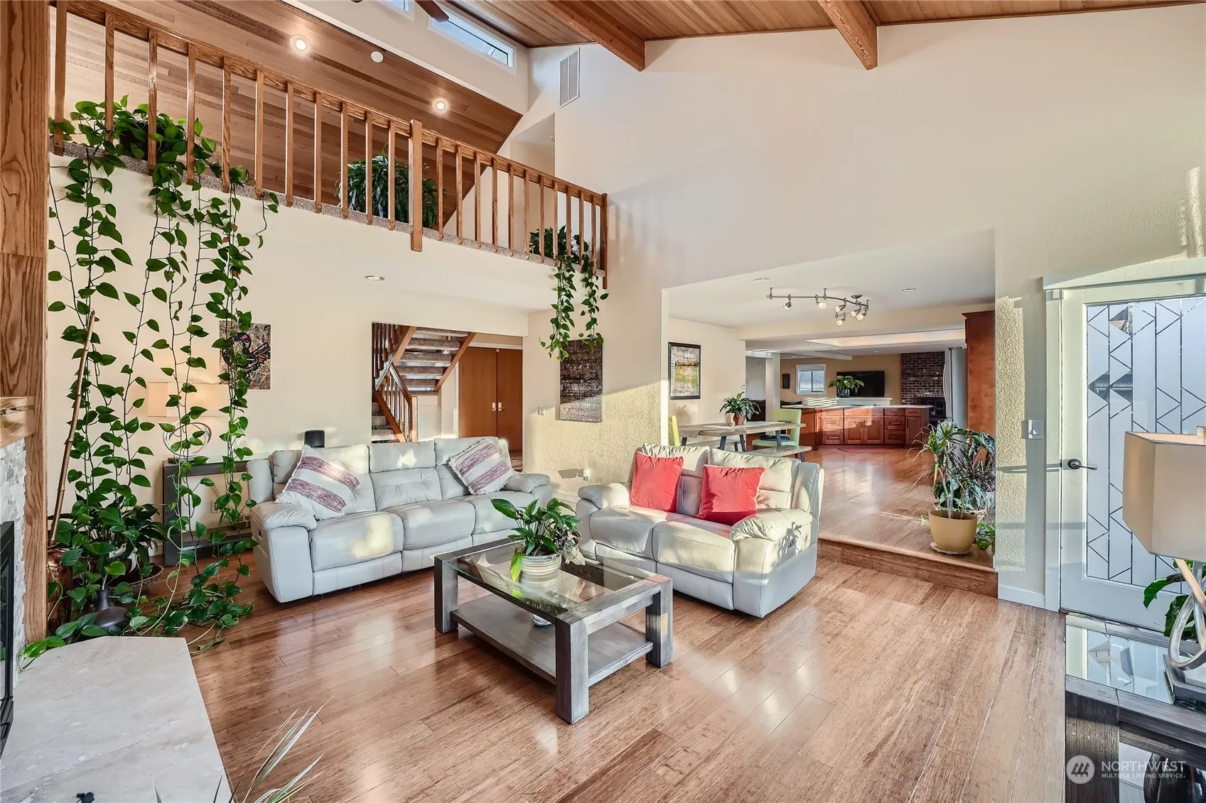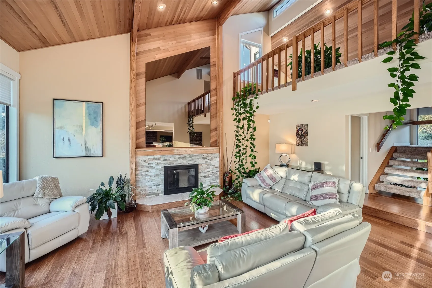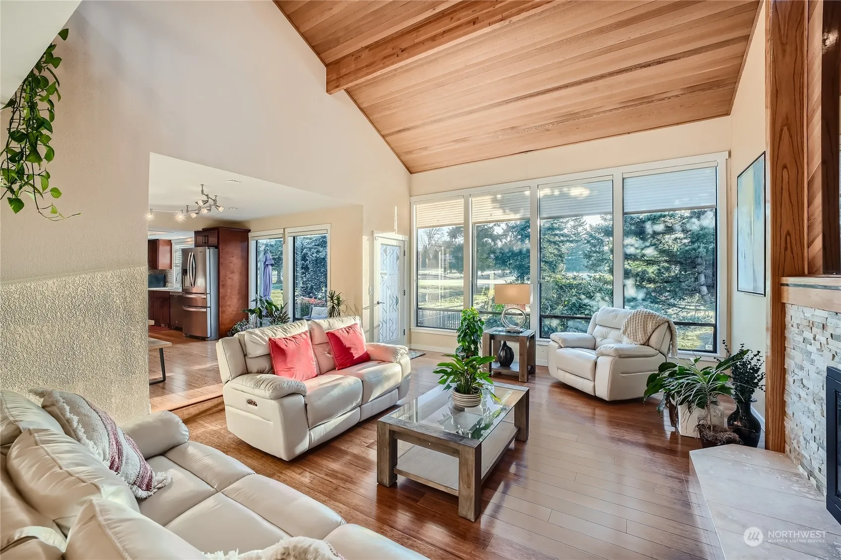 Discover luxury living in the Meridian Valley Country Club gated community, this exquisite 4 bed/3.25 bath home is nestled against the picturesque backdrop of the golf course, this beautiful home offers unparalleled views & distinctive features. Main floor:Living rm has soaring vaulted ceilings & fireplace, gourmet kitchen, center island w/quartz countertops, dining area, family rm with 2nd fireplace & bedroom/office. Upstairs loft overlooks the living area below. 2 addtional bedrooms, full bath & lanudry rm. Primary suite has 2 baths, one spa like with glass shower, sauna, soaking tub, & deck. Exterior: two entertainment size decks w/views of the golf course, & 3 car garage.Take advantage of memberships for golf, tennis, and clubhouse.