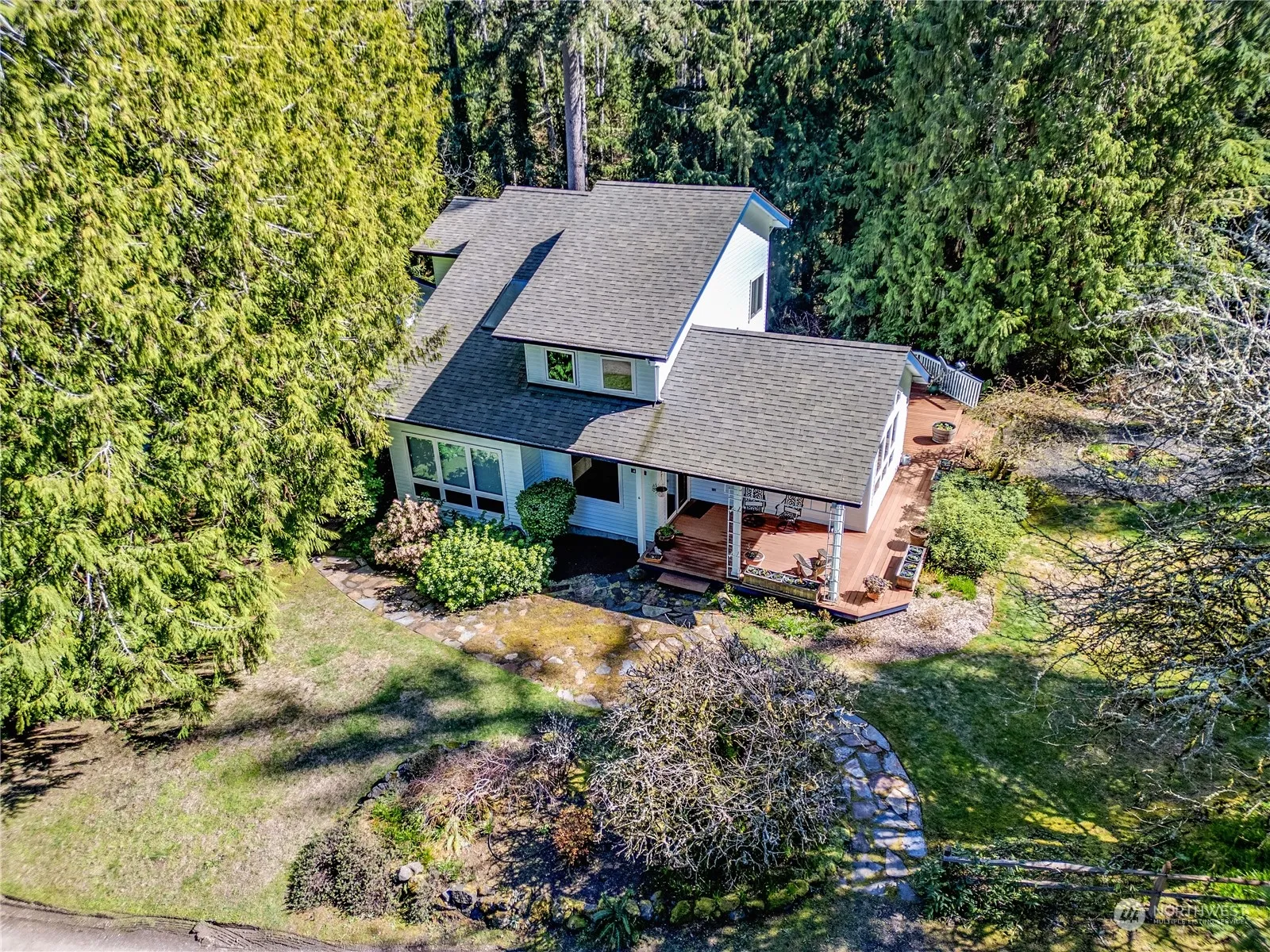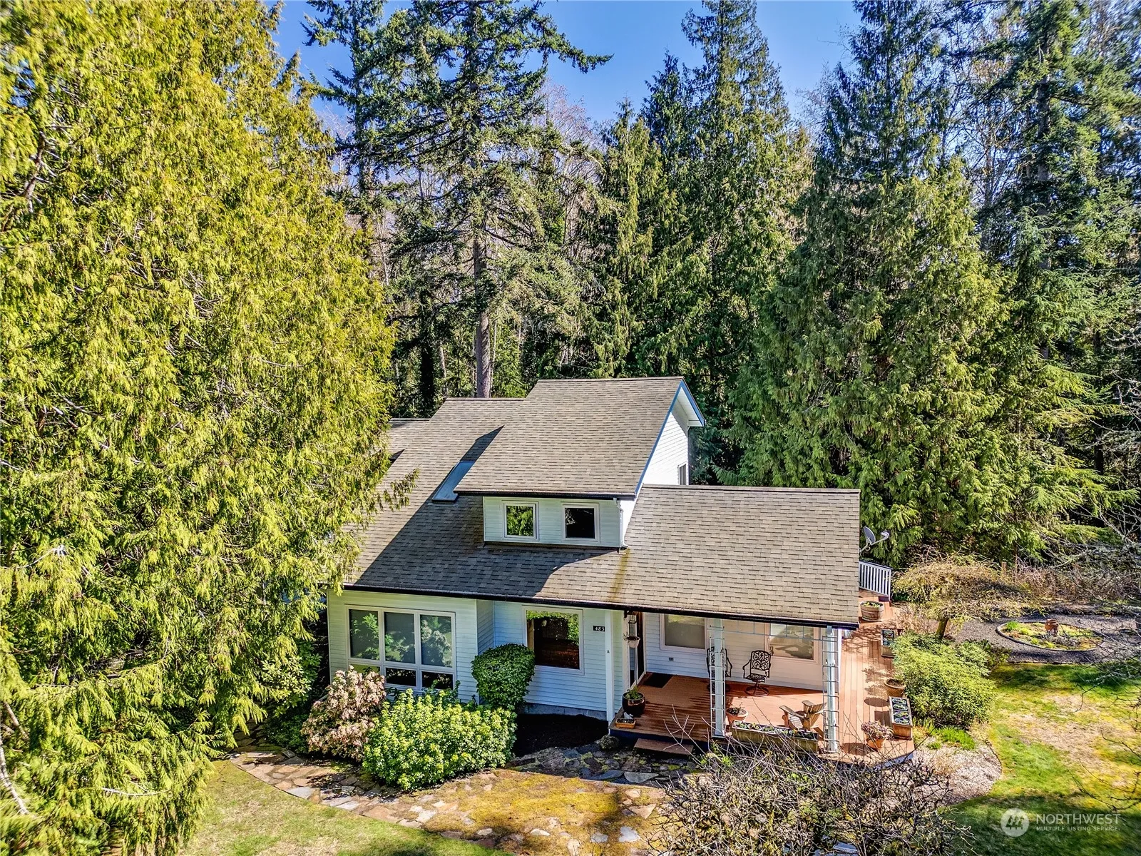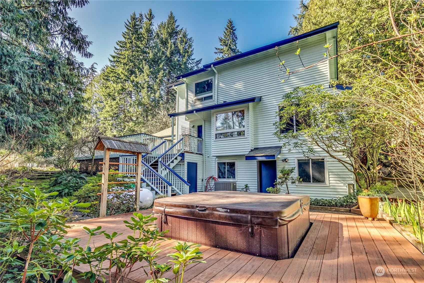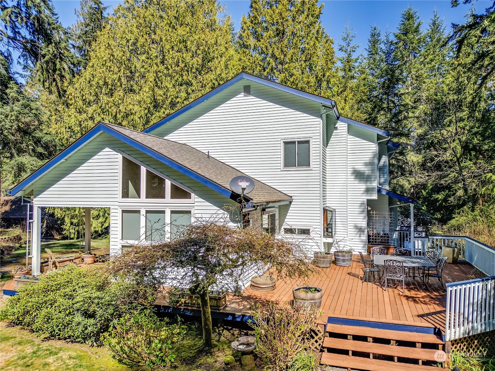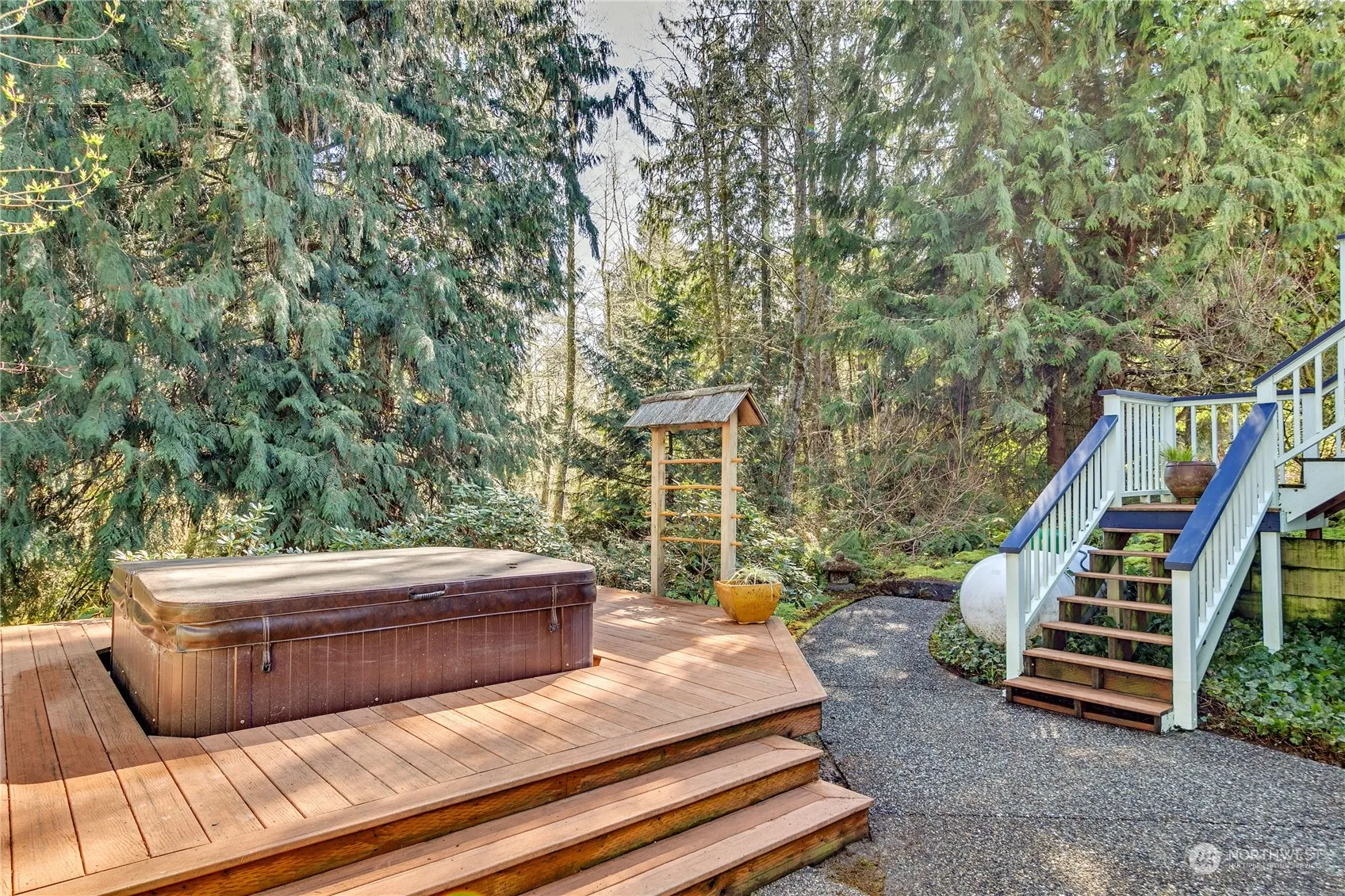 This four bedroom home nestles peacefully in a fairy tale garden setting. Looking out through your newly installed Anderson windows, wooded greenbelt, fruit trees, berry bushes and easy care raised-bed garden space. A large, low maintenance composite deck wraps around 3 sides to a covered porch. Detached 2 car garage has generous shop and storage area. The separate carport provides extra space for vehicles, RVs, or boats. Sit and soak under the trees and stars in the hot tub on a separate deck accessed from the lower level. Main floor master suite, 3 bedrooms upstairs. Flexible choices for your home office. Enjoy your friends while cooking from the open concept kitchen with generous counterspace, storage,updated appliances