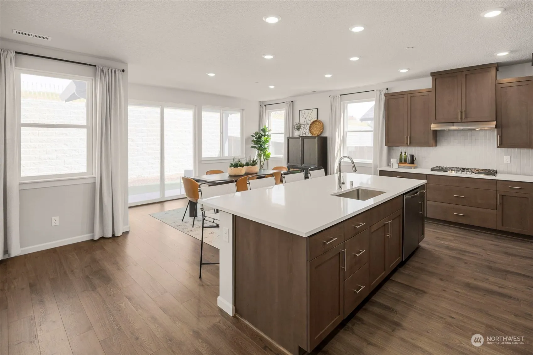 This two-story home is a NextGen® design that’s ideal for multigenerational households, home office, home schooling, guest quarters and so much more. The private attached suite features it’s own living room, kitchenette, bedroom, bathroom and laundry. In the main home, the living and dining spaces occupy the first level in a contemporary open floorplan, while three bedrooms, a versatile loft and a tech space are found upstairs. Sample photos of model home. Self-guided tours available 7am-7pm. Renderings and sample photos are artist conceptions only. Photos are of similar or model home so features and finishes will vary. Home has white cabinets.