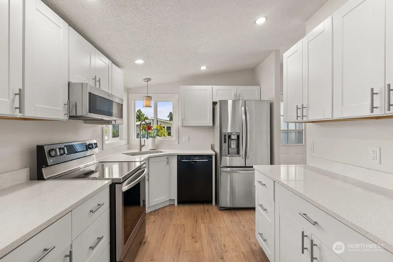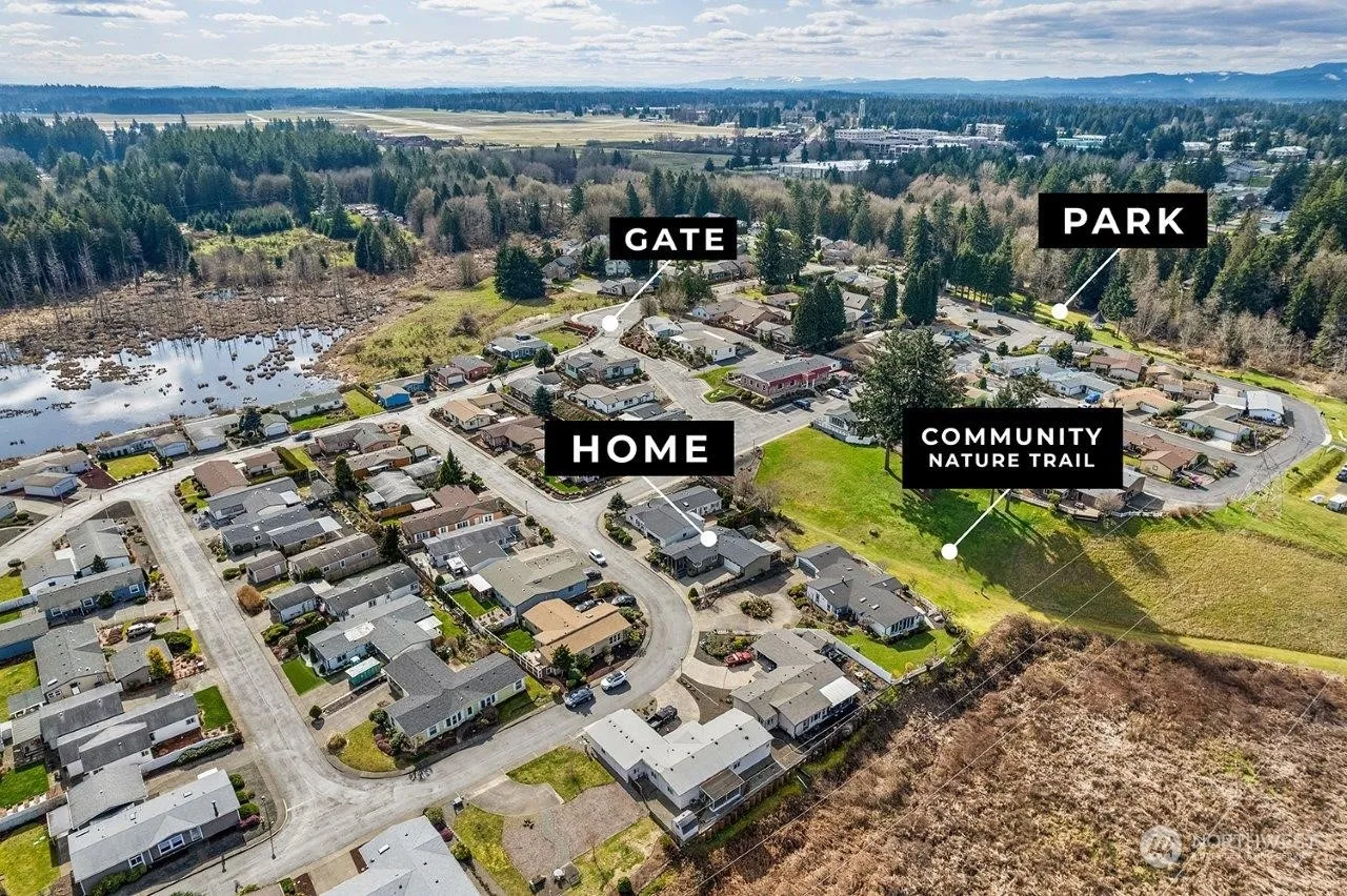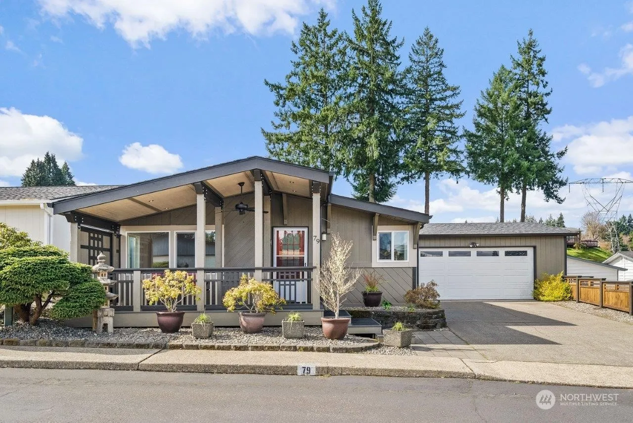 Upscale remodel of this 1232 SF, 2 BR, 2 bath home puts it in a class of it’s own. New top to bottom which includes floors, carpet, lighting, trim and paint. Both baths remodeled. New kitchen cabinets, quartz counters, new sink. Newer kitchen appliances. Beautifully designed and executed 18 x 8 front porch adds unique street appeal plus a relaxing space year round. Attached double garage, 23×22, with work bench. Back deck integrates with the back garden area and takes advantage of lush, green community area for your enjoyment. Raised beds. Monthly space rent $738 includes water, sewer and basic cable. Security gate, club house, sidewalks, trails. Friendly, safe. 2 residents per site, one resident minimum of 55yo, second minimum of 45yo.