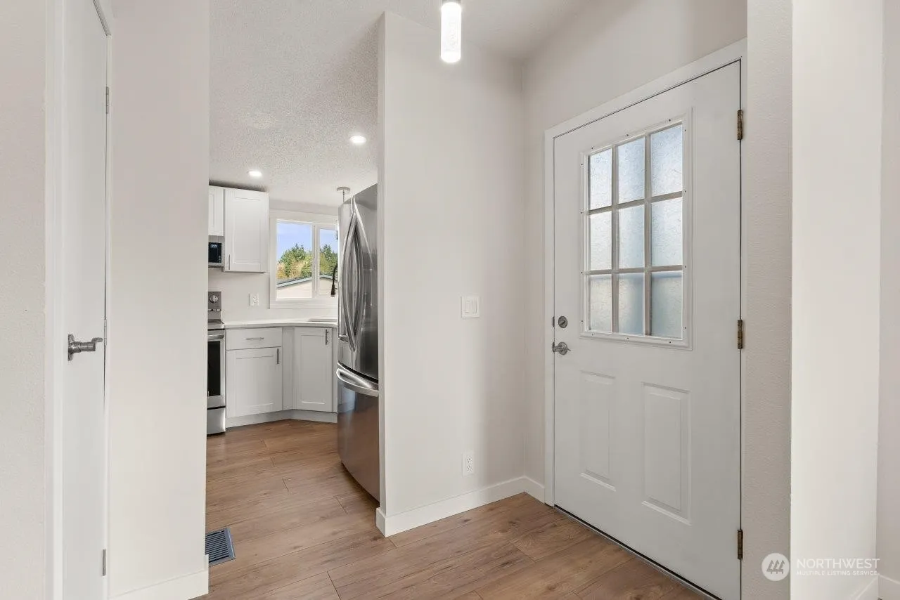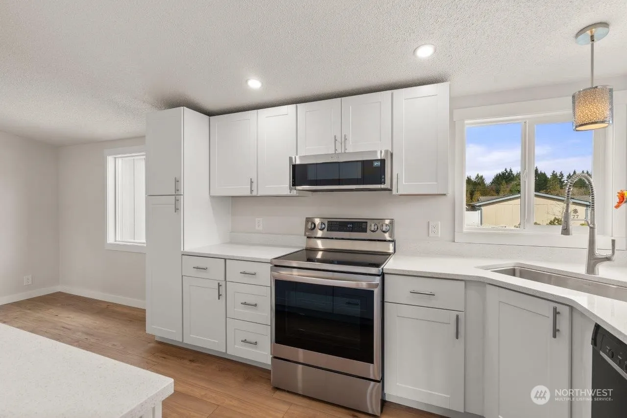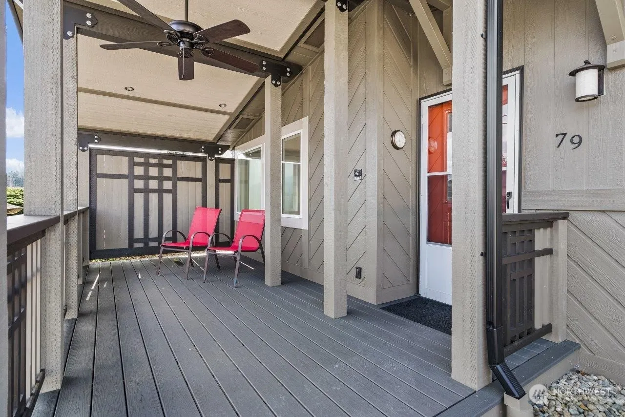 Upscale remodel of this 1232 SF, 2 BR, 2 bath home puts it in a class of it’s own. New top to bottom which includes floors, carpet, lighting, trim and paint. Both baths remodeled. New kitchen cabinets, quartz counters, new sink. Newer kitchen appliances. Beautifully designed and executed 18 x 8 front porch adds unique street appeal plus a relaxing space year round. Attached double garage, 23×22, with work bench. Back deck integrates with the back garden area and takes advantage of lush, green community area for your enjoyment. Raised beds. Monthly space rent $738 includes water, sewer and basic cable. Security gate, club house, sidewalks, trails. Friendly, safe. 2 residents per site, one resident minimum of 55yo, second minimum of 45yo.