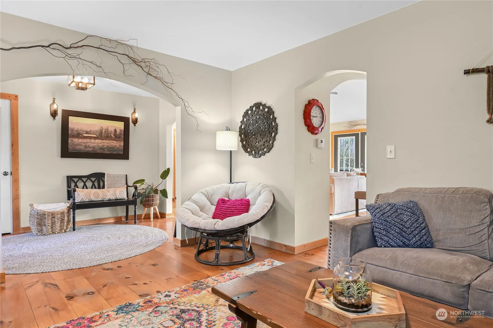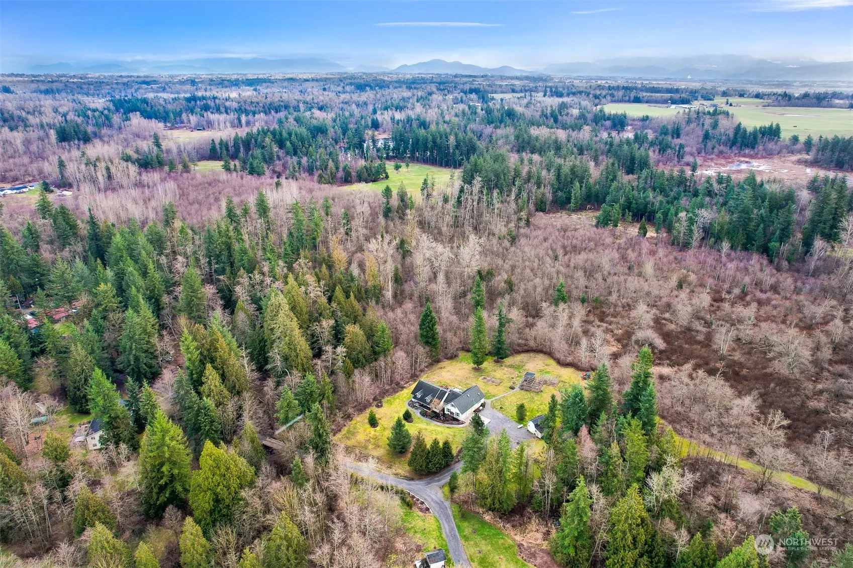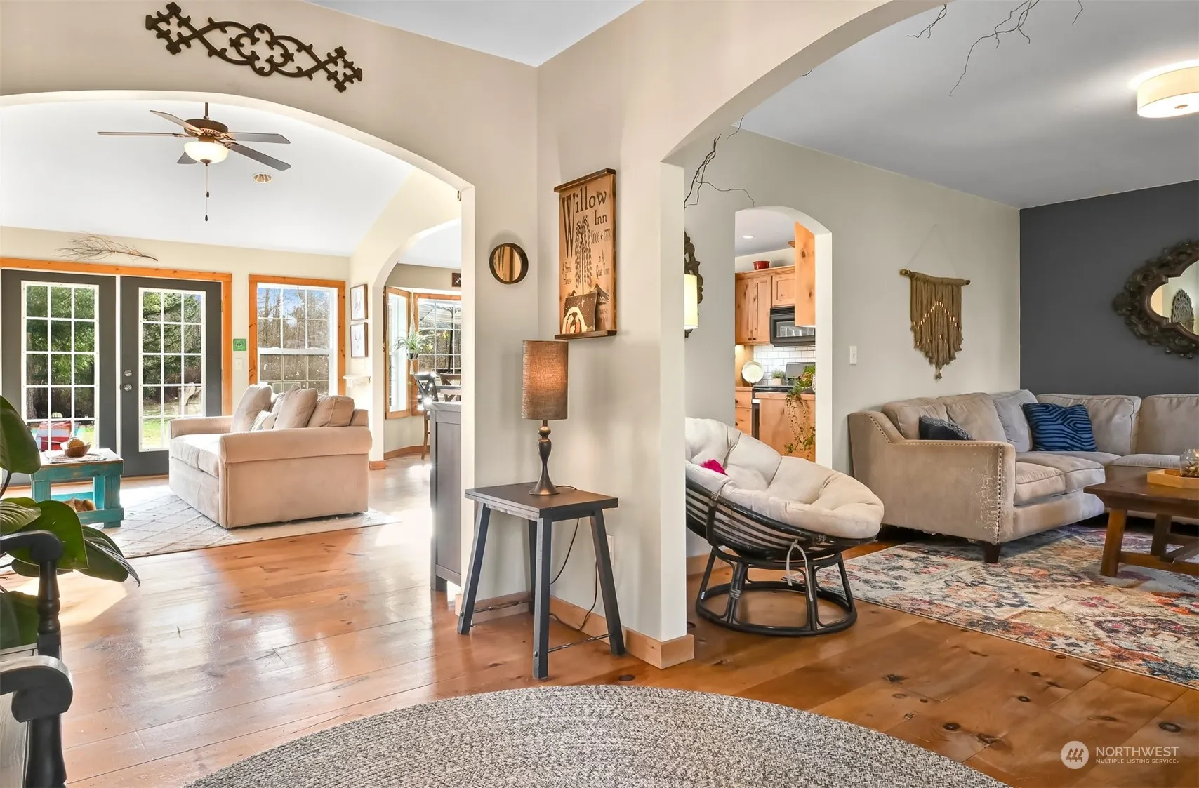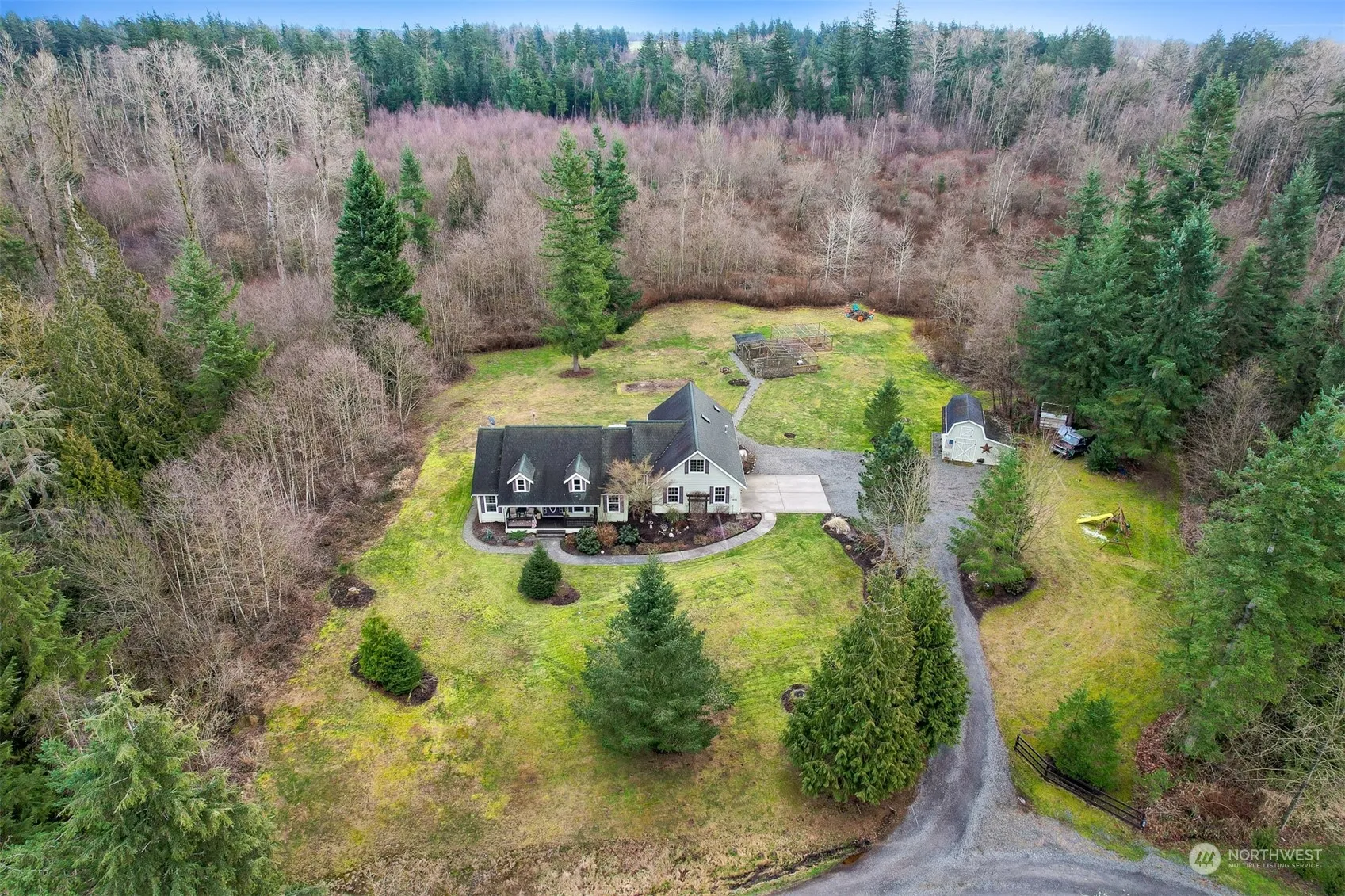 Beautiful and open style custom Craftsman home on a serene 7.5 acres. Peaceful and secluded setting with a sprawling backyard that includes a barn with a loft, hot tub, fire pit, and the tranquil creek that runs along the property. Timeless detail with arched doorways, vaulted ceilings and pinewood floors. Main floor living with large windows in every room creating natural light throughout the home and a rock fireplace with pellet burning heat. Kitchen features custom birch cabinets, tons of counter space for cooking and lots of storage. Expansive primary bedroom with a double sink and walk-in closet. Open loft upstairs is perfect for an office or bonus room. While close to town, this home is ideal for privacy and enjoying nature!
