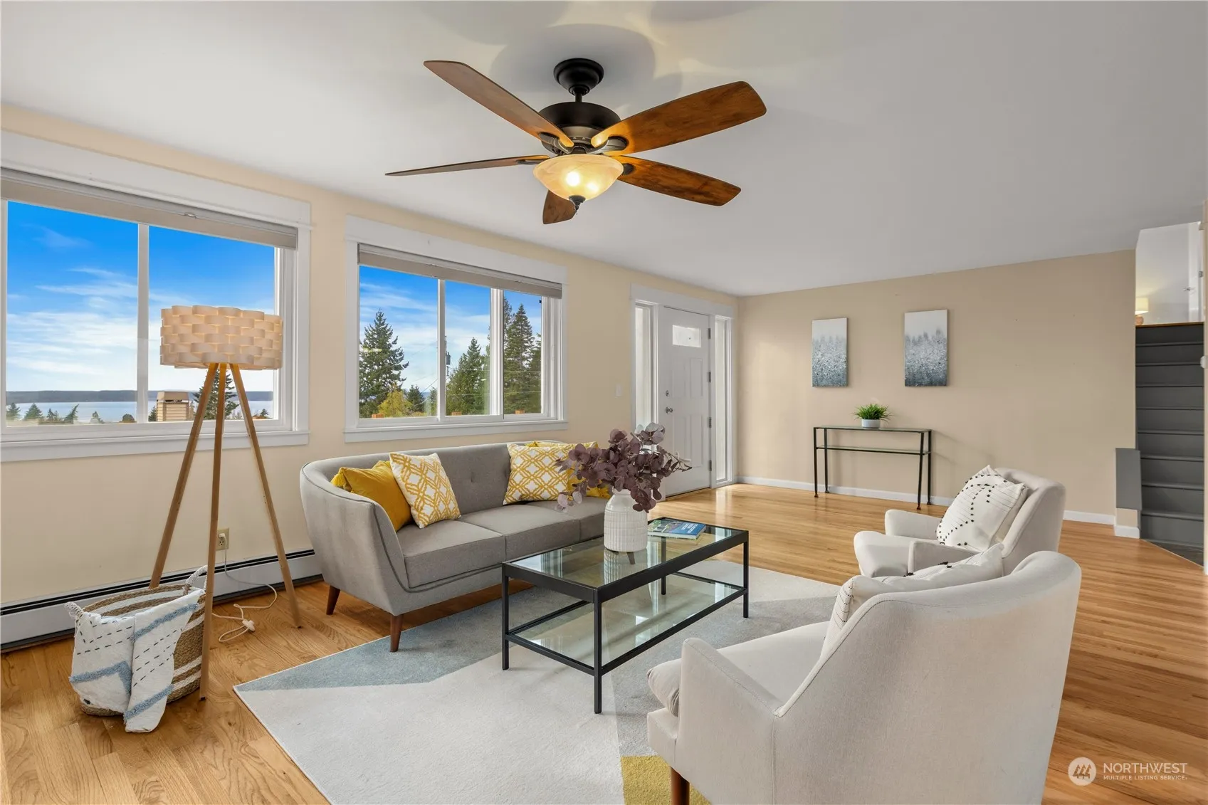 Embrace scenic water views in Des Moines with this exquisite 4-bed, 3.25-bath home on a corner lot, spanning 2,870 sq ft. The home showcases an updated kitchen, a luxuriously refreshed primary en suite with a generous walk-in closet, and a versatile basement equipped with a separate entrance—perfect for a rental opportunity or extra living space. The outdoor area promises memorable gatherings against a backdrop of stunning views. Situated near the Des Moines marina for top-tier dining and shopping, and with easy access to SeaTac airport and I-5, your perfect blend of convenience and charm awaits.