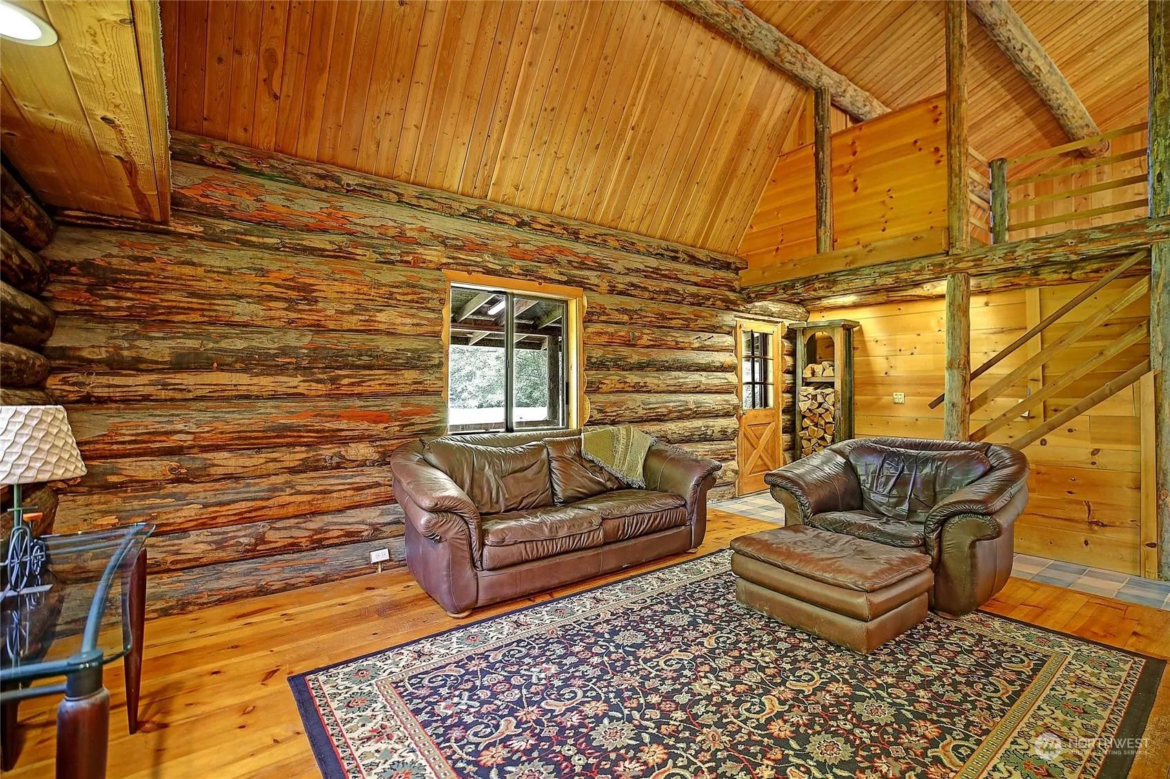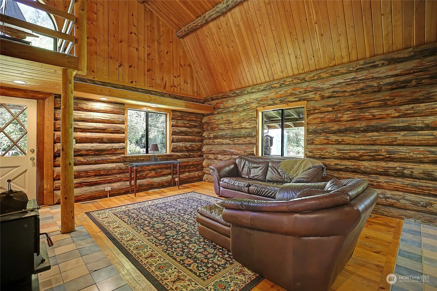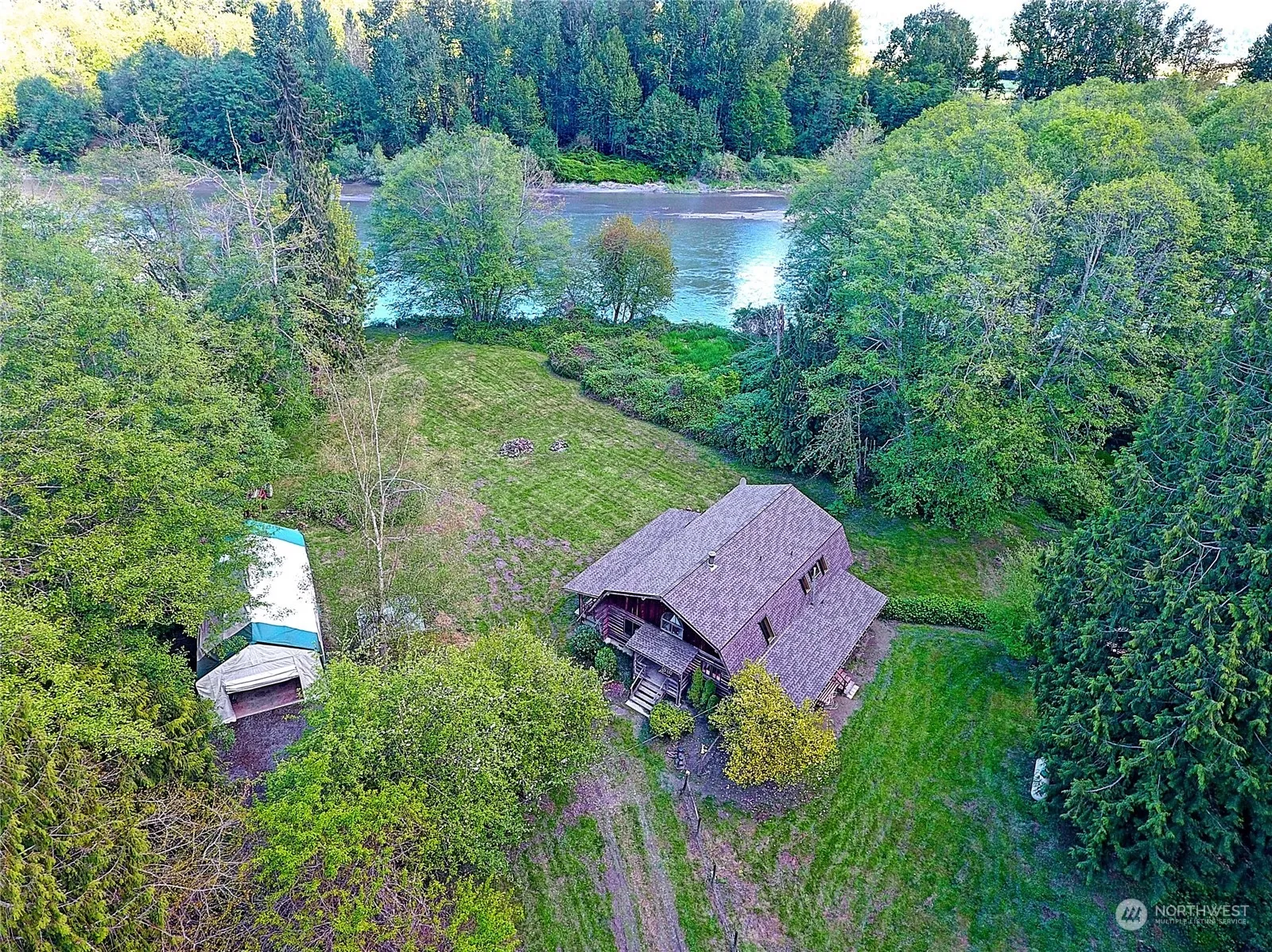 Tucked away in the secluded Silvana Crest Estates, this rustic riverfront log home sits on 6.59 acres along the Stillaguamish River. Enveloped by nature, this 1,760-square-foot sanctuary offers a serene escape from the ordinary. The main level includes a spacious kitchen, laundry room, living room, and two bedrooms, while an expansive ensuite/bonus room is located upstairs. The 30x35ft four-car tandem garage features an upstairs hobby space, and there’s an additional 20x40ft outbuilding with a cement floor, ideal for RV parking. This property blends comfort with the enchantment of nature, providing a cozy retreat among the trees and river’s whisper.
