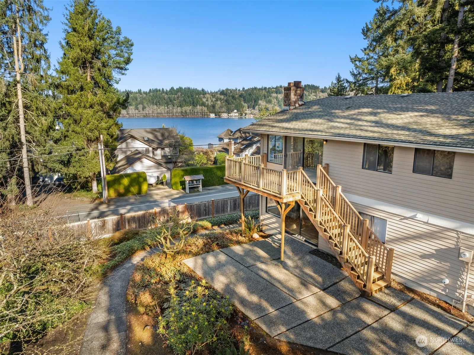 Rare opportunity to own a one-owner home with Lake Sammamish views on an oversized corner lot on a quiet cul-de-sac. Near Marymoor and Idylwood Parks, this location offers a great neighborhood close to Microsoft and more local employment. Upstairs living room has a wood-burning brick fireplace and tons of windows offering optimal light and Lake views. Even the kitchen has a view! Designed for varied lifestyles, including possible multigenerational living, with an extra-large bedroom and bath on the lower level, along with a family room with a wood-burning fireplace and wet bar. Home lives large at 2300SF & 5 bedrooms. Spacious, fenced yard. Side access-gate could accommodate parking an RV/boat. 2 car garage + additional parking.