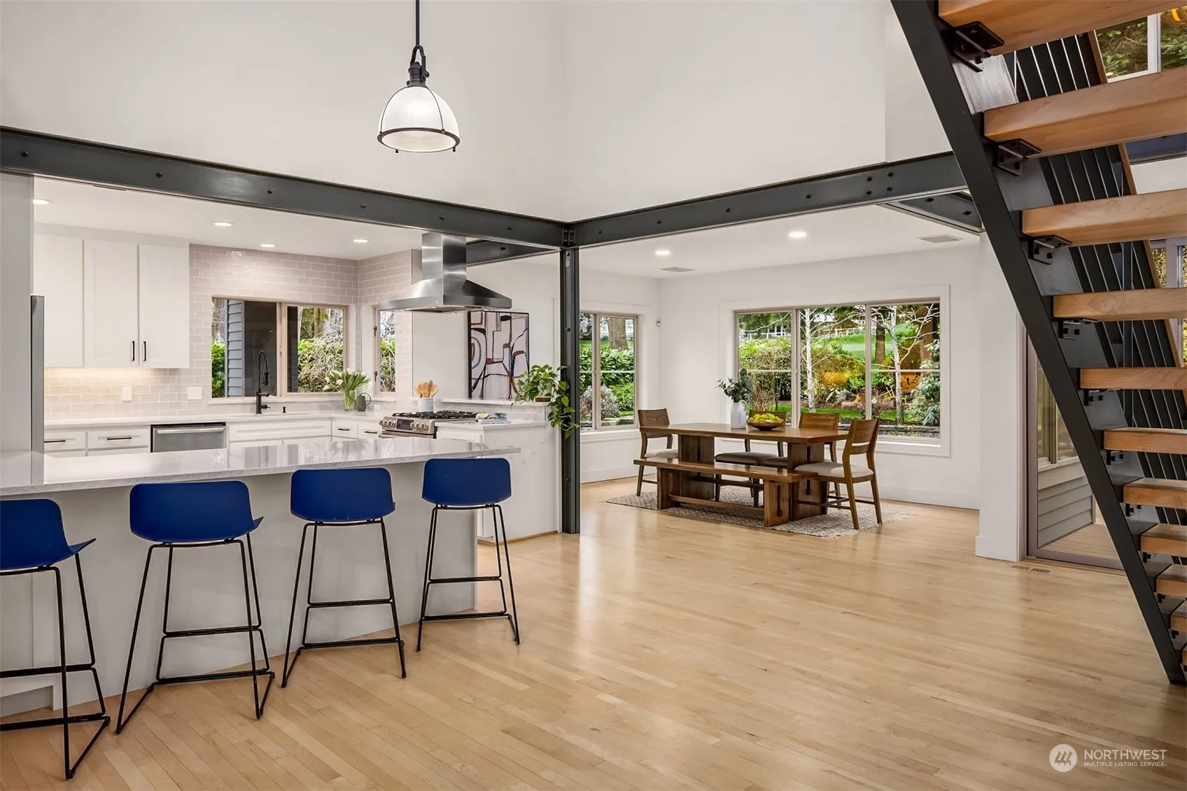 Custom Architectural home behind the #18 tee box at Wing Point Golf Course in the coveted North Hill Neighborhood. This striking and spacious, light-filled home has vaulted ceilings, impressive steel beam construction, clerestory windows and sky-lights. Fresh paint in and out, refinished maple flooring and a newly remodeled modern kitchen. Private main floor office with separate entrance. Large bonus room with extra wide exterior door; could also be a shop/maker space. The five, generously-sized bedrooms, are all upstairs. Fantastic entertaining spaces flow easily to the expansive deck overlooking the mature landscaping and golf course. Close to the Wing Point Country Club, Winslow and ferry. This is refined island living at its best.