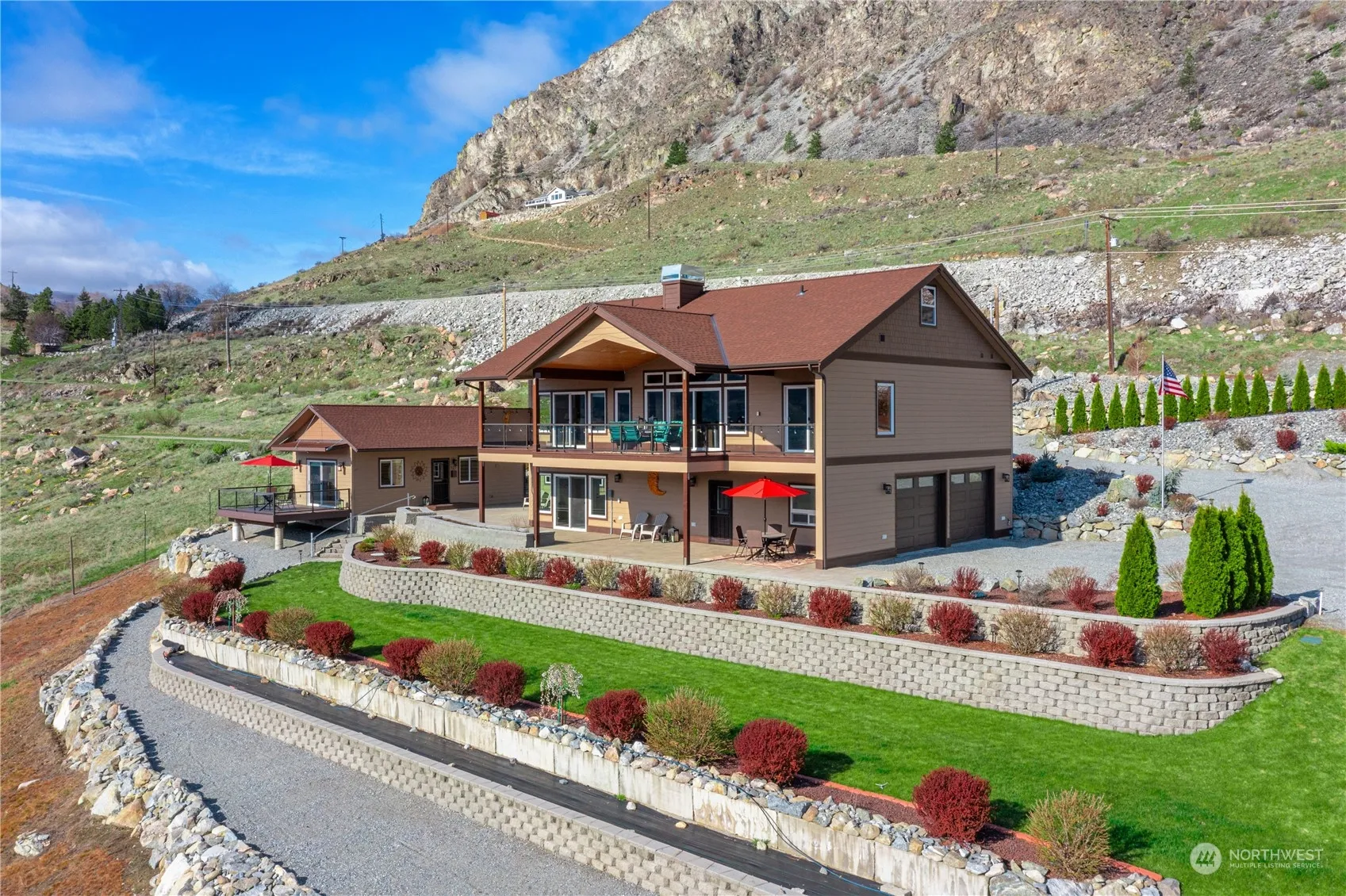 Experience unparalleled views overlooking the Columbia River located less than 3mi from downtown Chelan. Featuring a main level w/ a light-filled kitchen, great room w/ vaulted ceilings & stone fireplace, large primary suite & bath w/ walk-in closet, radiant heated tile floors, glass & tile shower, 2nd bd/bth & sliding doors off all 3 rooms leading to an epic view deck for the best in indoor/outdoor living opening onto terraced/landscaped grounds. The lower level features a 3rd bth & bonus room/3rd bd that opens onto a lower level courtyard patio area & leads to the separate 1bd/1bth ADU/Guest House complete w/ kitchen & private deck. Attached 2-car garage w/ built-in storage plus a bonus detached garage w/ 12×18 doors & upper storage loft.