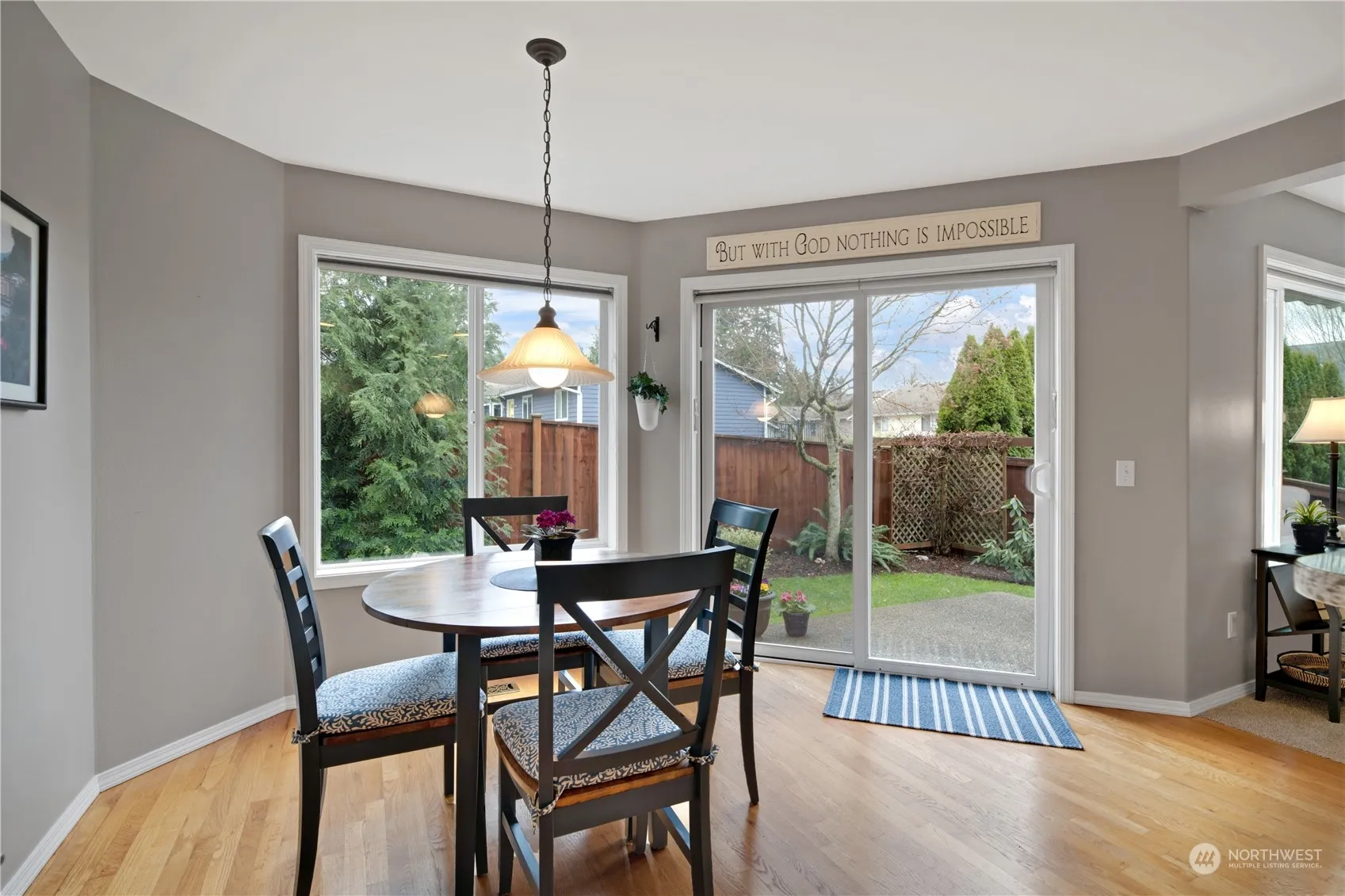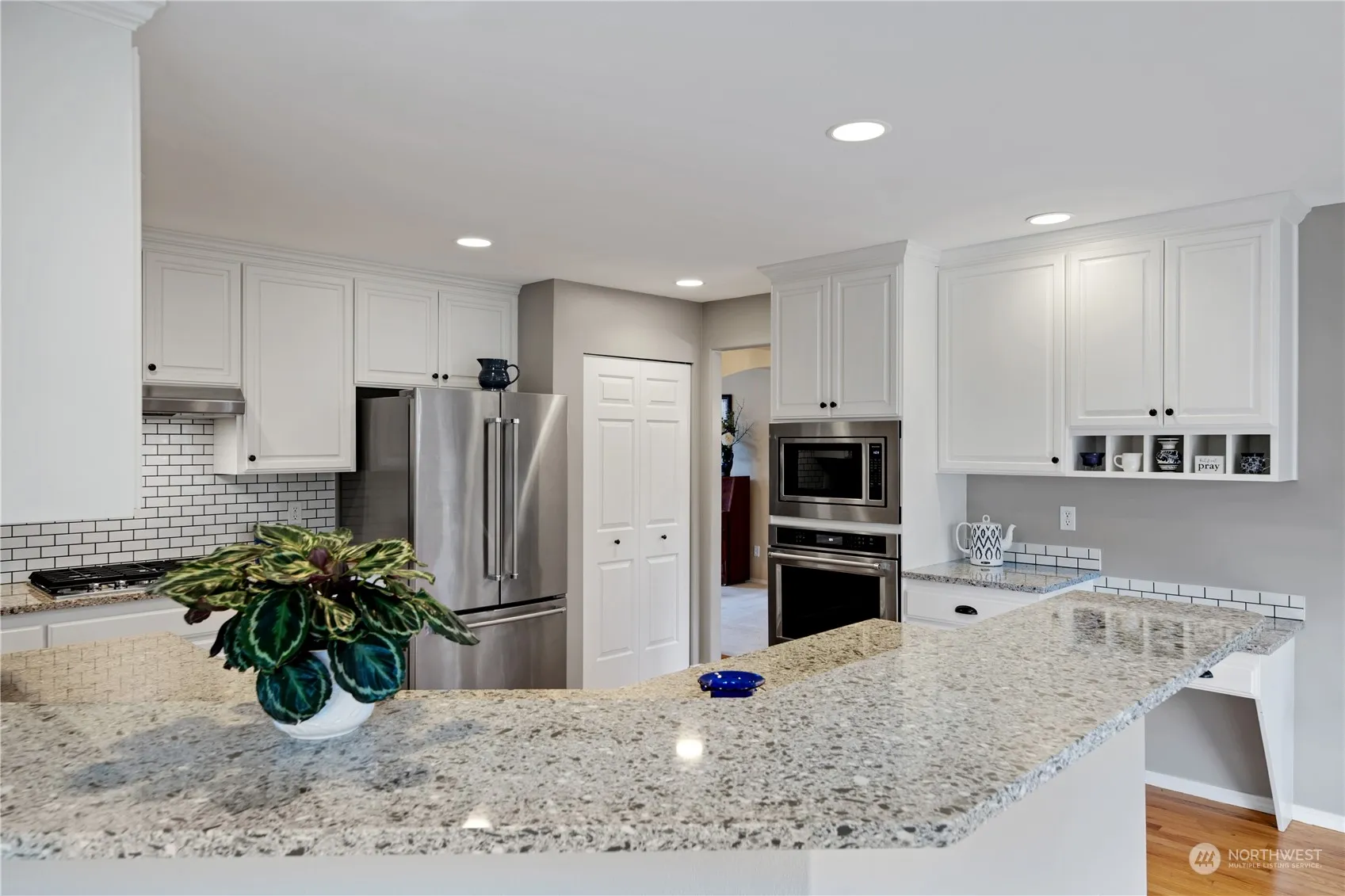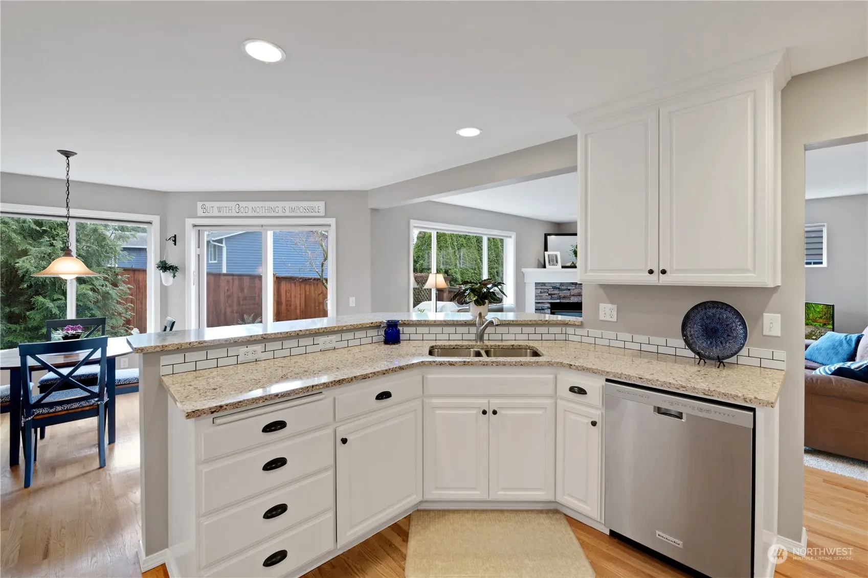 Neat as a pin and located in Northshore School District on a dead end street facing north. Kitchen with eating space and sliding door to back yard are open to a family room equipped with a gas fireplace. Updated kitchen boasts quartz counter tops, updated cabinets and newer appliances. Formal dining has wainscoting and coffered ceiling. Living room feels open and bright with high ceilings and open spindle staircase. Office on the main floor has a closet and could be used as a 5th bedroom. Primary bedroom has a double door entry and a gas fireplace. Large en suite bath has great counter space with dual sinks, walk in closet, separate shower and soaking tub. Fenced backyard, patio with a roll up sun shade.