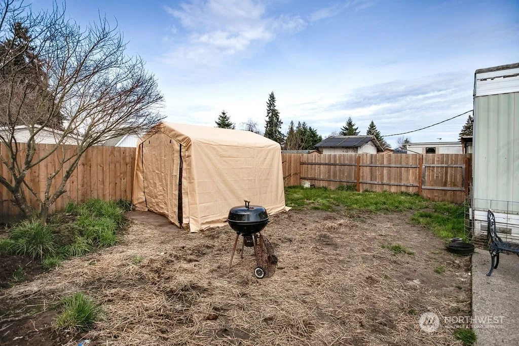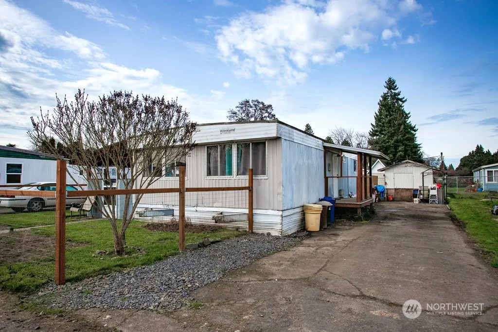 This 2 bed 1 bath home is ready for your personal touch. The home has a covered front porch – a fully fenced front and back yard – a long driveway with space for up to 3 vehicles – a shed for all your storage needs – and a nice sized fully fenced back yard with a patio and room for a garden, a play area or entertaining. Best of all, space rent is only $455./mo.! Conveniently located to Interstate 5, entertainment, shopping, and recreation. SELLER CAN DO NO REPAIRS – Home to be sold AS IS.