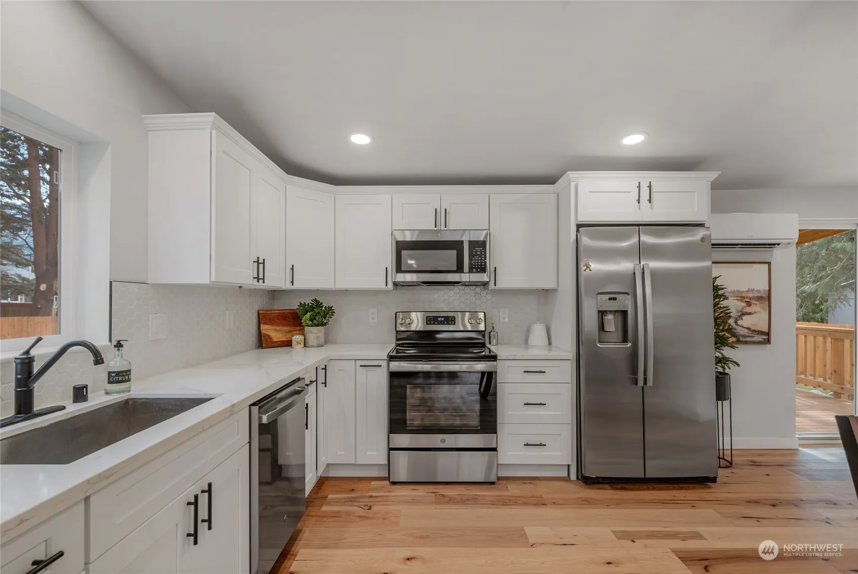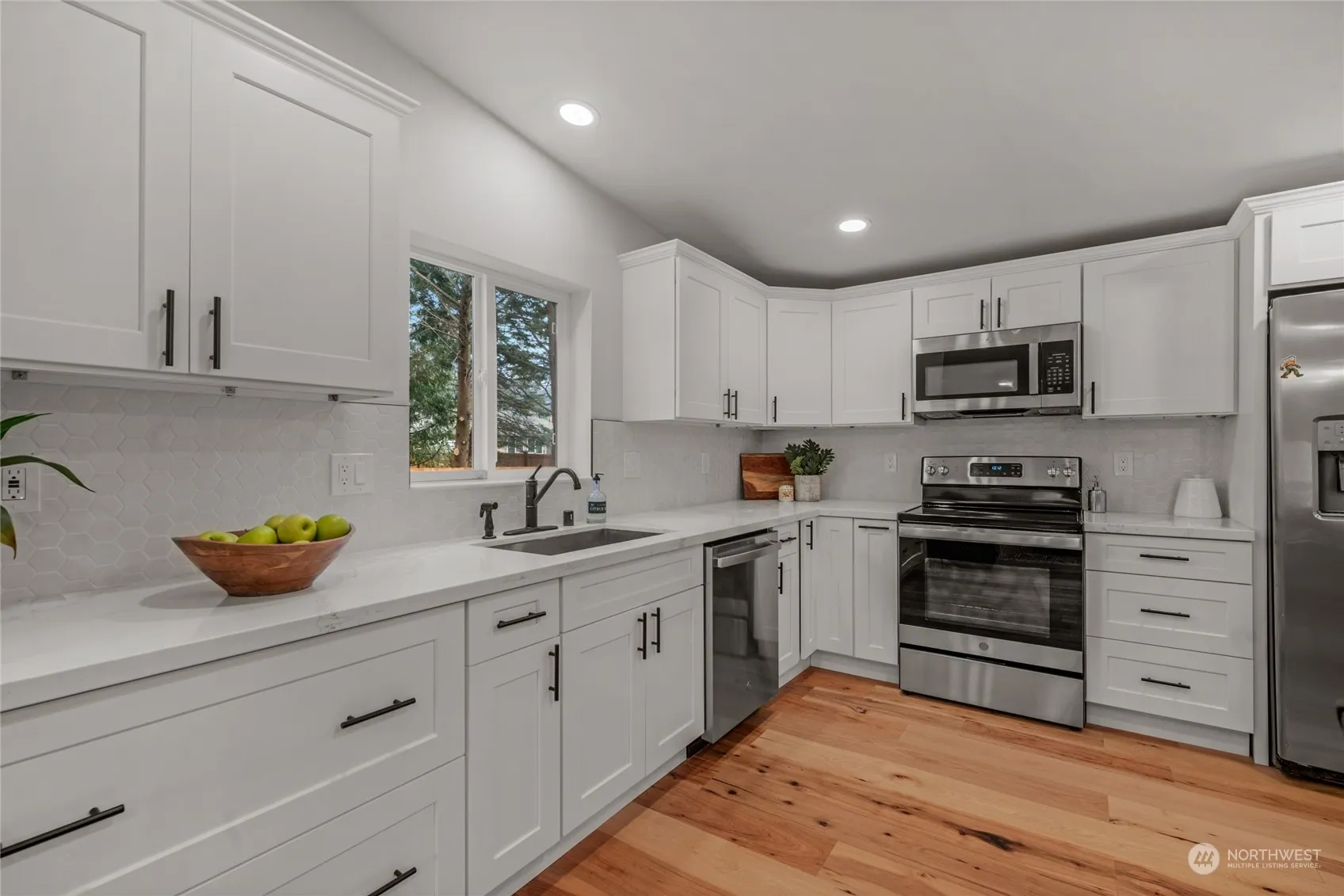 This stunning remodel features, three bedrooms, two bathrooms, new kitchen cabinets, quartz, countertops, stainless steel appliances, including washer, and dryer, open, living concept, new hardwood floors, custom tile work in bathroom & kitchen & spacious deck perfect for BBQing & entertaining. Situated on a meticulously landscaped, fully fenced lot with a detached garage (EV parking charger). Nestled in the picturesque town of Gold Bar, this property boasts breathtaking mountain views that will leave you in awe. The City of Gold Bar has plans to pave the front road by summer.