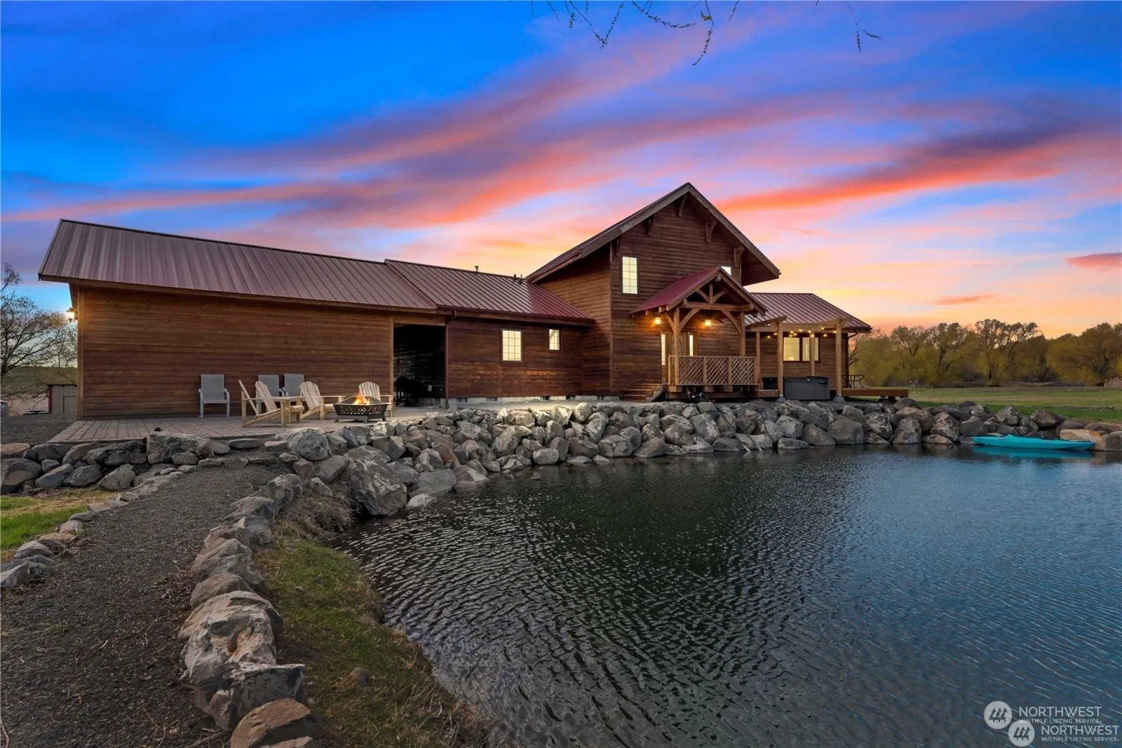 Peaceful country privacy on 20 acres. 16 acres of production Timothy hay with KRD irrigation water and a 100×120 hay pad for storage. Custom cedar home with 2245 sf of open floor plan, designed with post and beam for an elegant look and structured insulated panel system and triple pane windows. Primary suite is an open loft that that provides a beautiful Western view. Custom kitchen boasts beautiful soap stone counter tops and SS appliances. Back yard has a swimming pool, concrete patio with firepit, irrigated yard, garden, and fruit plant beds. Front hot tub overlooks artesian fed year round pond with rock water feature. Front deck leads to custom paver patio for BBQ’s. Two car garage and a 40×60 shop that includes 800 sf space with bath.