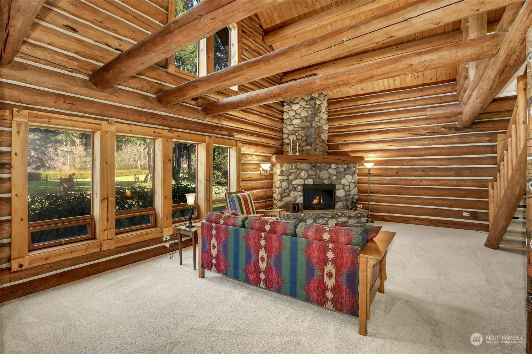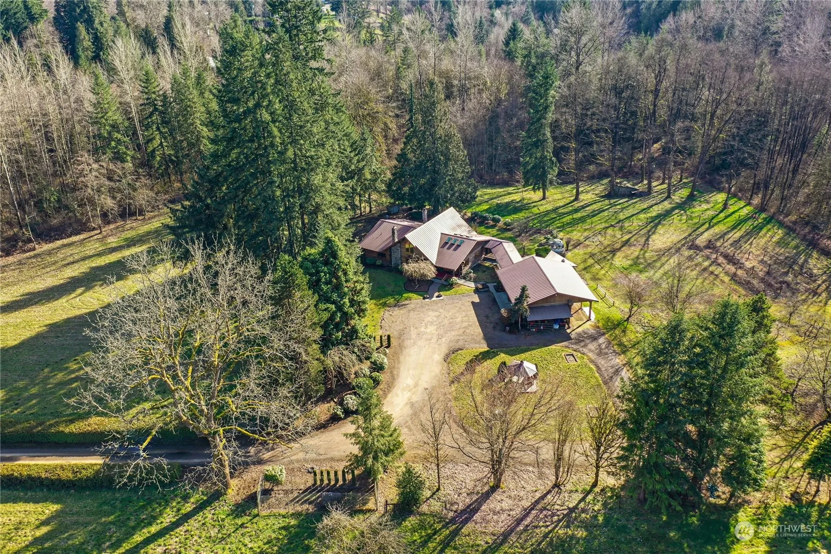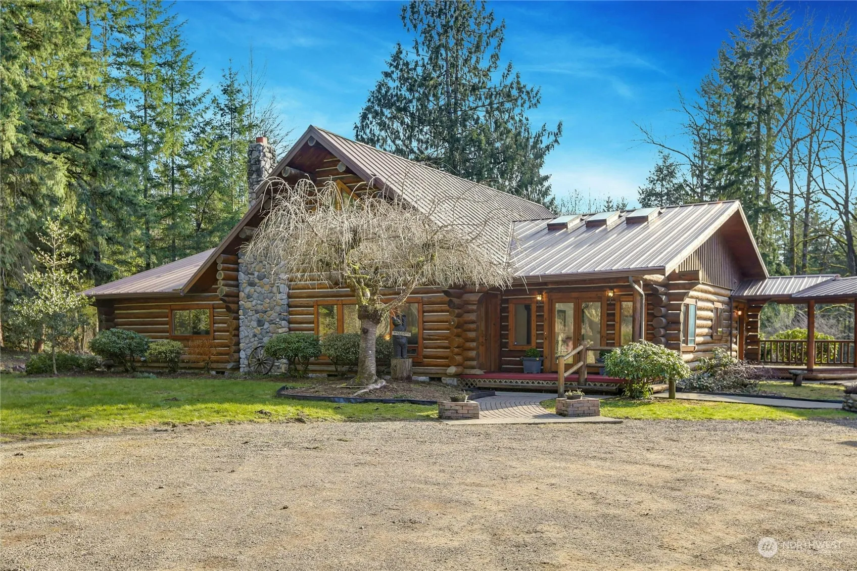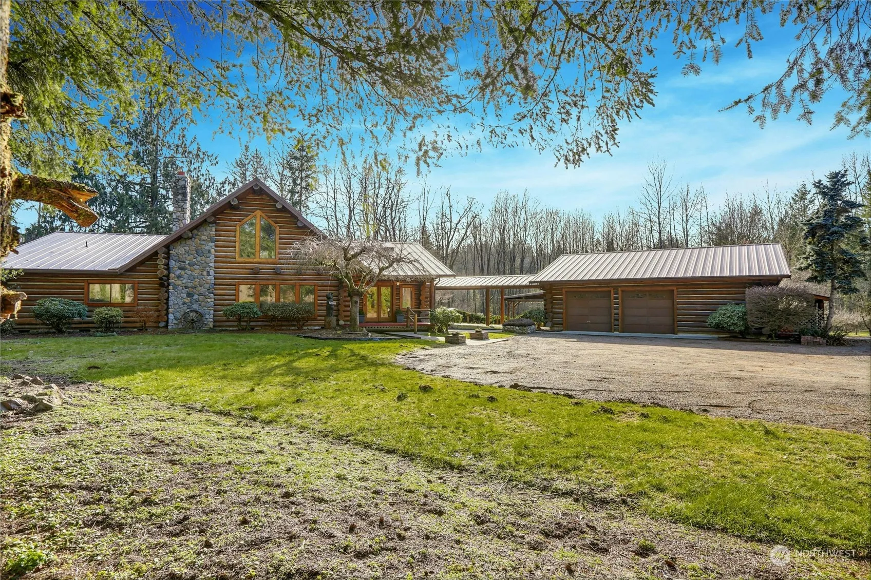 This is a rare opportunity to own a custom built, deluxe log home on almost 40 acres. It is the perfect blend between super cool, and charming w/open beam ceilings, exposed logs, 2 river rock fireplaces, and front & back covered porches. There is just the right amount of drywall to allow for art, and furniture placement. Main bedrooms have ensuite baths & walk-in closets. The large open loft w/covered deck, could be a 3rd bedroom. The property features are too numerous to list, but there is a covered patio w/river rock fireplace/BBQ, a greenhouse, and orchard. X’tra large garage w/workshop and RV sized carport. Just 20 minutes to the eastside & 45 minutes to DT Seattle, it makes living the dream in this must see home, easy and convenient.