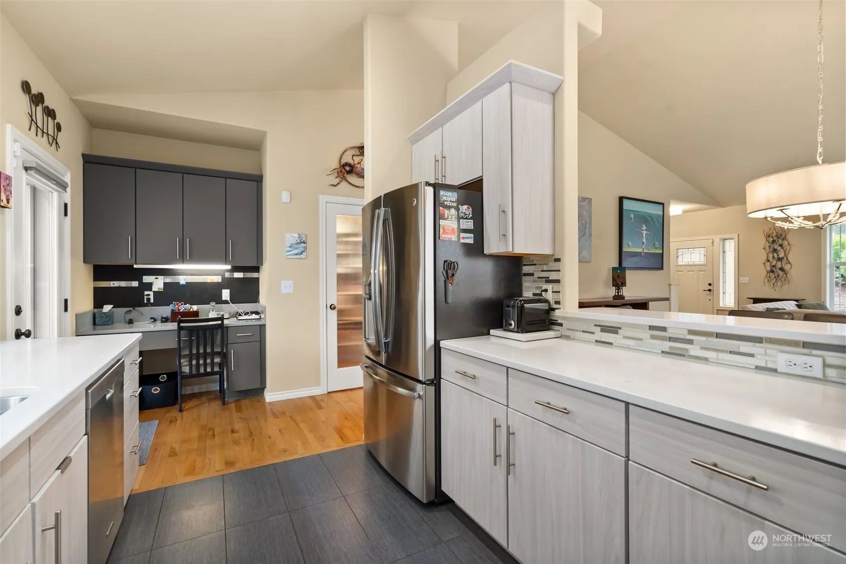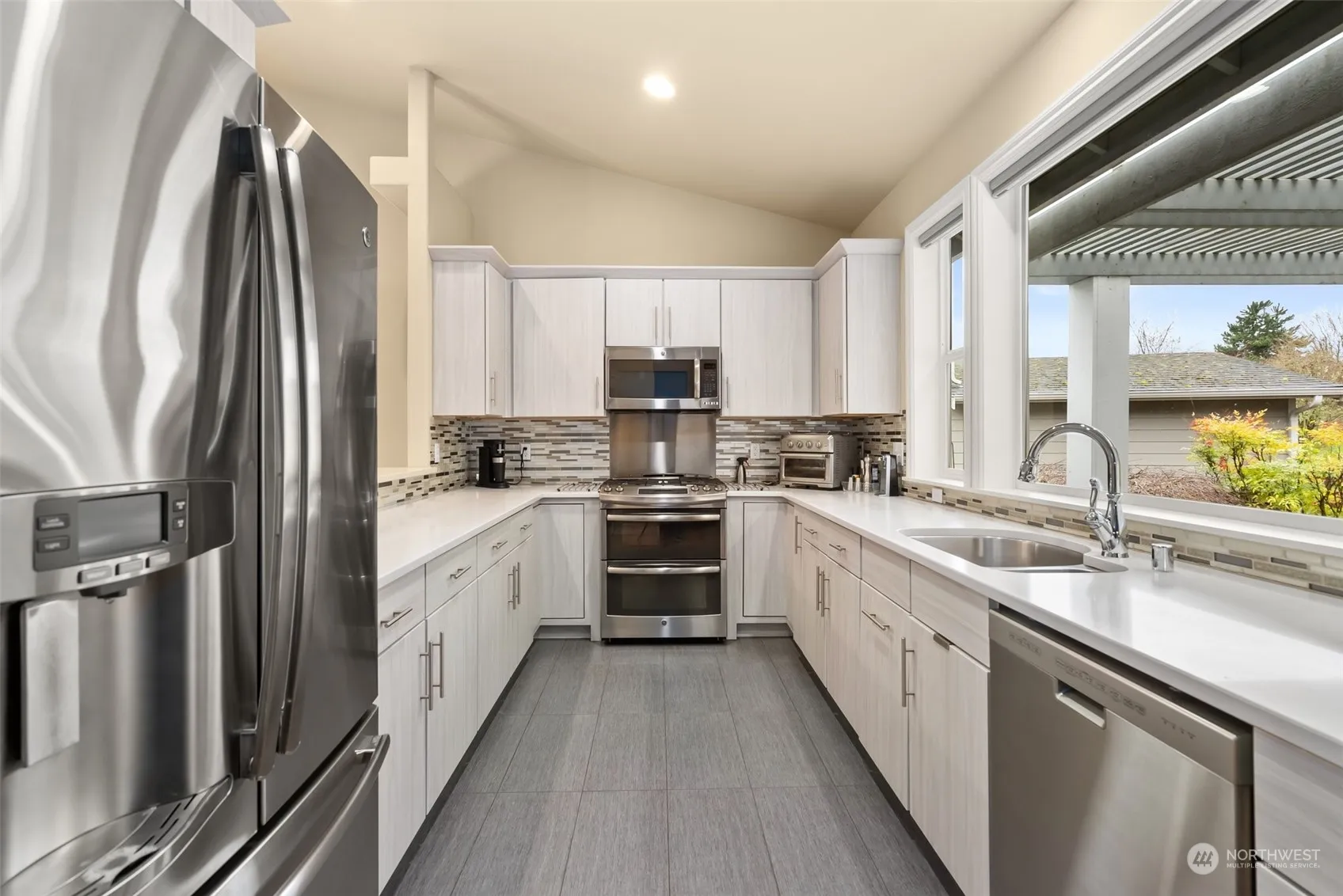 A meticulously upgraded home boasting contemporary flair and functional elegance that features a versatile floor plan with dual primary suites! The main floor suite boasts hardwood flooring, a walk-in closet with California closet system, and a newly upgraded 3/4 bath. Upstairs, the expansive suite dazzles with a luxurious 5-piece bath showcasing granite counters, a soaking tub, tile floors and another amazing walk-in closet. Enjoy the modern allure of the kitchen, adorned w/quartz counters, tile flooring, cabinet pull-outs and convenient desk area, seamlessly connected to the patio with pergola. Recent new roof & whole house generator. Storage galore & an oversized garage too! Convenient location close to I-5 access, shopping & schools!