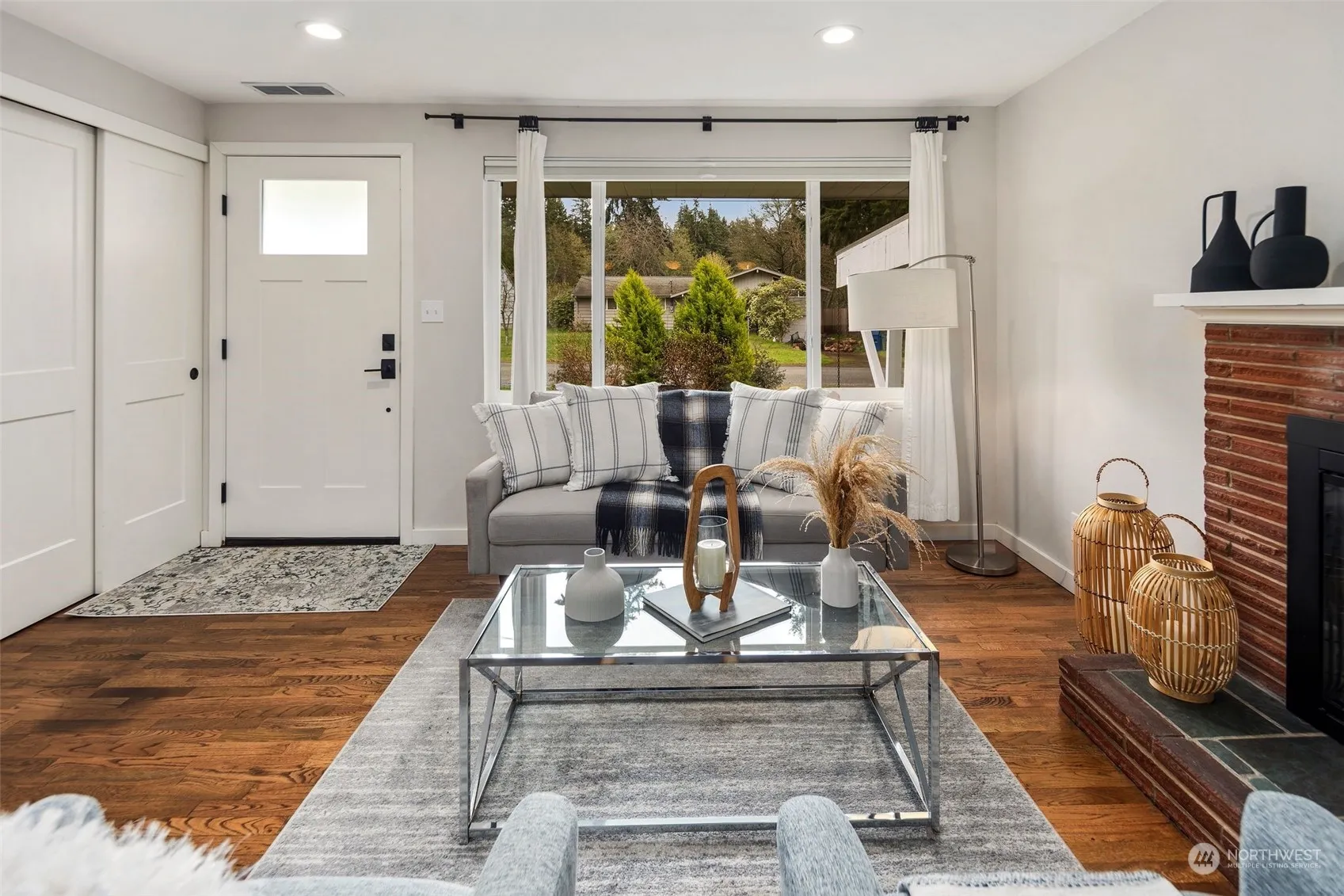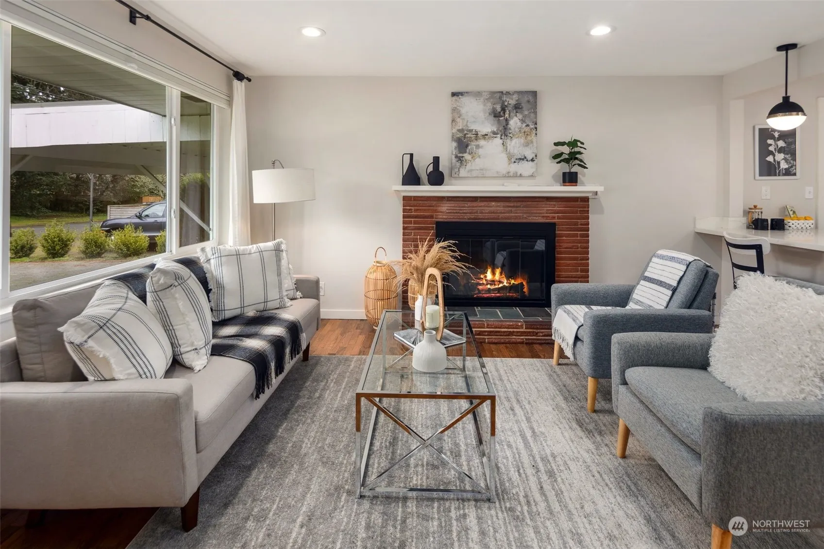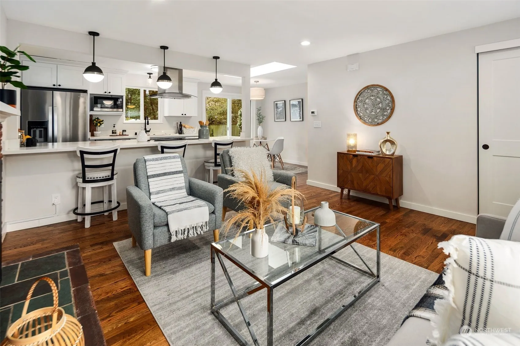 Turnkey 4-bed Forest Glen rambler on nearly ¼ acre level lot. Open plan great room w/ large windows & skylight. Original hardwoods throughout. Modern kitchen has 2-toned shaker-style cabinetry, quartz counters & black hardware. Accented by globe pendant lights w/ industrial edge. All appl SS. Rec-rm off kitchen extends entertaining. Laundry rm w/ storage & tons of space could double as workout rm or office. Washer/dryer new 2020. Updated full bath w/ subway tile & quartz counter vanity. Slider off dining opens to fully fenced backyard w/ storage shed & patio. Madrone tree adds charm. 2-car Carport +driveway & off-st parking. Roof replaced 2021; furnace 2020; water heater 2019. Friendly community w/ events. Moments to parks & Edmonds Bowl.