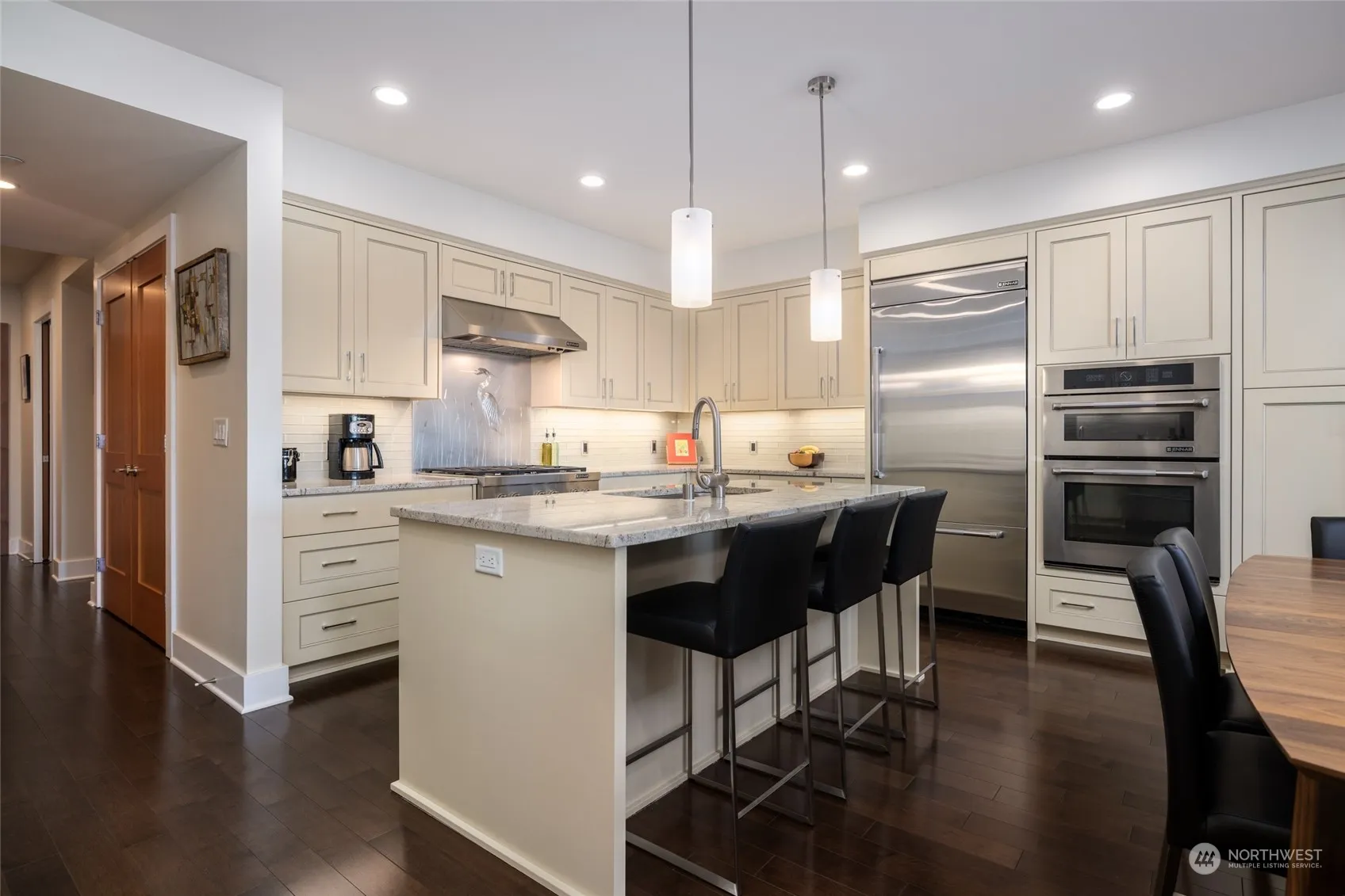 WATERFRONT, ground level condominium with just steps to the beach offering 1621 s/f & high-end finishes. Open floor plan viewing Semiahmoo Bay, BC. & gorgeous sunsets! Lg primary bedroom ensuite overlooks the sandy beach & bay. Guest bedroom also has a private ensuite. Separate den/office off the entry & 1/2 bath. Beautiful travertine surround gas f/p in the living room, built-in cabinets with custom lighting & dining area. A gourmet kitchen with stainless appliances, lg eating bar & abundant storage. Outdoor living with a Lg covered patio off the living room offering privacy and spectacular views! Enjoy the wildlife, beach, walking paths, marina, trails, park, resort & more. Two assigned garage parking spaces and a storage unit.