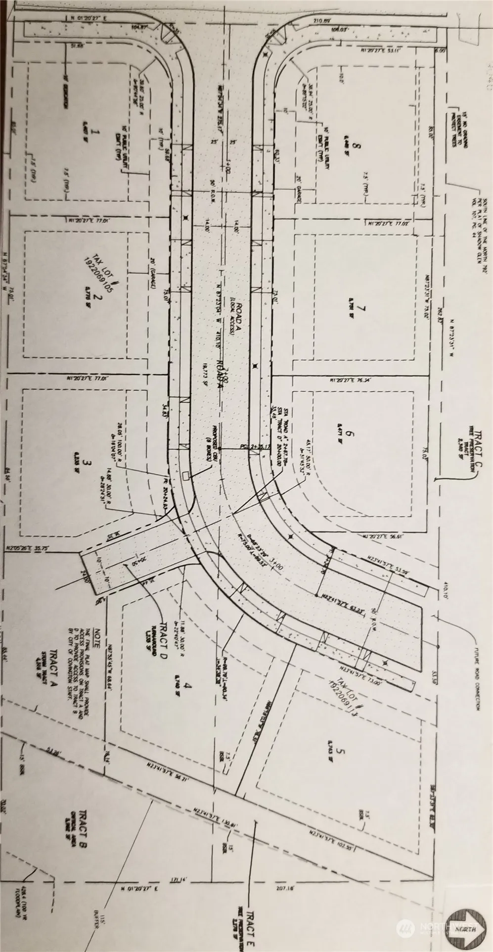 Lot 6 is on a curve, West side is 76.34 feet deep and North property line is 75 feet wide corner lot, part of new 8 lot subdivision, currently a dead end street. Other lots are available for sale. CC&R language is proposed and is not recorded, will be recorded prior to closing with Buyer review. A 1/8 responsibility for Puget Sound Energy Street Light electricity, bill averages about $50.00 per month therefore $6.25 per lot per month Park at street entrance and walk lots, or use key box at Entrance.