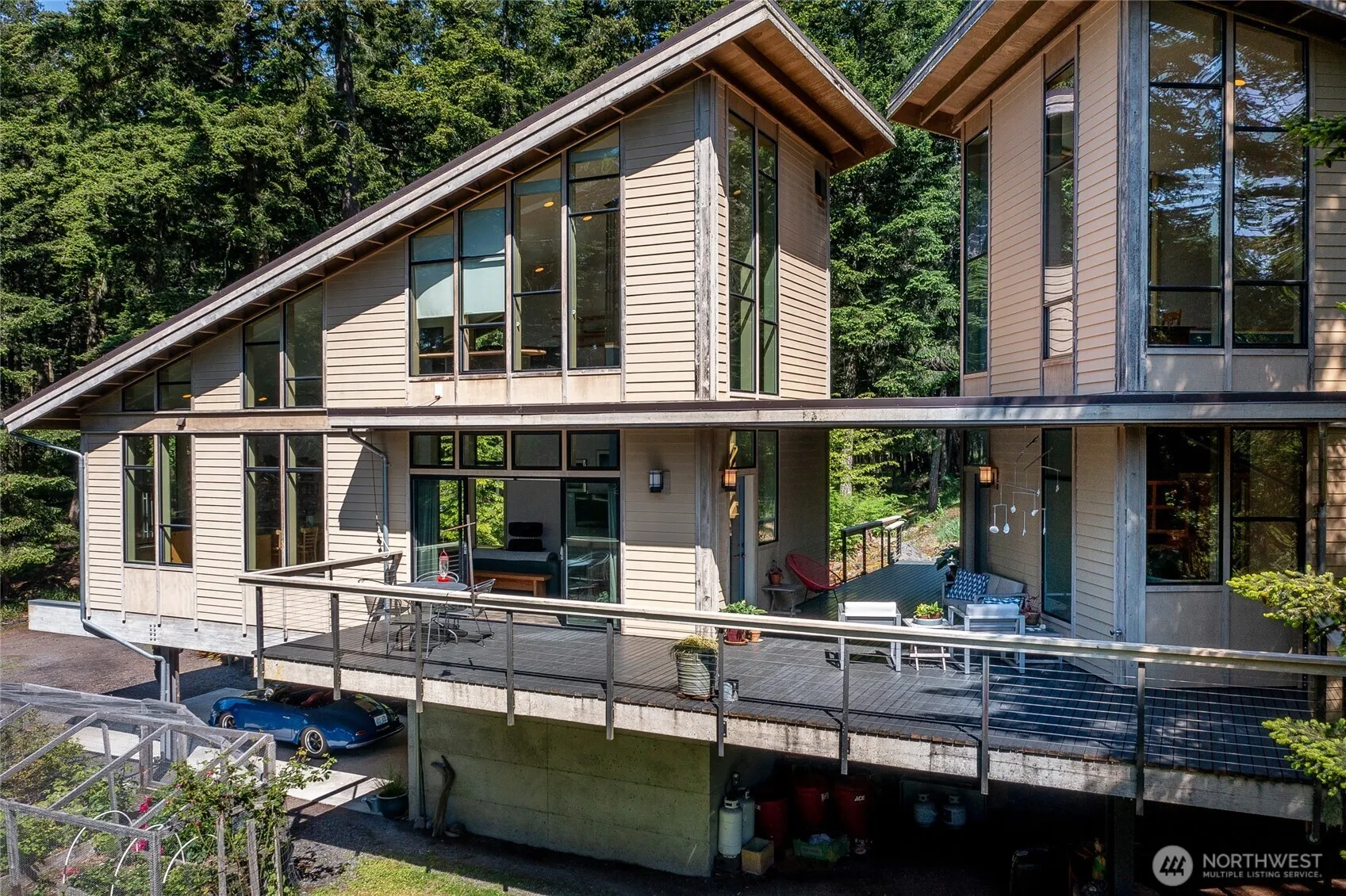 Harmony with Nature. Perched atop scenic Pioneer Hill, this custom-designed Ben Trogdon home offers 2,145 sq. ft. of modern living on a 3.59 acre parcel. A dramatic cantilevered great room features soaring vaulted ceilings and wall-to-wall windows, highlighting radiant concrete floors, a gourmet kitchen, and sleek, minimalist design throughout. Features include solar power, an EV charger. high-speed Doe Bay Internet, and connected to Doe Bay Water System. Enjoy private trails and peekaboo south-facing water views. A detached two-car garage with workshop completes this exceptional property—just minutes from the amenities of the Olga Store and Doe Bay Resort.