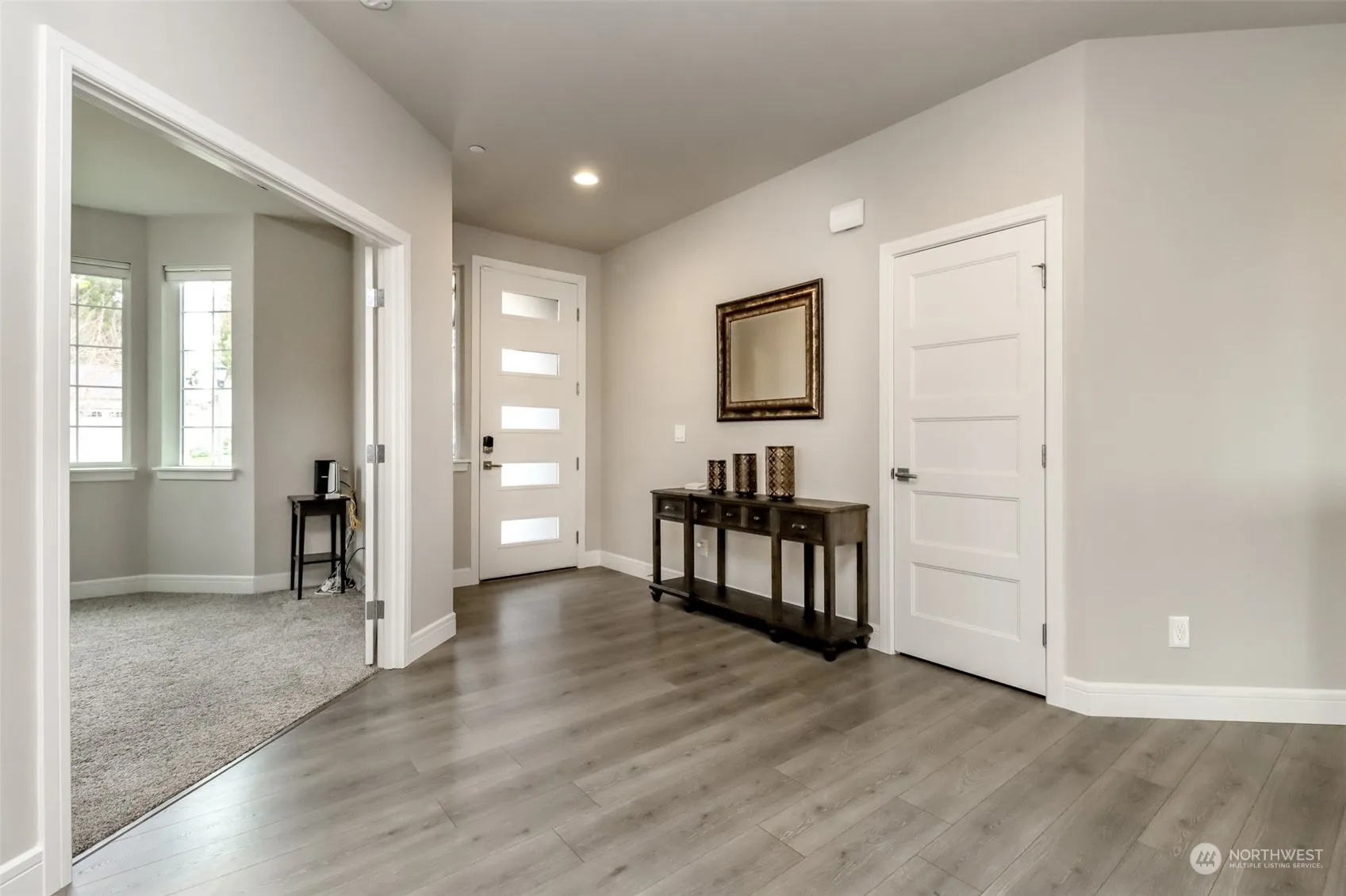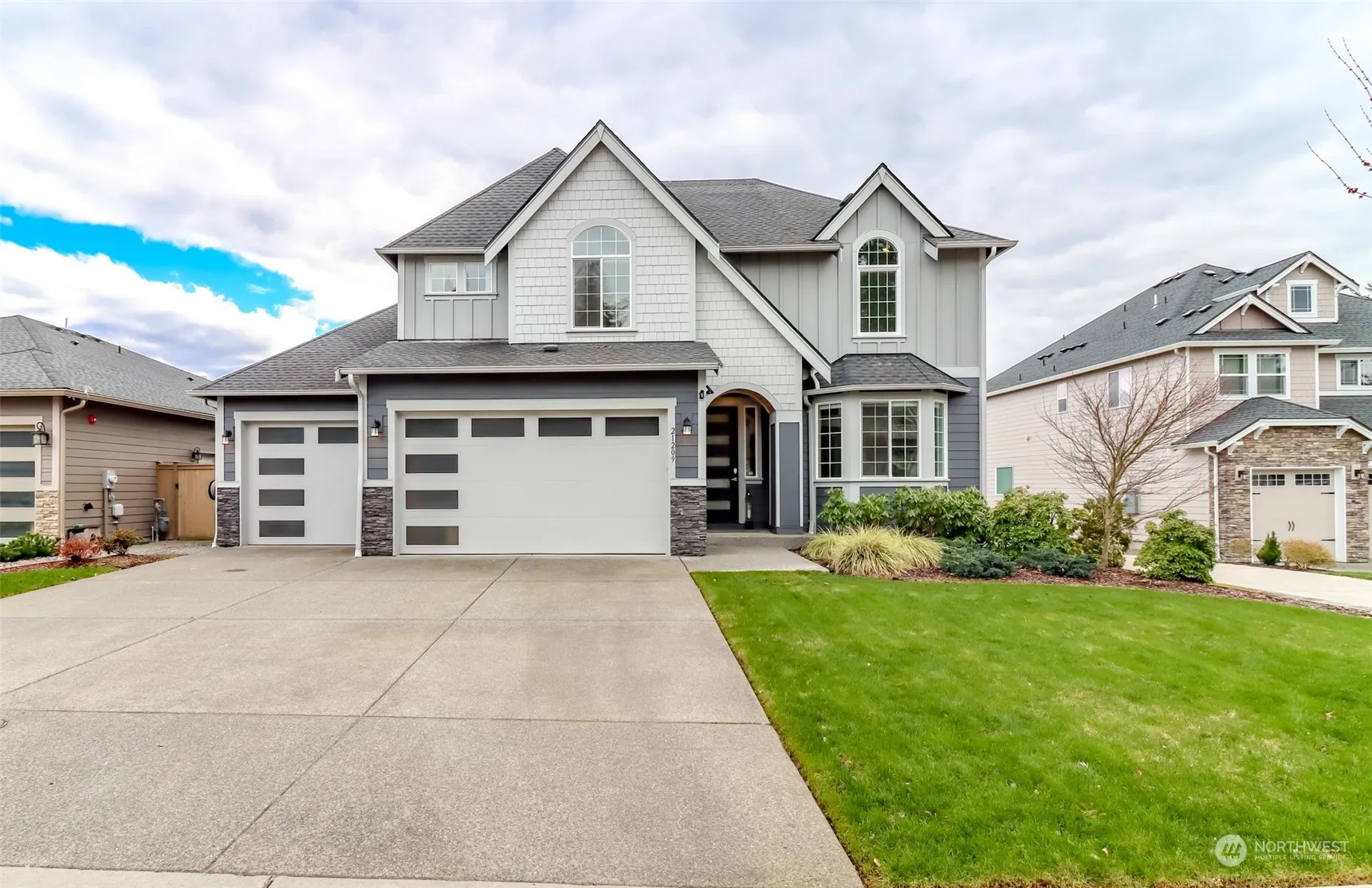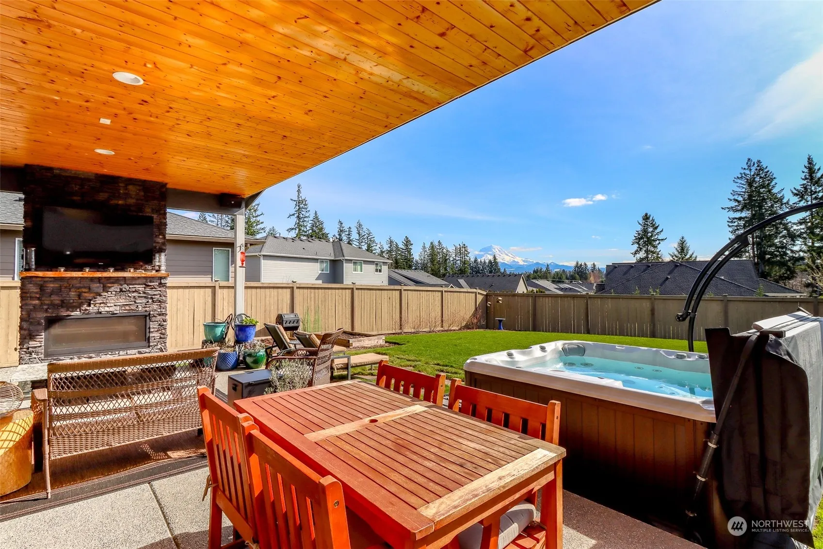 Stunning 5 bedroom home w/views of Mt. Rainier! Beautifully laid out for maximum indoor and outdoor enjoyment. Chef’s kitchen w/ quartz countertops opens to living room w/gas fireplace & separate dining room. Enviable covered outdoor living space including plumbed fireplace, built-in grill, smoker, hot tub & outdoor speakers. Main floor office, plus 5 bedrooms upstairs. Primary suite w/view, vaulted ceilings & ensuite 5 piece bathroom. Upstairs 5th bedroom currently is a home theater. Wired for EV + generator, tankless hot water, A/C. 4 car garage w/room for hobbies! Minutes from Lake Tapps, Costco, shopping & golfing plus nearby water & snow sports! Located in Stone Creek w/fully fenced yard w/sprinkler system on quiet cul-de-sac.
