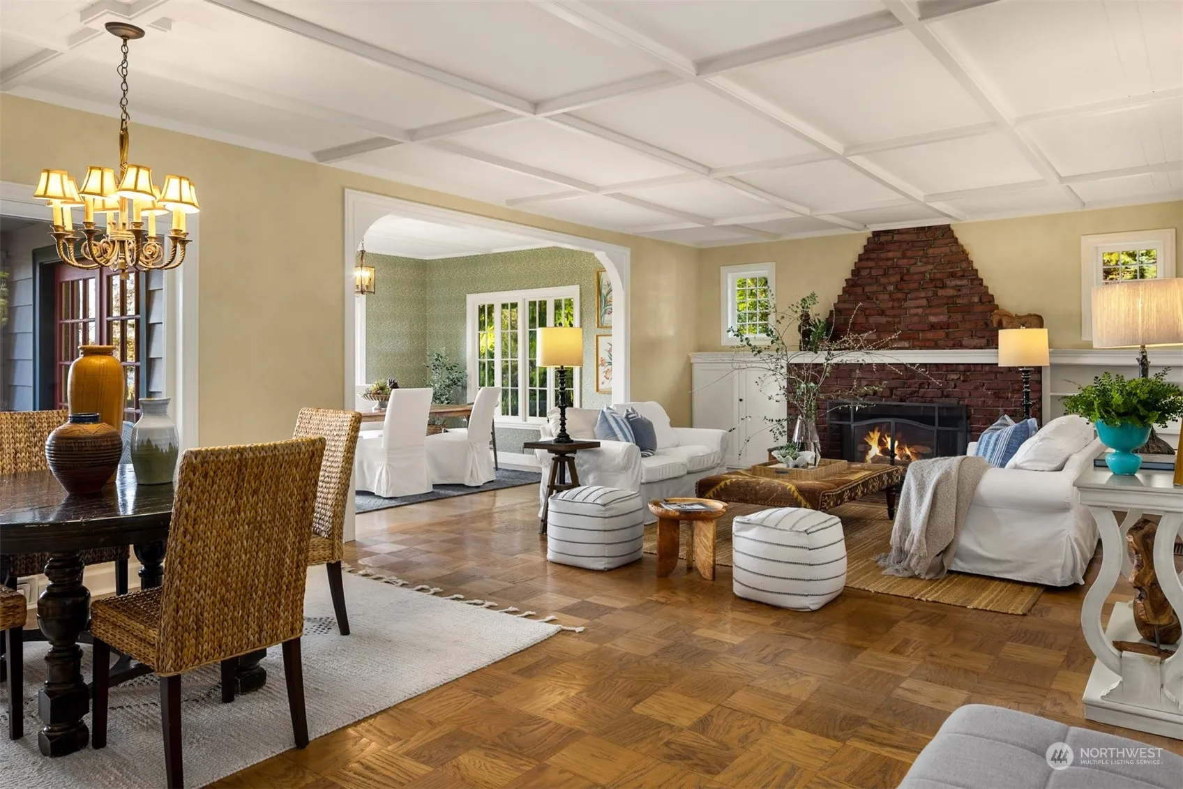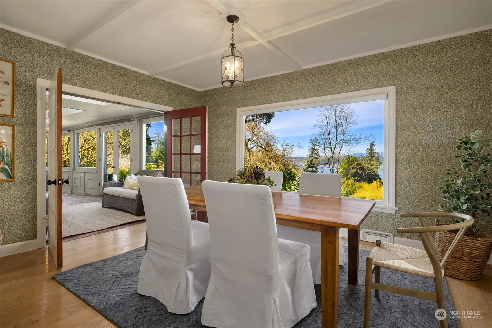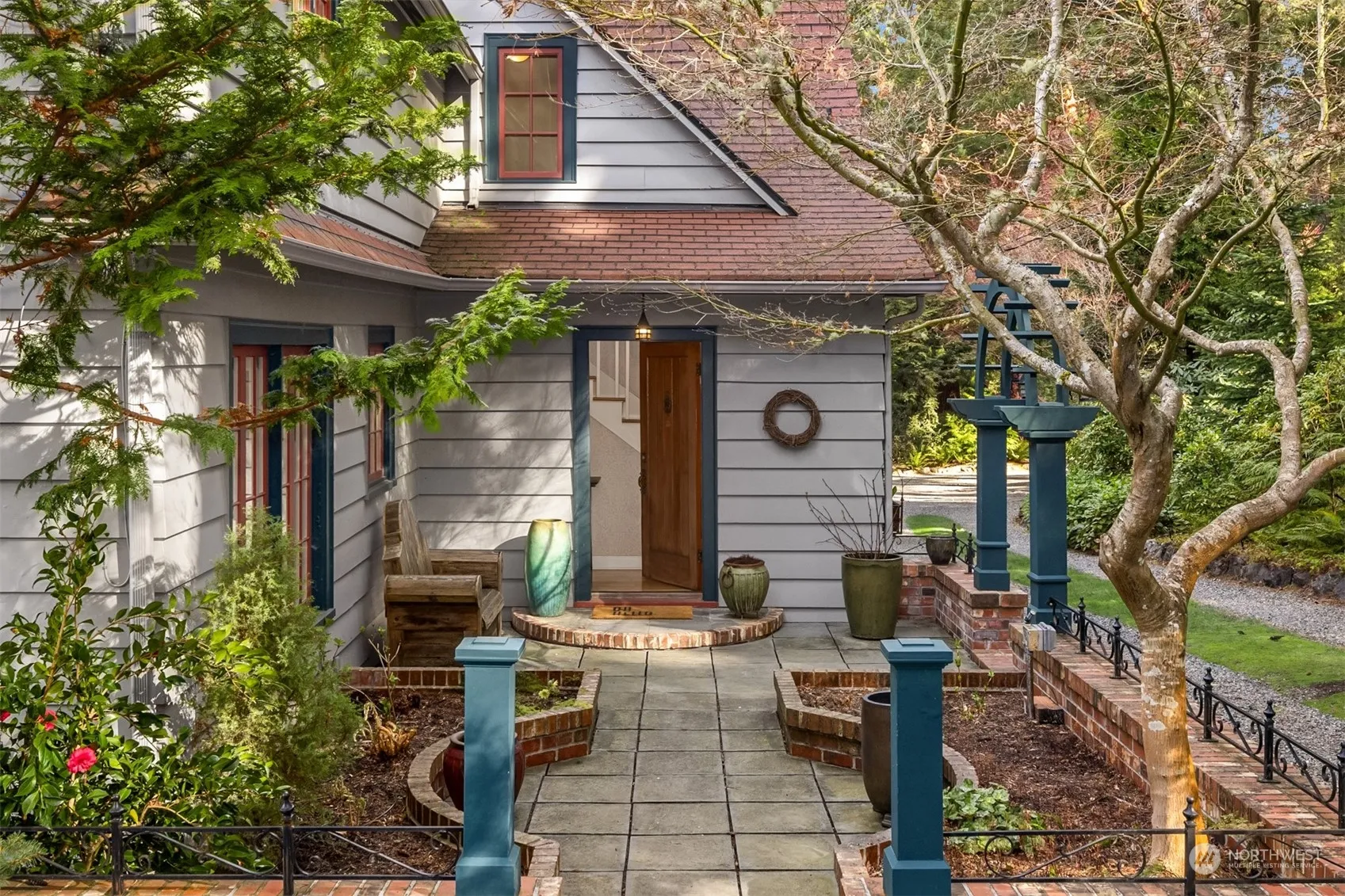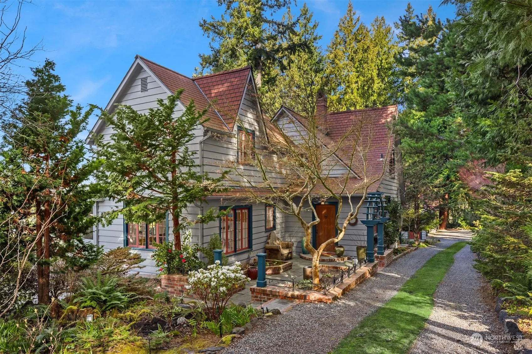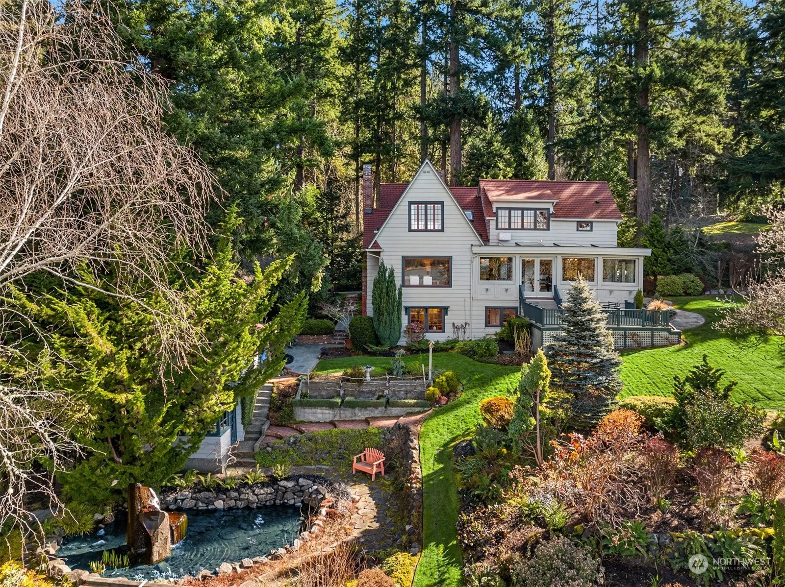 Extraordinary heritage home on 1.42 acres with breath-taking west-facing Sound & Olympic Mt. views, 15 feet of waterfront and a permitted mooring buoy. Serene garden, formerly on BI Garden Tour, includes lily pond with fountain, rose arbor, delightful studio & greenhouse, richly layered plantings, meandering pathways and majestic trees. Updated home brims with character featuring wood floors, bead and board paneling, a Clinker Brick fireplace, a story-book kitchen, expansive sun room, and spectacular views from every room through paned windows. A modern 3 car garage, with one bay opening tall enough for a boat, supplements the original garage suitable for smaller boats, kayaks, lawn furniture, and the croquet set. Come see this rare gem!