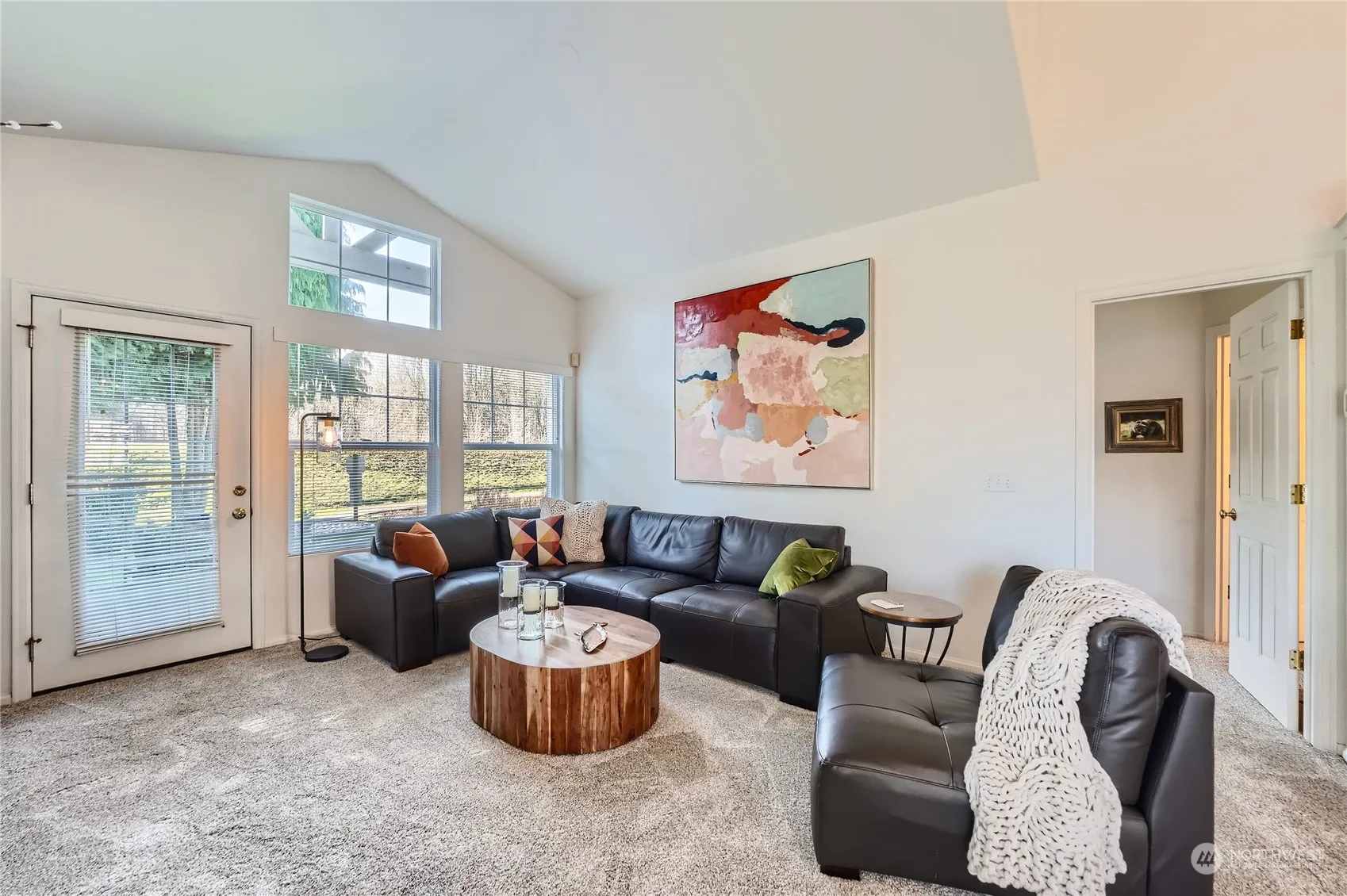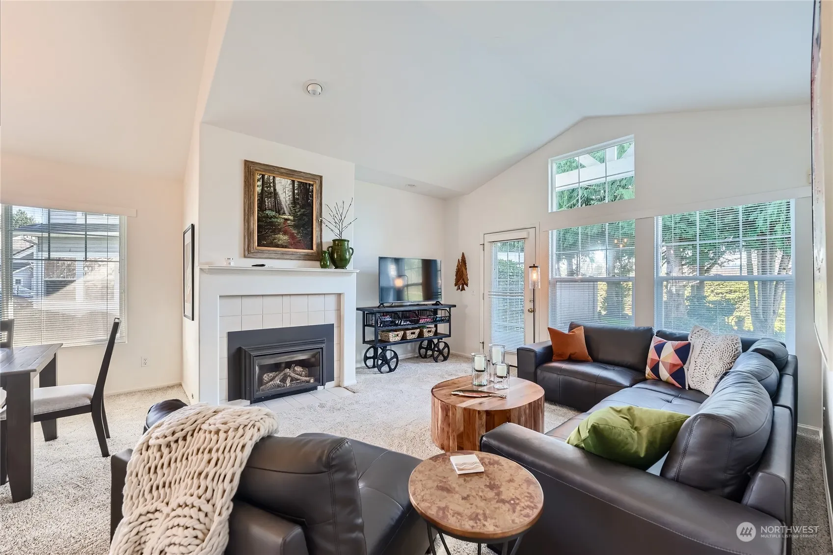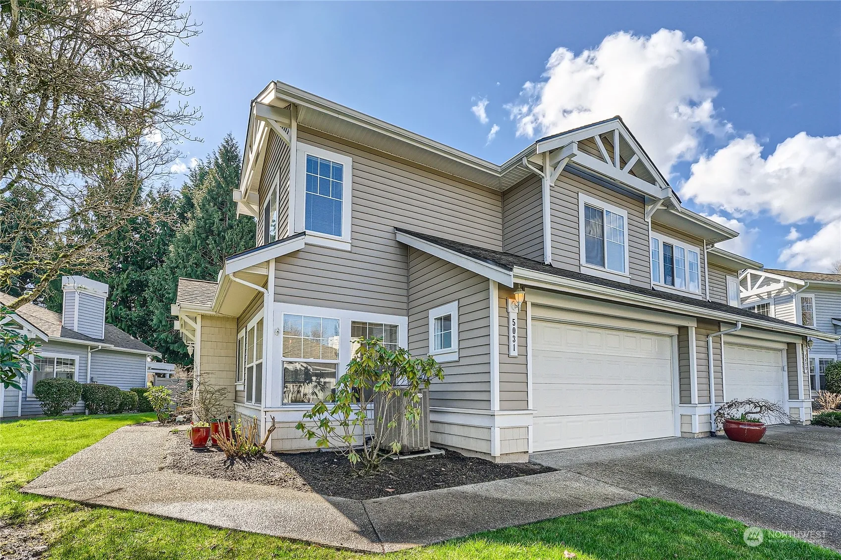 Level entry (no steps) home has a main floor primary suite with a five-piece bath and walk-in closet. Back yard patio looks out to the Green River Trail, no homes behind it and miles of walking, bicycling etc. just beyond your back door. The living/dining rooms have two story vaulted ceilings with a loft den/office above. Two bedrooms and a full bath upstairs. Convenient guest bath and laundry on the main floor. Gas fireplace and efficient gas heat with central A/C. Nice quality updated baths and showers. Secure parking in the two-car attached garage. Situated in Marina Pointe, the premier gated community at The Lakes featuring community parks and trails. Convenient to Sounder commuter train, light rail, interstate 5 and SeaTac Airport.