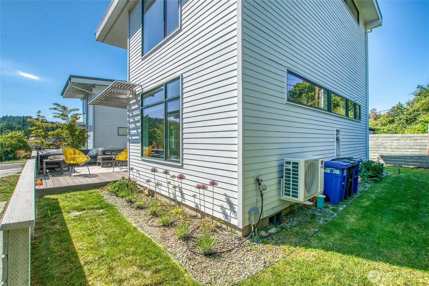 Modern 3-bed/1.75 bath home and popular vacation rental in downtown Eastsound, featuring bright interiors with vaulted ceilings, contemporary finishes, stainless steel appliances, and an open layout. This turnkey, fully furnished two-level residence offers excellent investment income potential, a weekend escape, or a convenient full-time residence in town. Sunlight floods the home all day, where you can enjoy partial views of Fishing Bay and Indian Island. Lawn space and a deck are perfect for summer relaxation and entertaining. Includes off-street designated parking and private storage. Just steps from Eastsound’s beaches, library, shops, restaurants, and schools, this central location ensures convenience for guests and residents alike.
