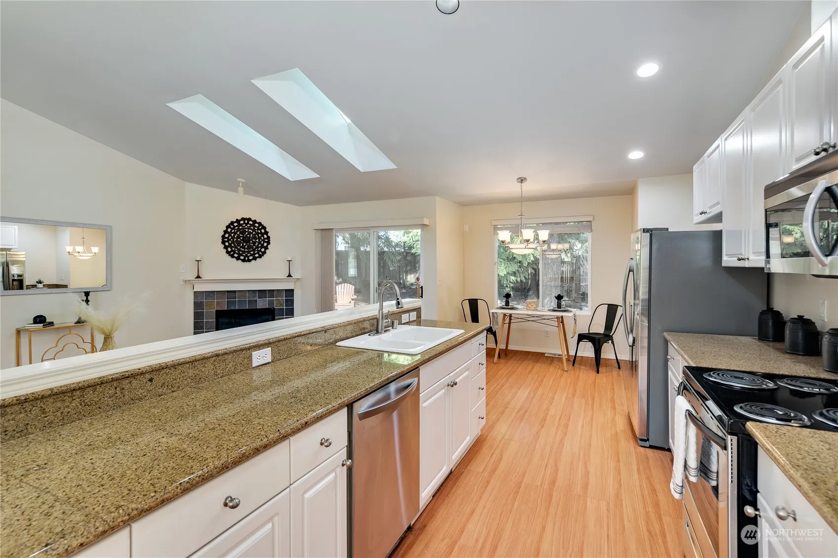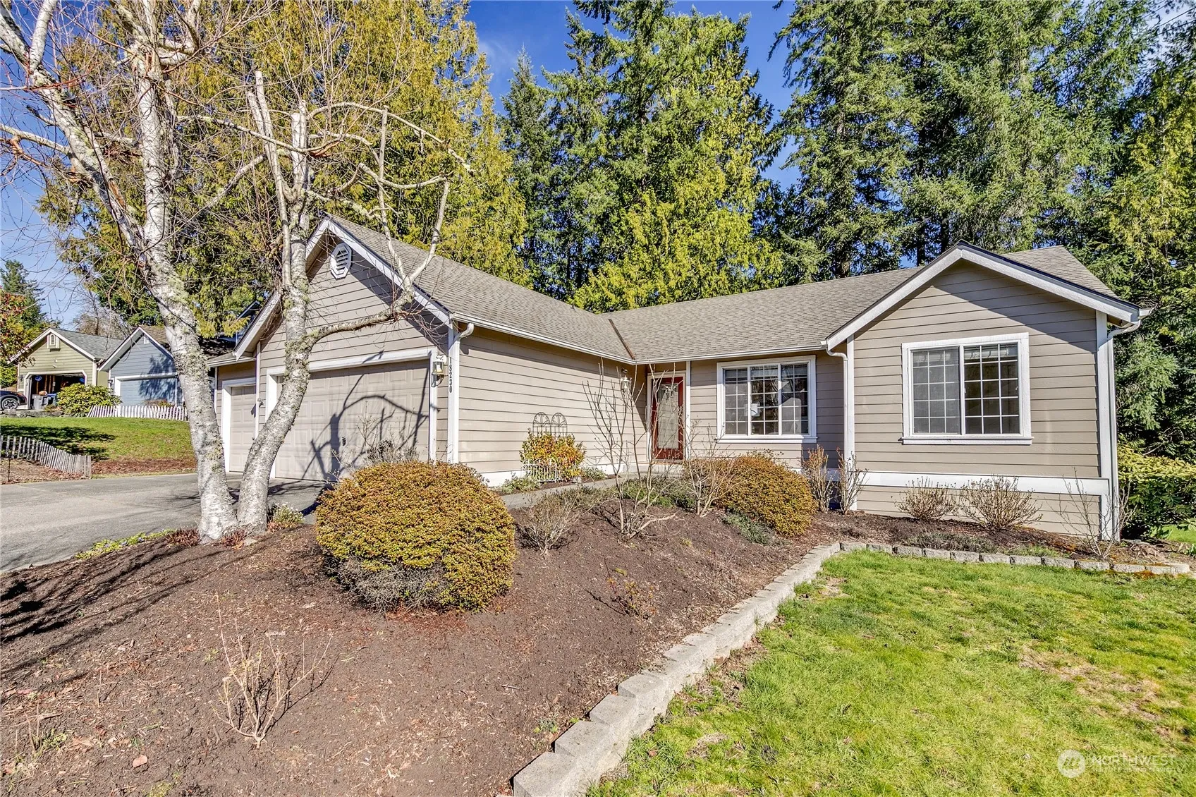 Looking for affordable single-story living in Poulsbo? Look no further! Large windows, vaulted ceilings & skylights bring ample daylight into this cheerful home. The living room greets you as you come in the front door. The kitchen w/eat-in space features granite tile countertops, SS appliances plus plenty of storage, just right for all your cooking needs. The kitchen opens into the family room, perfect for entertaining and cozying up to the gas fireplace. The primary suite with 3/4 bath & walk-in closet occupies one end of the home. Two additional beds plus full bath occupy the other. Expansive decks, a 3-car garage & mature landscaping round out this sweet home. Newer roof, recently serviced furnace & gas fireplace. Don’t miss this one!