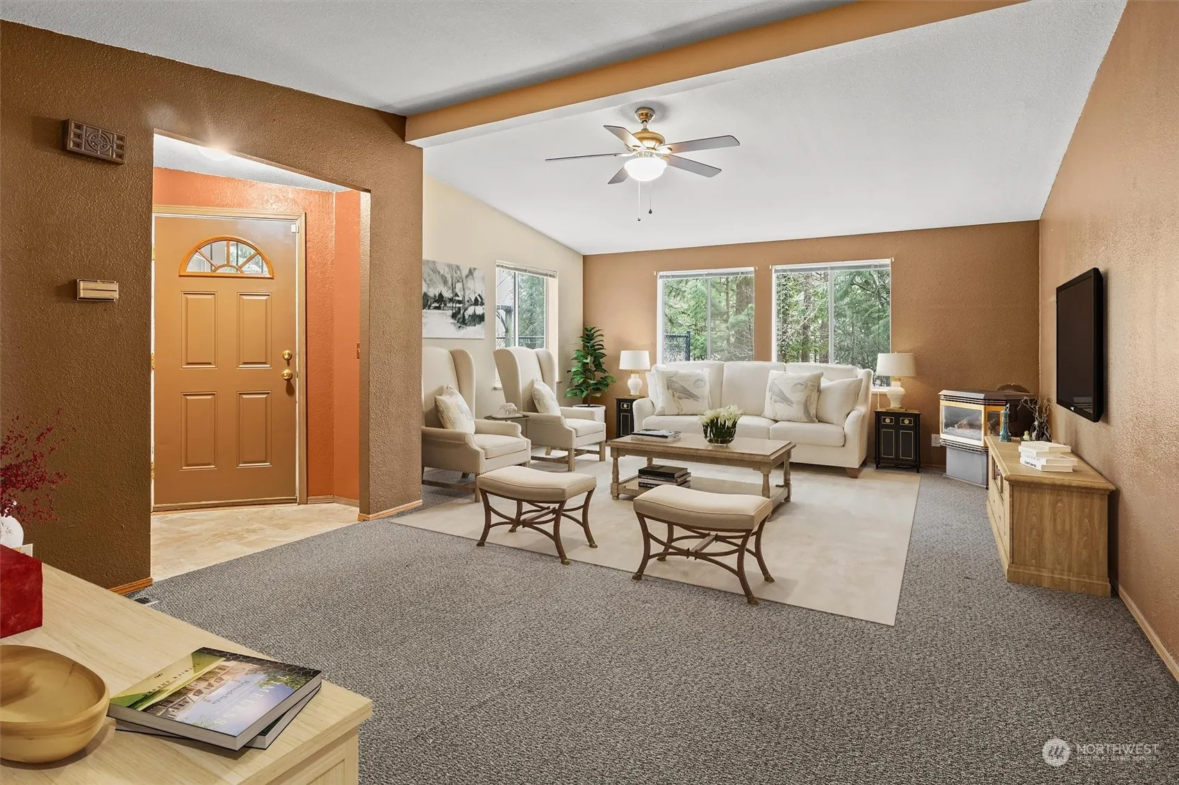 Welcome Home to this spacious 3 beds, 2.5 baths triple-wide home w/ over 1700 sqft. Enjoy the cozy fireplace & scenic views. The large kitchen has TONS of natural light, eating nook, & lots of cabinets/storage. Primary bedroom large enough for 2 king beds! Primary 5 piece Bath features large soaker tub. Outside you will enjoy an oversized heated 2 bay detached garage/shop, partially fenced yard, fruit trees, garden space, sidewalk & wheelchair ramp. Generous corner lot, backing to a greenbelt for added privacy!