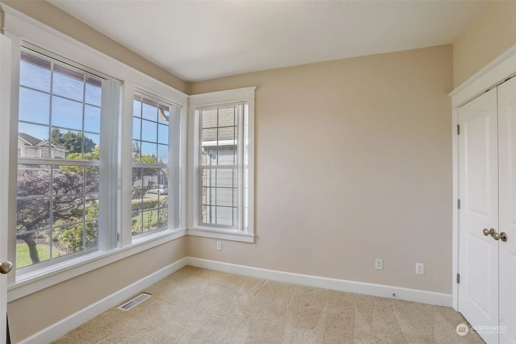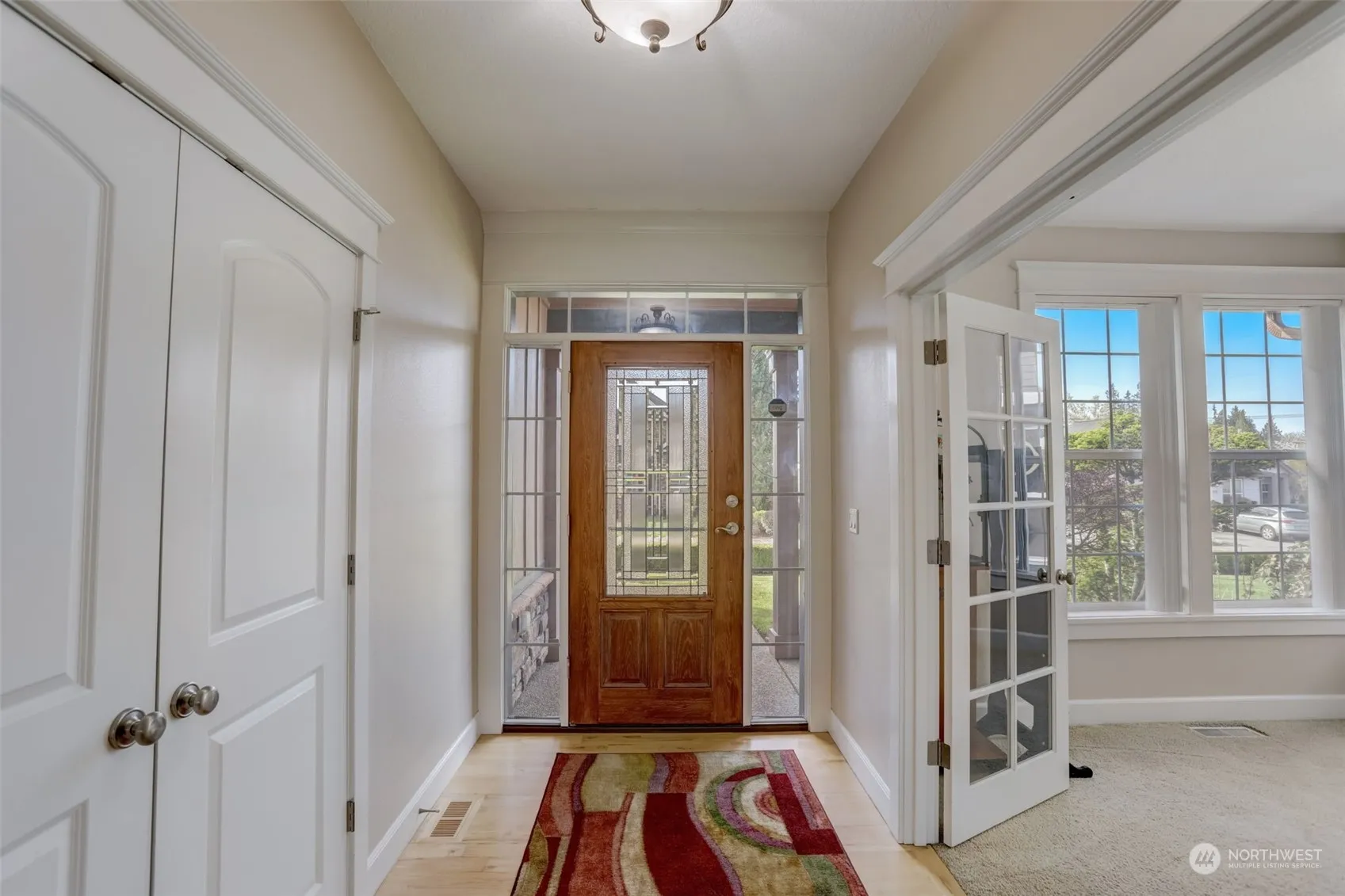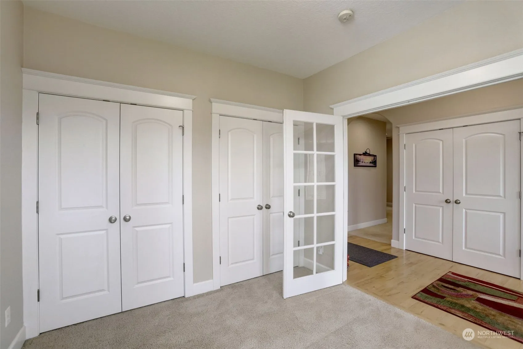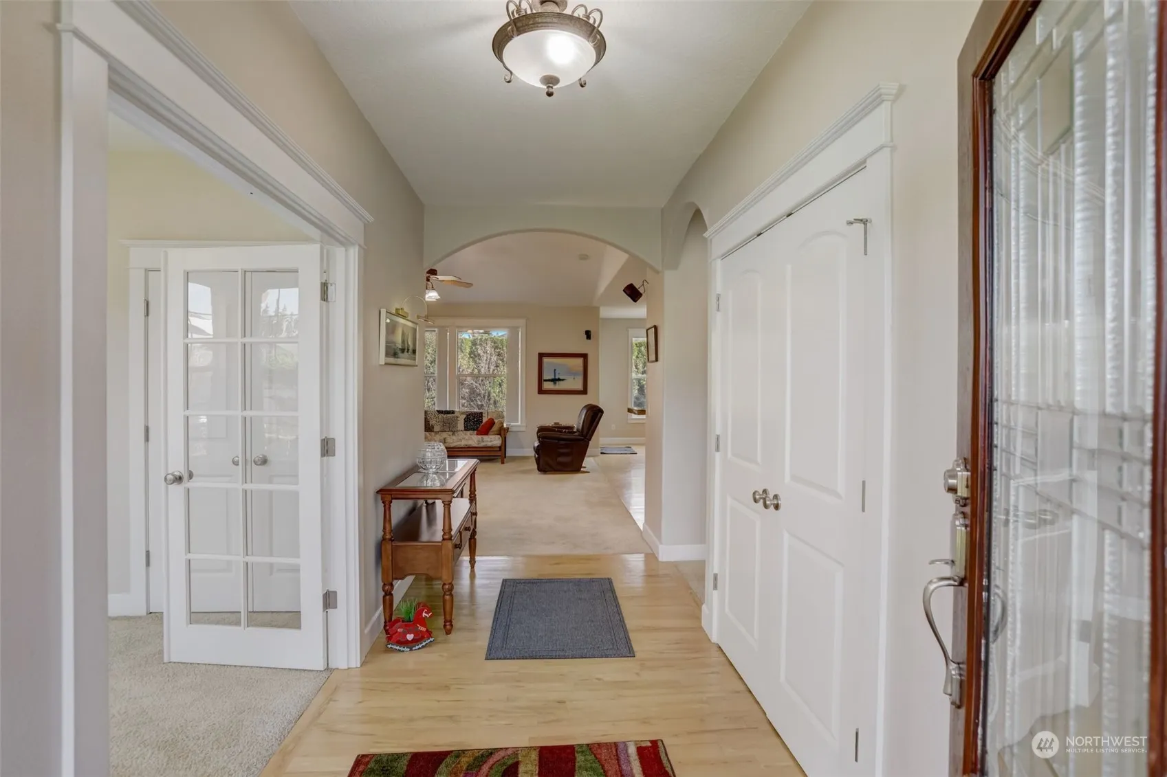 This inviting home boasts a spacious great room family room with gas fireplace, mounted TV and speakers. Cathedral-style vaulted ceiling adds openness. Gourmet stainless kitchen, granite tile counters, built-in pantry and recessed lighting. Dining area provides access to patio. Primary en-suite offers walk-in closet, dual sink vanity, jet tub and shower. Additional bedrooms, den/office and laundry offer versatility. French doors lead to den/office with dual closets. The interior boasts exquisite millwork, hardwood floors, carpet and tile. All appliances remain. Outside, enjoy the covered front porch, patio, and landscaped yard with accent lighting and sprinklers. The 3-car tandem garage provides ample storage with built-ins and man door.