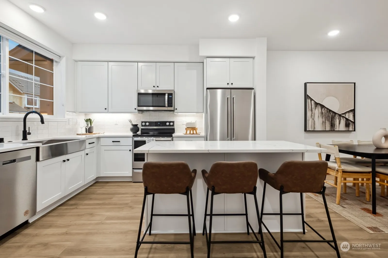 Timberstone townhomes at the base of Mt.Si along the Snoqualmie Valley Trail. Homesite 602- first level spacious bedroom with ¾ bath perfect for guests or home office space, 1-car garage with large driveway Covered deck to enjoy the views. Main floor w/ 9’ ceilings spacious great room & kitchen w/ designer finishes including crisp white cabinetry, quartz throughout, farmhouse sink, Whirlpool appliances, laminate wood flooring, wrapped windows & cooling w/ ductless mini split heat pump. Upstairs a primary suite w/ walk in closet & attached bath w/ dual sinks. two secondary bedroom + full bath. Enjoy panoramic mountain views from oversized deck. Site Registration policy-buyer broker must accompany & register buyer on 1st visit.
