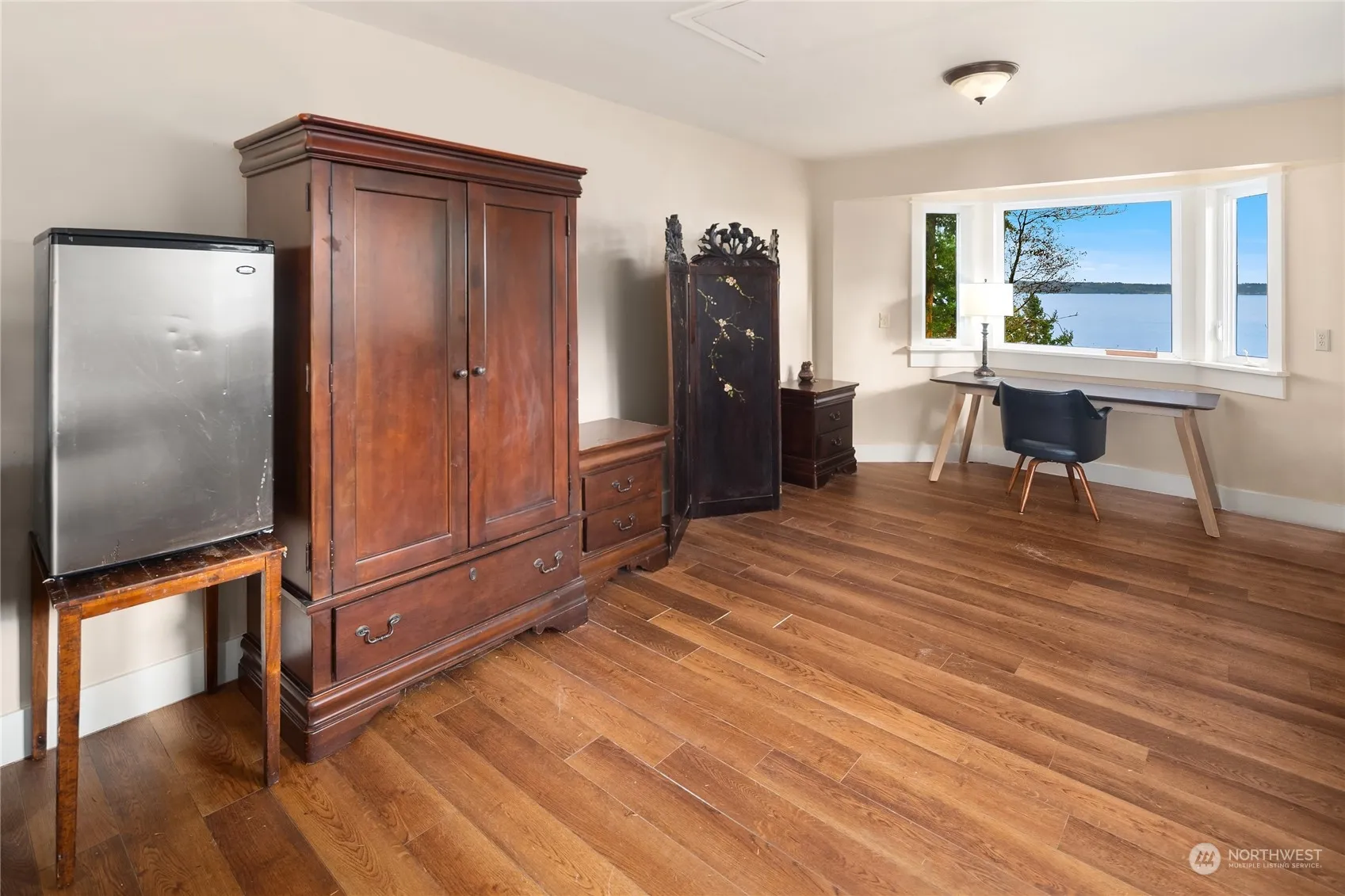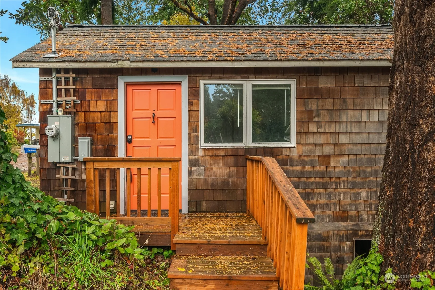 Cute 180 sq. foot shingled building perched over the shores of Puget Sound with beautiful views of city lights and Mt Rainer it could be a great addition to your self-contained camper van weekend. The building has a 200amp electrical panel, roof overhang wrapped side deck on the North side and lower front storage closet. The interior has outlets/switches & lighting, insulation, finished sheetrock, French door, double pane vinyl windows, luxury vinyl plank flooring, Comcast is available, small attic, tiny fridge and water cooler. This is not a building site; no drinking (potable) water is available thus no septic system possible and sadly no beach access from the parcel though public beach nearby.
