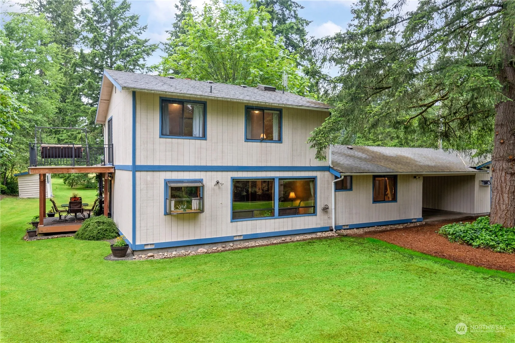 3+ acres of secluded privacy yet a 10 minute short distance to all of your amenities. Downstairs holds a living room with two over sized south facing windows displaying a massive back yard containing mature trees and a year around stream. Behind you shows a wood burning fireplace with an automatic fan. The kitchen contains hardwoods and stainless leading to the dining area that holds a table for eight. Relaxing evenings in the family room has a vaulted ceiling with a ceiling fan. The large primary bedroom includes a private bathroom and walk-in closet. Upstairs shows two bedrooms, 1 bathroom, office area as well as an open landing leading to a low maintenance deck. This house comes with a wired alarm, jetted tub, no water bills and no HOA.