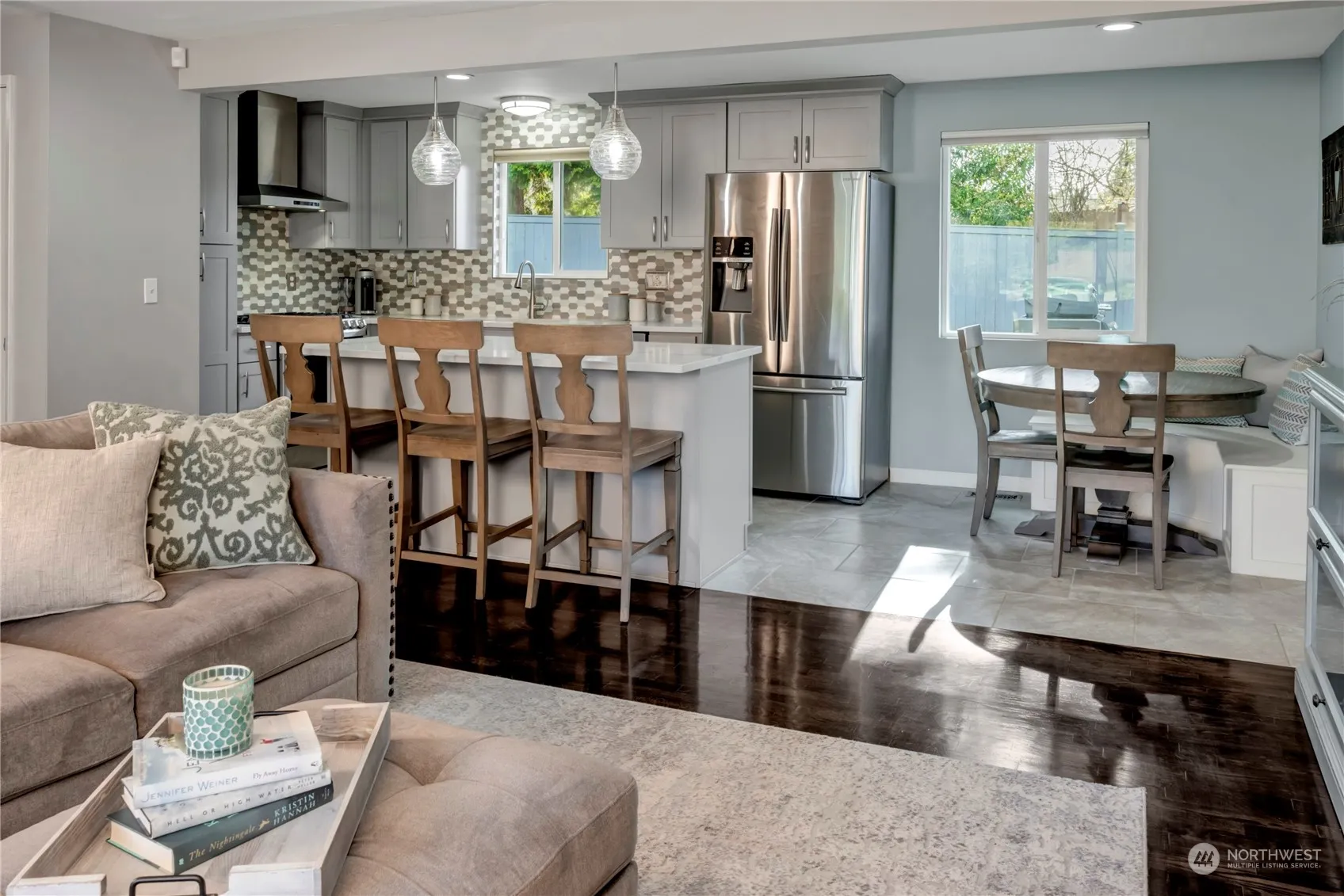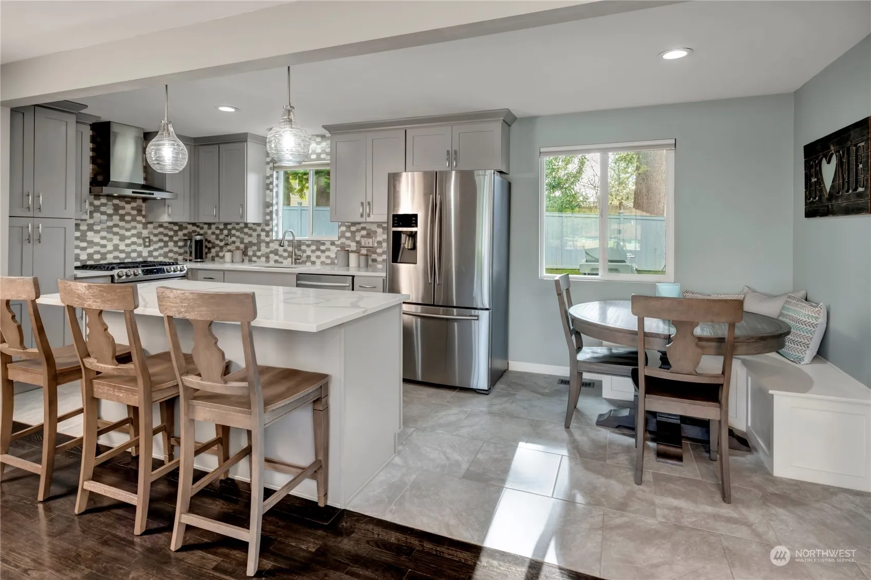 Welcome home to this remodeled Newcastle rambler. Rich hardwood floors greet you as you enter. A spacious living room with wood burning fireplace. The open kitchen features an island with quartz counters, stainless appliances, gas range and a built-in breakfast nook. Three bedrooms, including a primary with a gorgeous, remodeled walk-in shower with a custom tile surround. Rec room and office space. Extra-large one-car garage with plenty of storage. A large, flat, fully-fenced private backyard with a deck, hot tub and a custom treehouse. Fantastic Newcastle location, one house from Donegal park. Minutes to parks, trails and Lake Boren. Close to shops, restaurants, 405 and I-90. Hurry, this one won’t last.