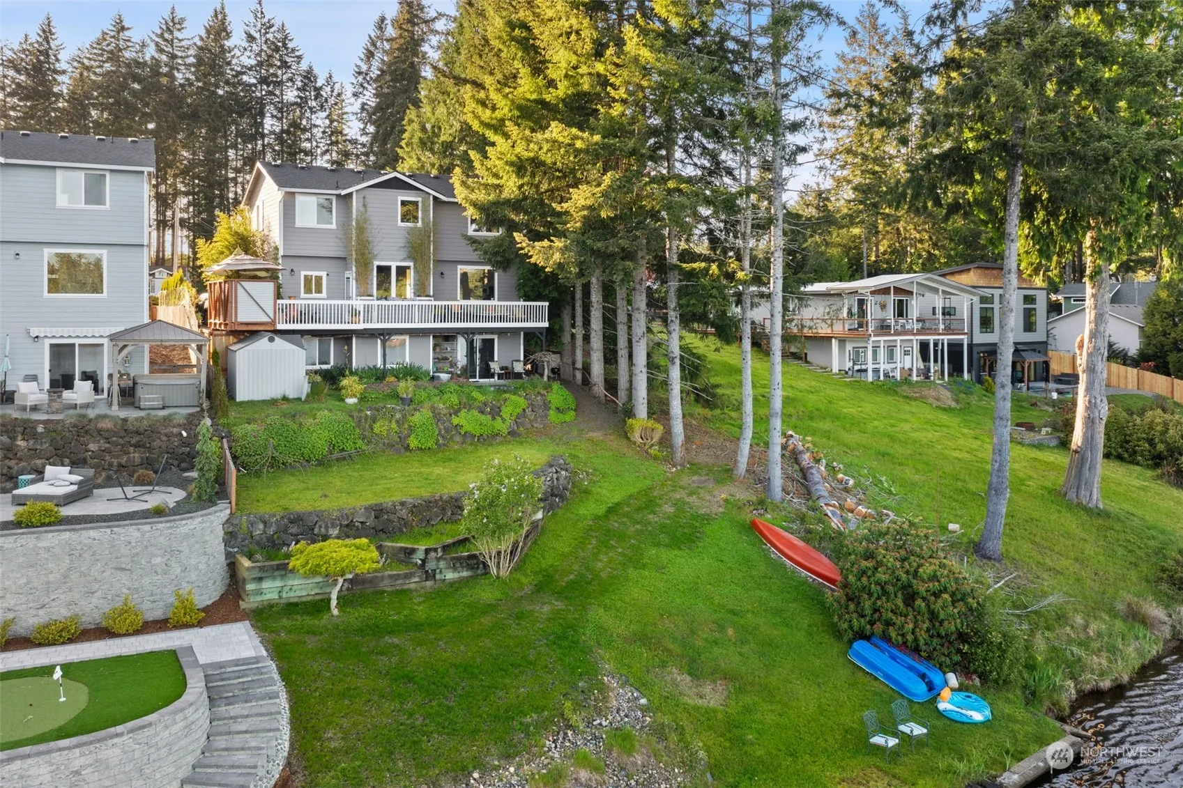 Nearly new 3 bedroom plus bonus room lake front home on Big Timberlake. Three finished floors of living with room for everyone. Serene outdoor living area with expansive view of the lake. Bunkhouse in back can be storage, shop, private office, and 2 sleeping lofts, Fully fenced back (street side) yard with quiet sitting area on the porch. Very low HOA fee, parks, swimming areas, boat launch, sport courts, playgrounds and community activities for all. Otter Island Swim Raft with Seats and Table. Up to $2500 loan discount from preferred lender. See attached document. Lakes stocked with multiple species and a saltwater access area with boat launch, dock and access to fishing a crabbing.
