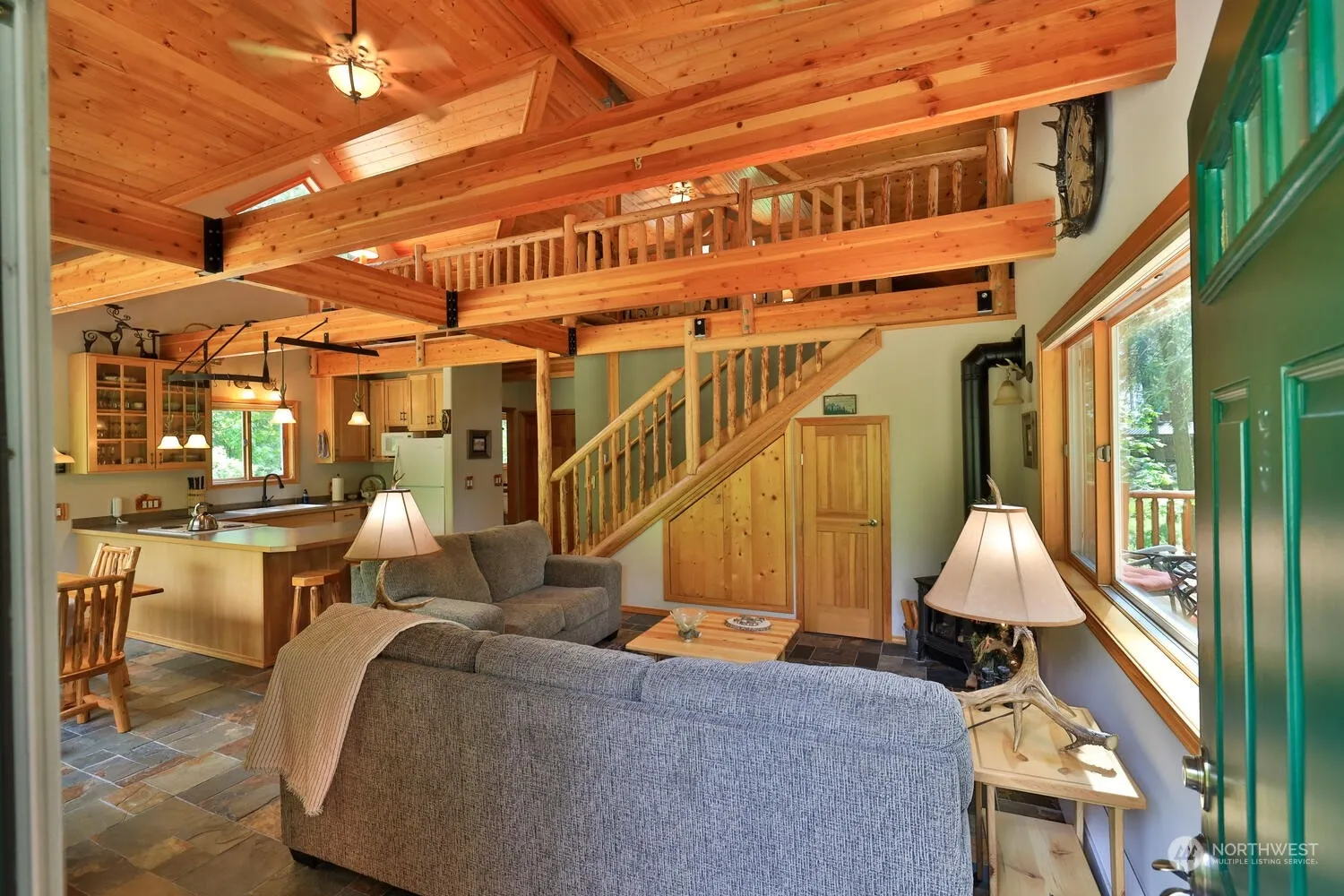 Antler Hideaway, a retreat off Mountain Home Road on 10.5 acres providing a serene & private haven. rustic charm, cedar shingle exterior, log railings, slate floors on a 2 level Timberframe-style cabin above a 2 car garage. 2 bedrooms & a well-appointed 3/4 bath with laundry & full kitchen. The open & airy design has timber frame accents & vaulted ceiling. The primary bedroom has a private balcony that leads to a secluded hot tub, offering a place to unwind. The large balcony, provides an expansive outdoor living space for gatherings or enjoying the outdoors.. Other amenities include a hen house adding a touch of rural charm & gardens for flowers or vegetables. The large meadow invites outdoor activities and wildlife.
