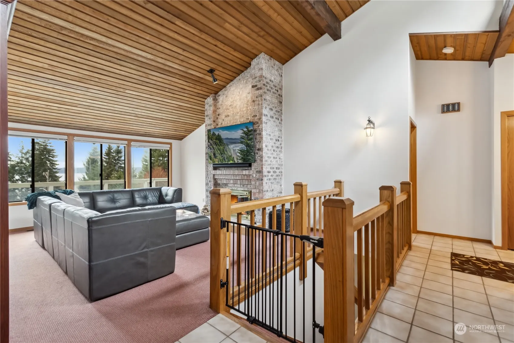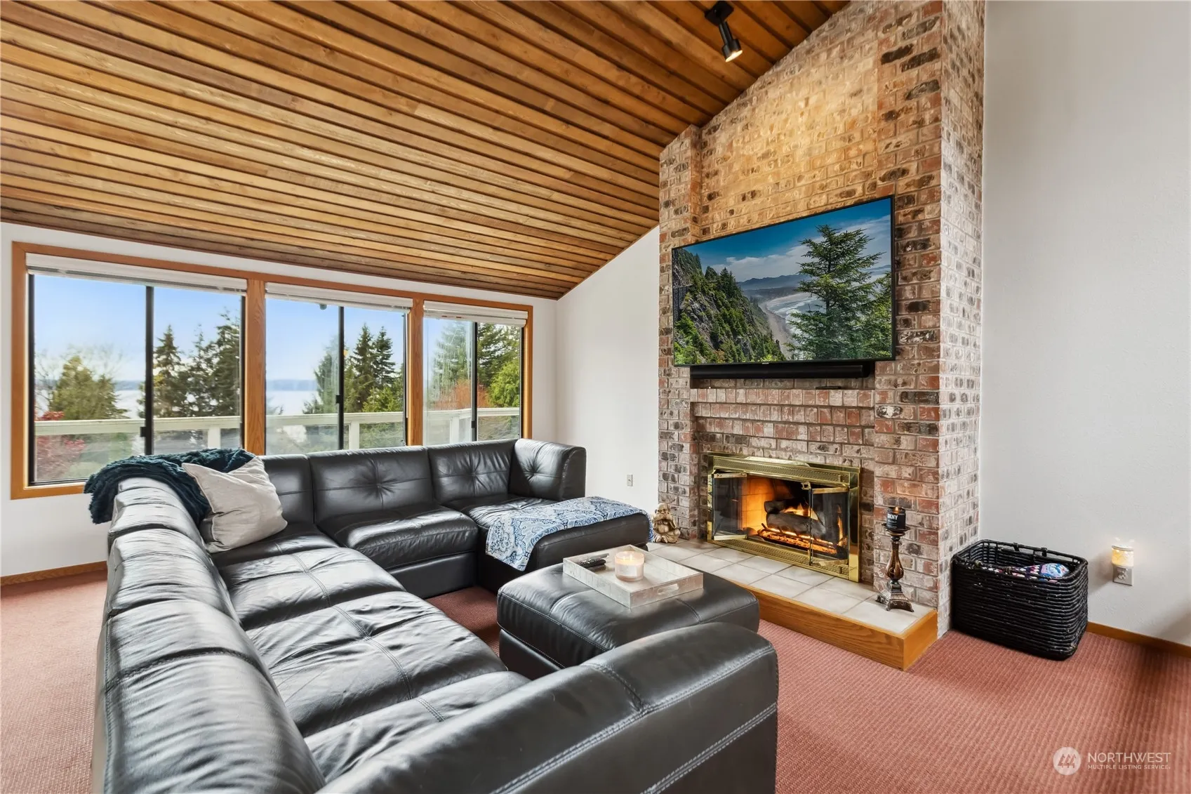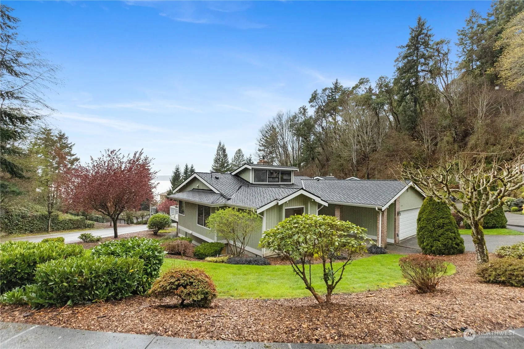 Nestled in the gated enclave of “The Bluffs”, this free-standing, largest, detached home in the community highlights beautiful westerly views of the Puget Sound. Cathedral ceilings & expansive windows bathe the interior in natural light, highlighting the brick fireplace that anchors the living room. The main floor primary suite offers a sanctuary w/ private bath & walk-in closet, complemented by direct access to a generous deck that spans the home’s length. Versatile lower-level w/spacious bonus room, cozy gas fireplace, wet bar, and access to a covered patio could be converted to additional private living area w/no-step, private entry, & adjacent to visitor parking. Convenience of an HOA ensures meticulous landscaping & exterior upkeep.