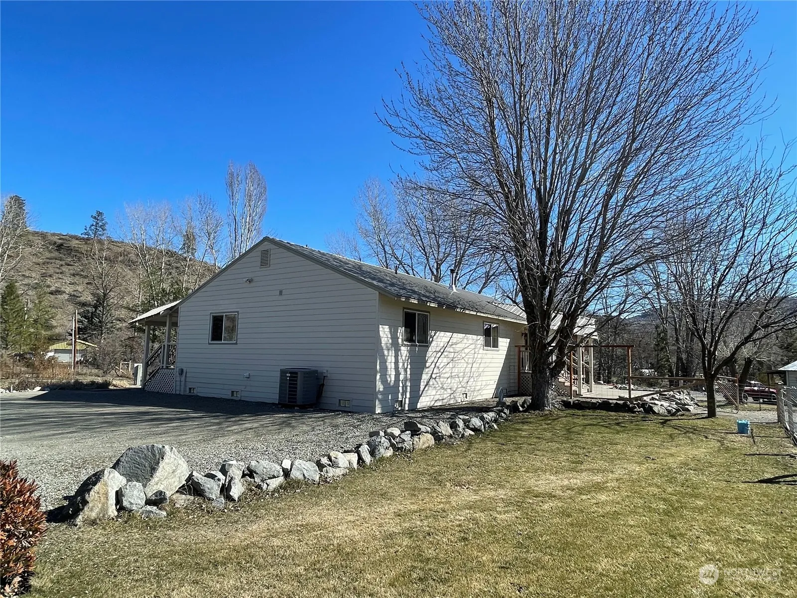 Okanogan/Malott custom home on approximately 1 1/2 Acres near Fox Mountain – Beautiful Views and the Sound of Loop Loop Creek – Home features 3 bedrooms/Bonus Room/2 Bathrooms, great room with large living room area including built-ins and wood stove, kitchen and dining area with breakfast bar, and French doors out to large covered back deck and patio. Custom all wood doors and cabinets throughout. Quartz countertops. Vaulted ceiling. Sauna in main bathroom. Bunk house with power and covered deck off slider. Additional storage shed and lean tos. Fenced area around house for pets. Large garden areas. Private well. Sweat lodge sauna in back yard works! $399,900 H-3224/MLS2211022