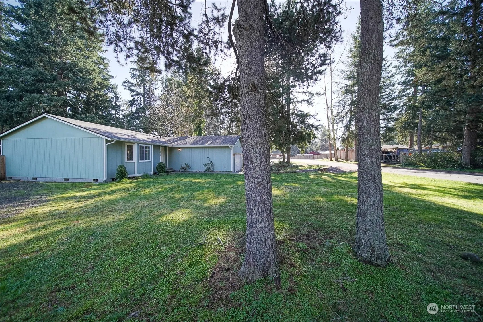 Corner lot home in Nisqually Pines. Big lawn in front and fenced back yard, with gate access to street. Bring in your boat! Dead end street with easy walk to the community parks swing sets, big toys, community pool. Step into a large great room with family room big enough for large sectionals plus entertainment center. Vaulted ceilings in family, dining and island kitchen with eating bar and plenty of cabinetry. Slider door from the dining to the large backyard. Laundry room passes into 2 car garage. Down the hall is common area full bathroom. Two bedrooms on the backyard side of the home and primary bedroom is on the front yard side of the home. Bedroom suite features a full bathroom. Home is in perfect condition and ready to move in.