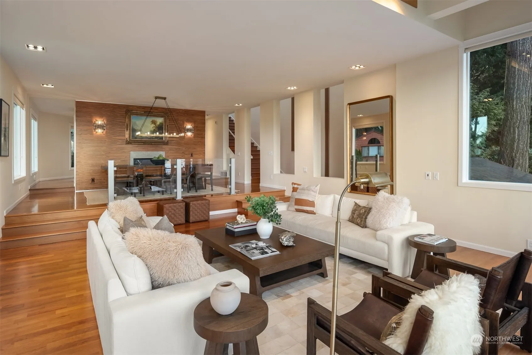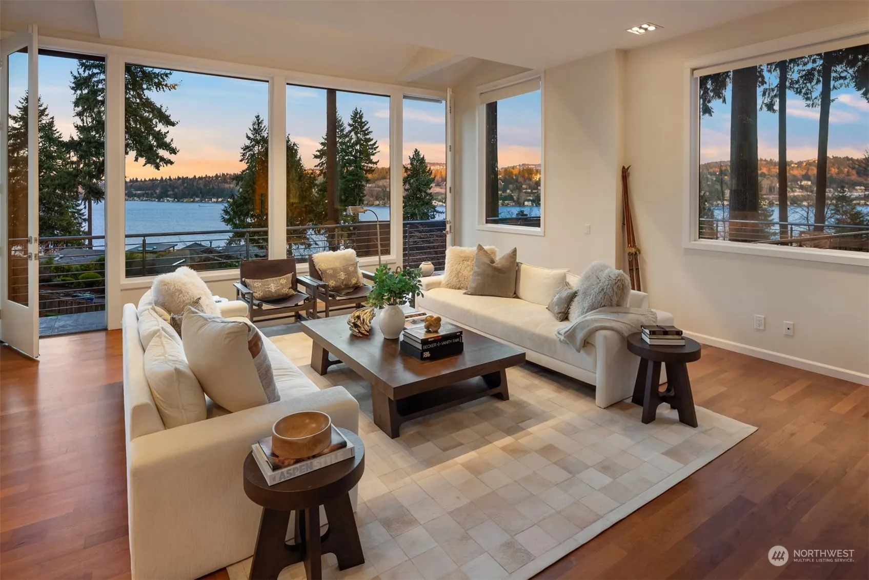 This Stuart Silk contemporary is perched in an idyllic setting & features gorgeous Lake Washington views. Bathed in light, the main living areas boast a clean, airy aesthetic w/floor-to-ceiling windows framing the lake. The beautifully curated dining room showcases a wood accent wall with fireplace. The kitchen (w/Miele espresso station), casual dining area, & family room are ideal for everyday living w/access to the fully fenced backyard & crowd favorite: turf! The view primary suite w/luxe bath offer a restful haven. Two addl bedrooms, bath & laundry on the upper level. A finished garage offers flex space for those working from home. Guest suite also on this level. Lush half-acre lot—plenty of room for gardening & play. EV charger, too!