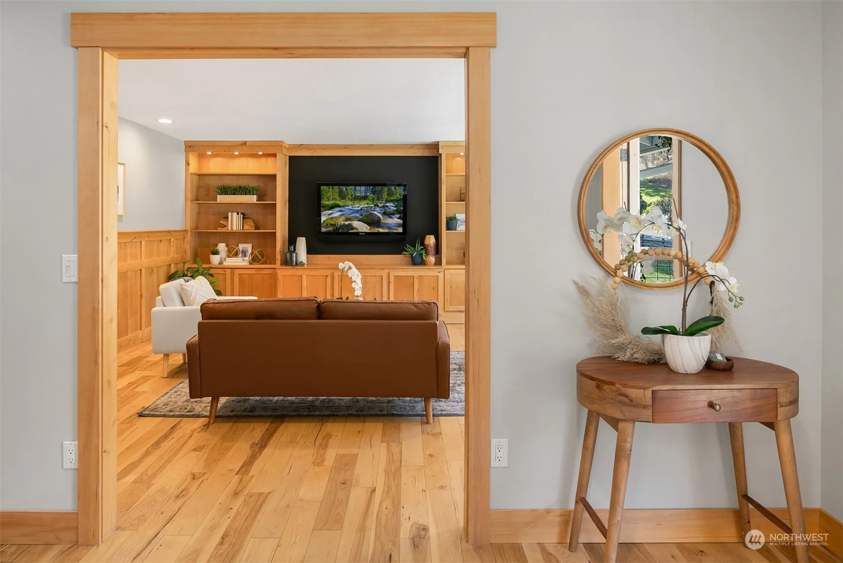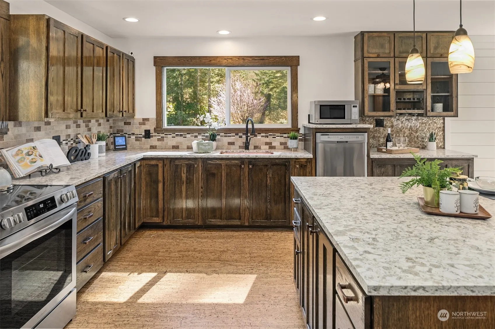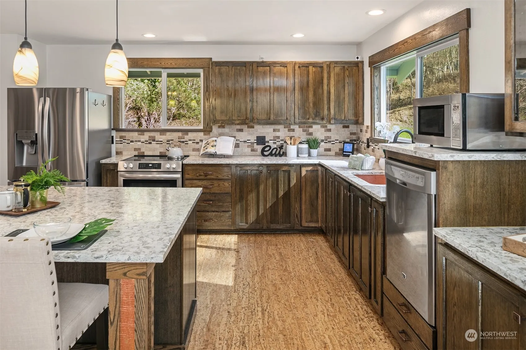Enjoy peaceful living surrounded by natural Mt beauty & the sound of the Creek in gated Edgewick Meadows. One level, thoughtfully updated living space above 5-car drive thru garage/shop/storage. The great rm has open kitchen w/newer custom cabinets, quartz counter w/tile backsplash, walk in pantry & lg center island w/eat-in bar & new pendant accent lighting. Cozy sitting area, freestanding propane FP, a built-in desk & lg dining area complete the rm. Living rm has floor-to-ceiling built-in shelving & cabinets. All baths feature new tile & fixtures & primary suite has fab custom closet. 3 yr roof. New ext entry door & range/2024. New ext paint, decks, frig, vinyl windows & hot wtr htr/2023. Access to John Wayne & SVT & 20 min to skiing.