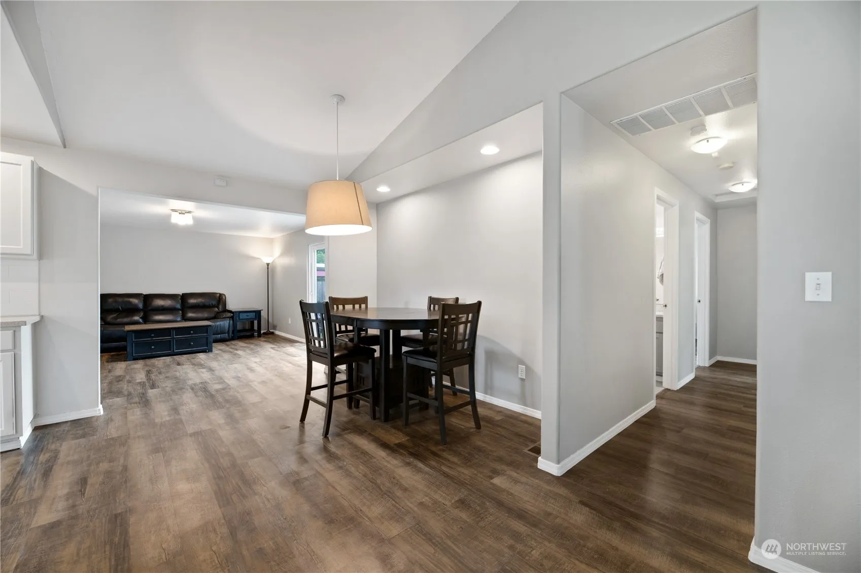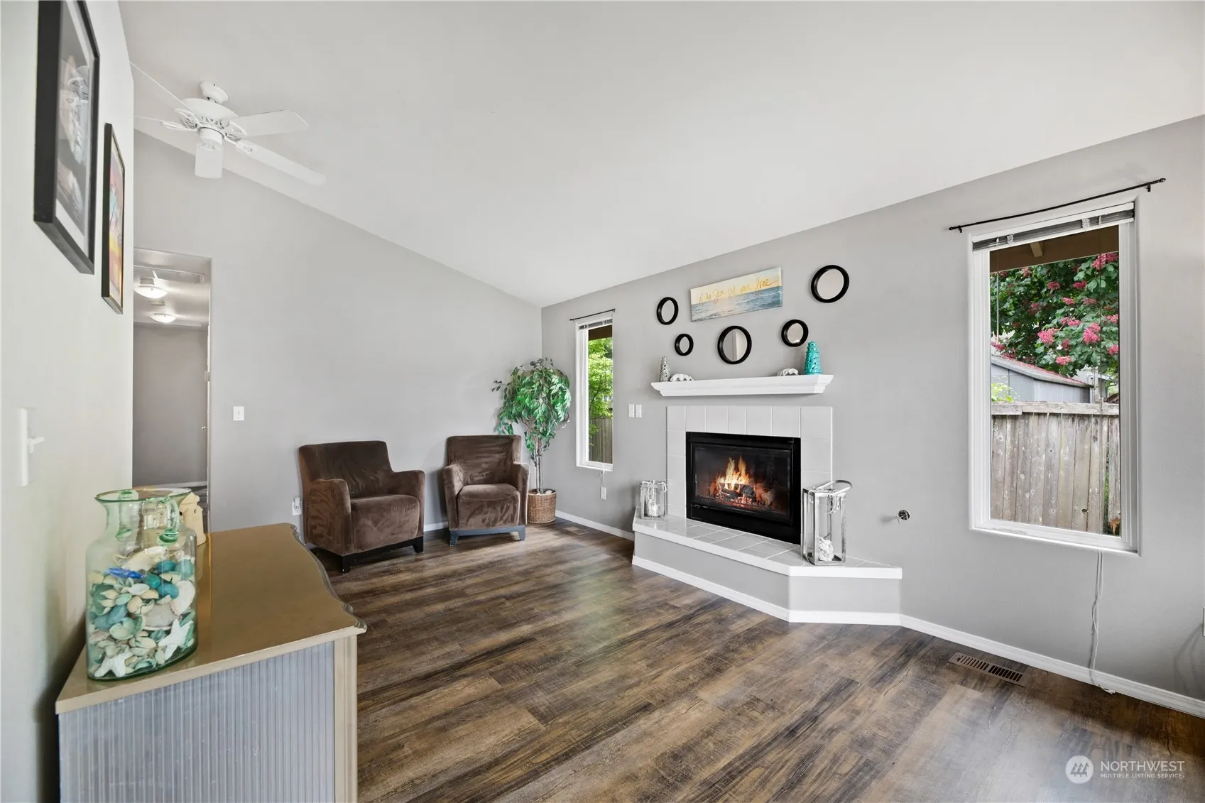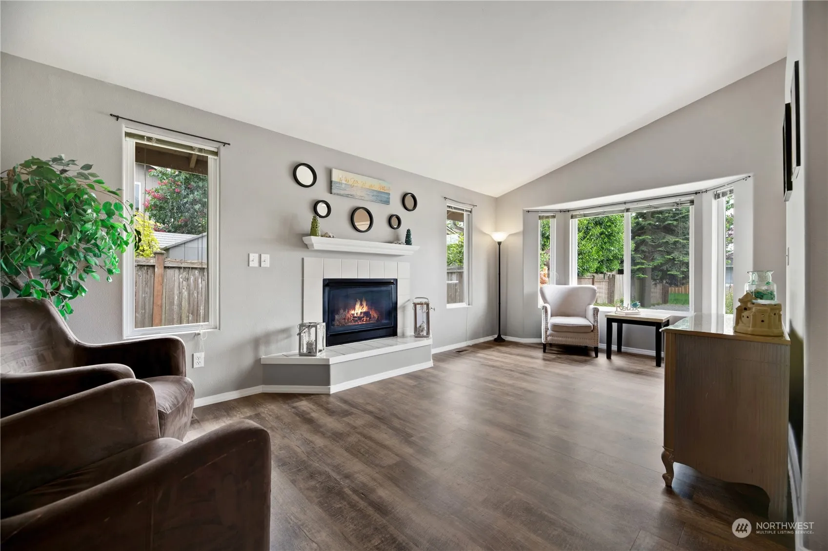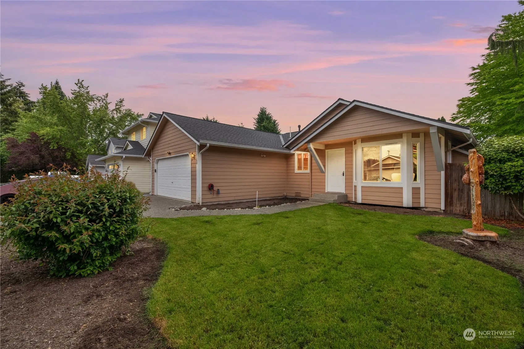 Welcome to this meticulously maintained rambler, offering spacious and inviting living spaces sure to delight. Step inside to discover a generously sized living room featuring vaulted ceilings and a delightful bay window, flooding the area with natural light and complemented by a warm gas fireplace. The kitchen seamlessly flows into an expansive dining area and cozy family room, perfect for daily living and entertaining. Retreat to the primary bedroom with its own attached en suite bath, alongside two additional bedrooms and another full bath. Outside, the fully fenced backyard boasts easy upkeep and a sizable concrete patio, ideal for outdoor enjoyment. Just minutes to shopping, dining, parks, and quick access to SR 522.